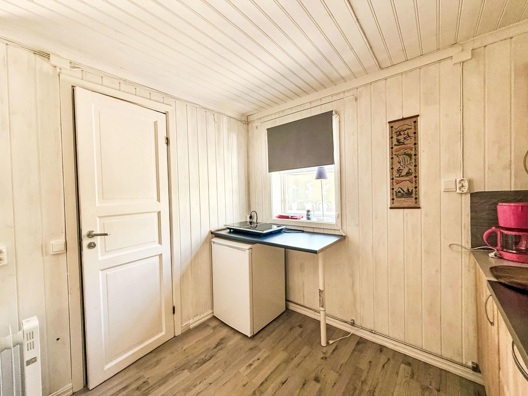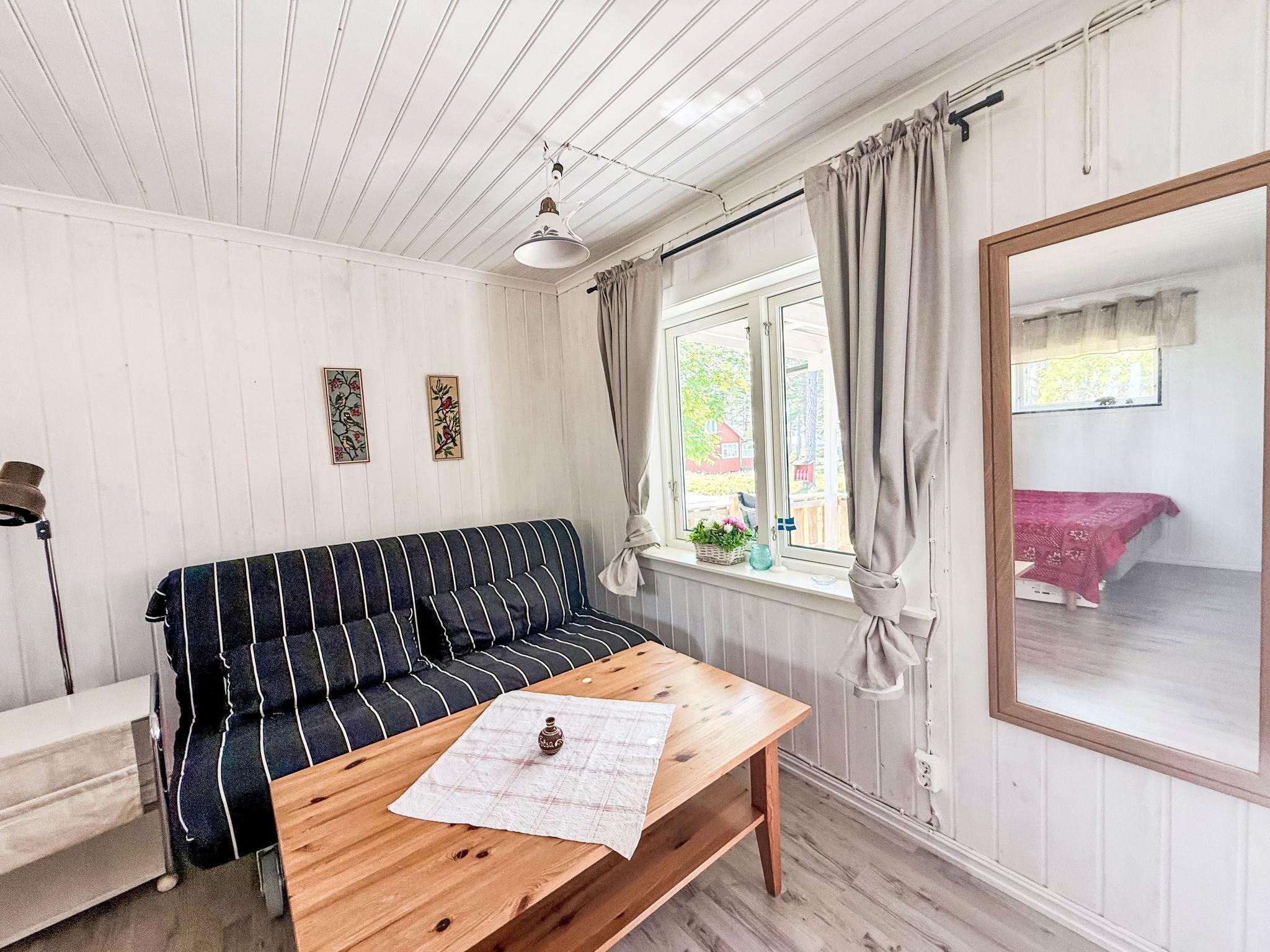 "Lugnet", 1-Zimmer-Haus 40 m2. Zweckmässig und komfortabel eingerichtet: offenes Wohn-/Esszimmer mit 1 Doppeldiwanbett (160 cm, Länge 200 cm), 1 Doppelbett (2 x 90 cm, Länge 200 cm). Wohnküche (2 Kochplatten, Toaster, Wasserkocher, Mikrowelle, elektrische Kaffeemaschine). Dusche, Trockentoilette. E-Heizung. Parkettboden. Kleine Terrasse. Sitzplatz. Sehr schöne Fernsicht auf das Meer und den Wald. Bitte beachten: Nichtraucher-Haus. Rauchmelder, Feuerlöscher.