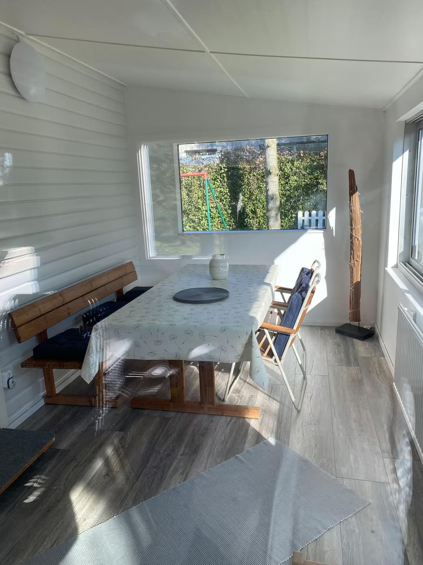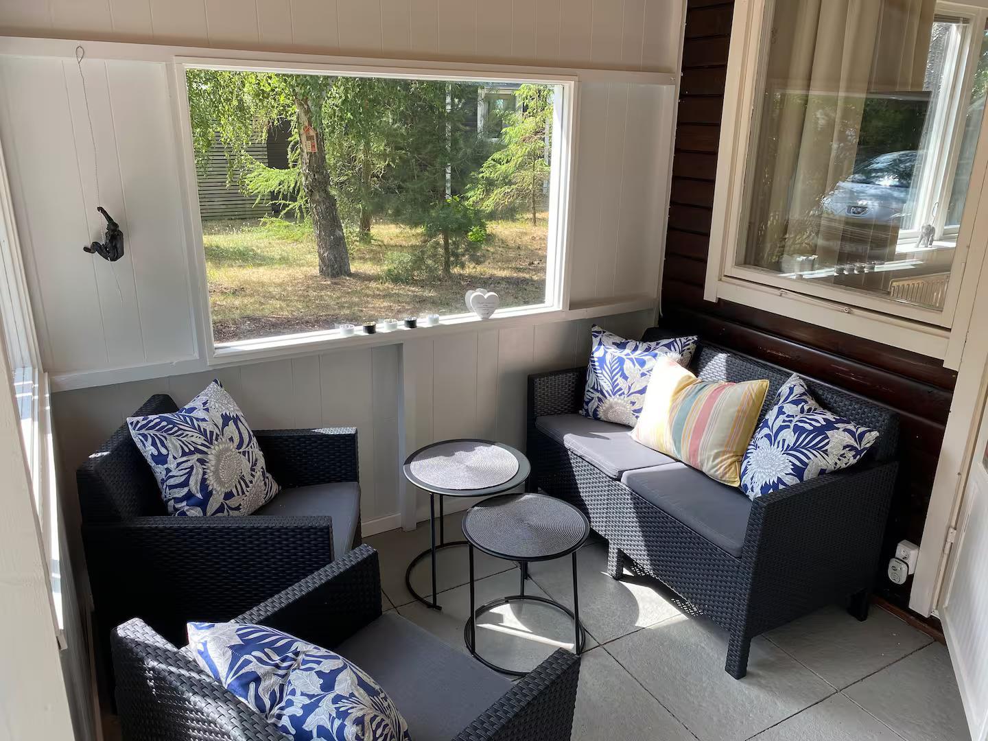 Im Wohnzimmer gibt es einen Fernseher mit kostenlosen schwedischen Kanälen und eine schöne glasüberdachte Veranda mit Essbereich für die ganze Gesellschaft.