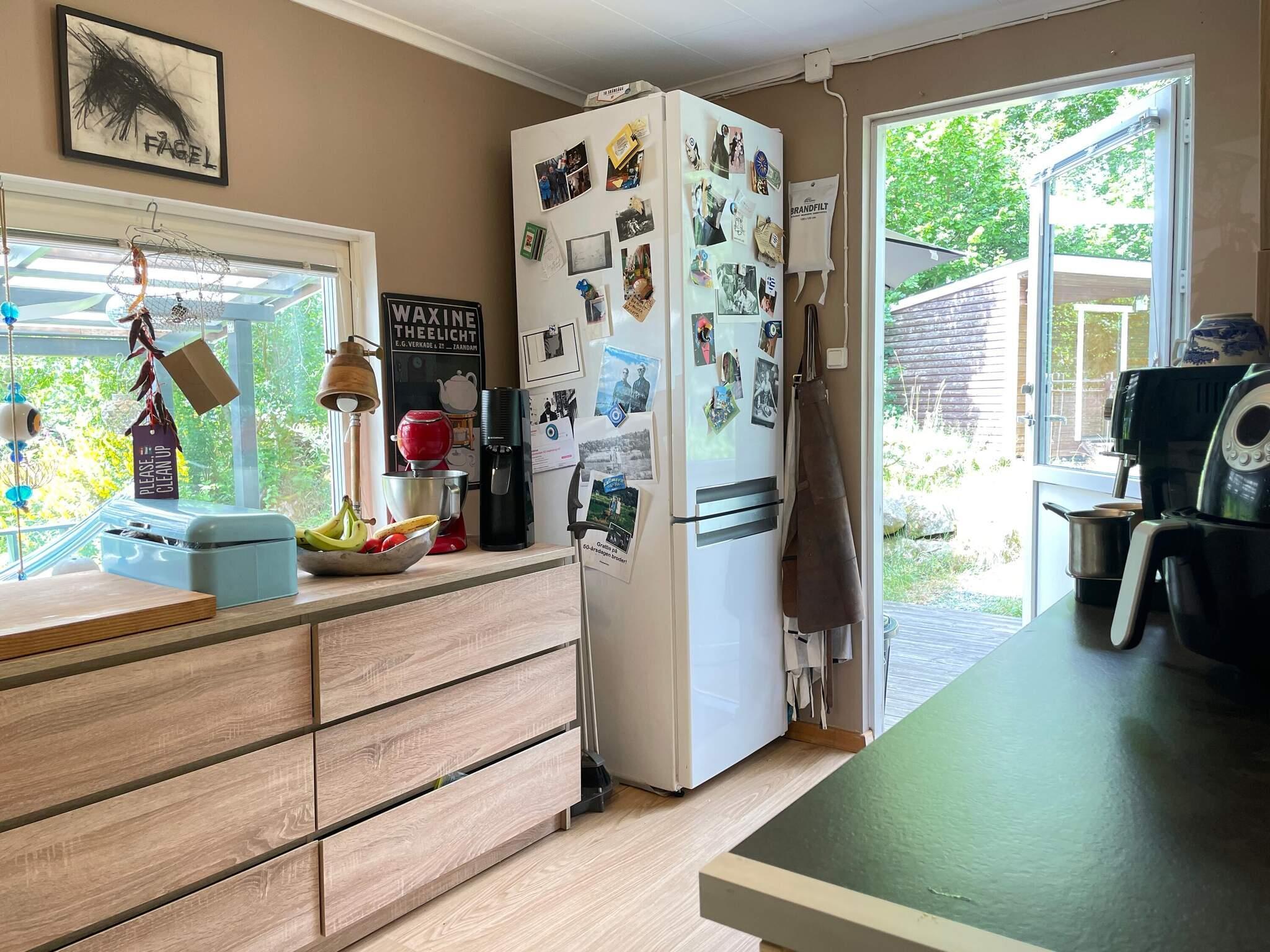 WC und Dusche befinden sich in zwei separaten Räumen für zusätzlichen Komfort. Die Küche ist bestens ausgestattet und geräumig genug, um problemlos alles vom Frühstück bis zum Abendessen zuzubereiten. Und wenn das Essen fertig ist, gelangen Sie durch die Terrassentüren direkt auf die große Holzterrasse. Hier gibt es viel Platz zum Essen, Entspannen unter dem überdachten Bereich bei einem Sommerregen oder einfach nur zum Abschalten und Genießen der Ruhe. Abends können Sie den Holzkohlegrill anheizen und unter freiem Himmel etwas Leckeres zubereiten. Die Atmosphäre ist unkonventionell und entspannt – der perfekte Ort, um durchzuatmen, zur Ruhe zu kommen und einfach zu sein.