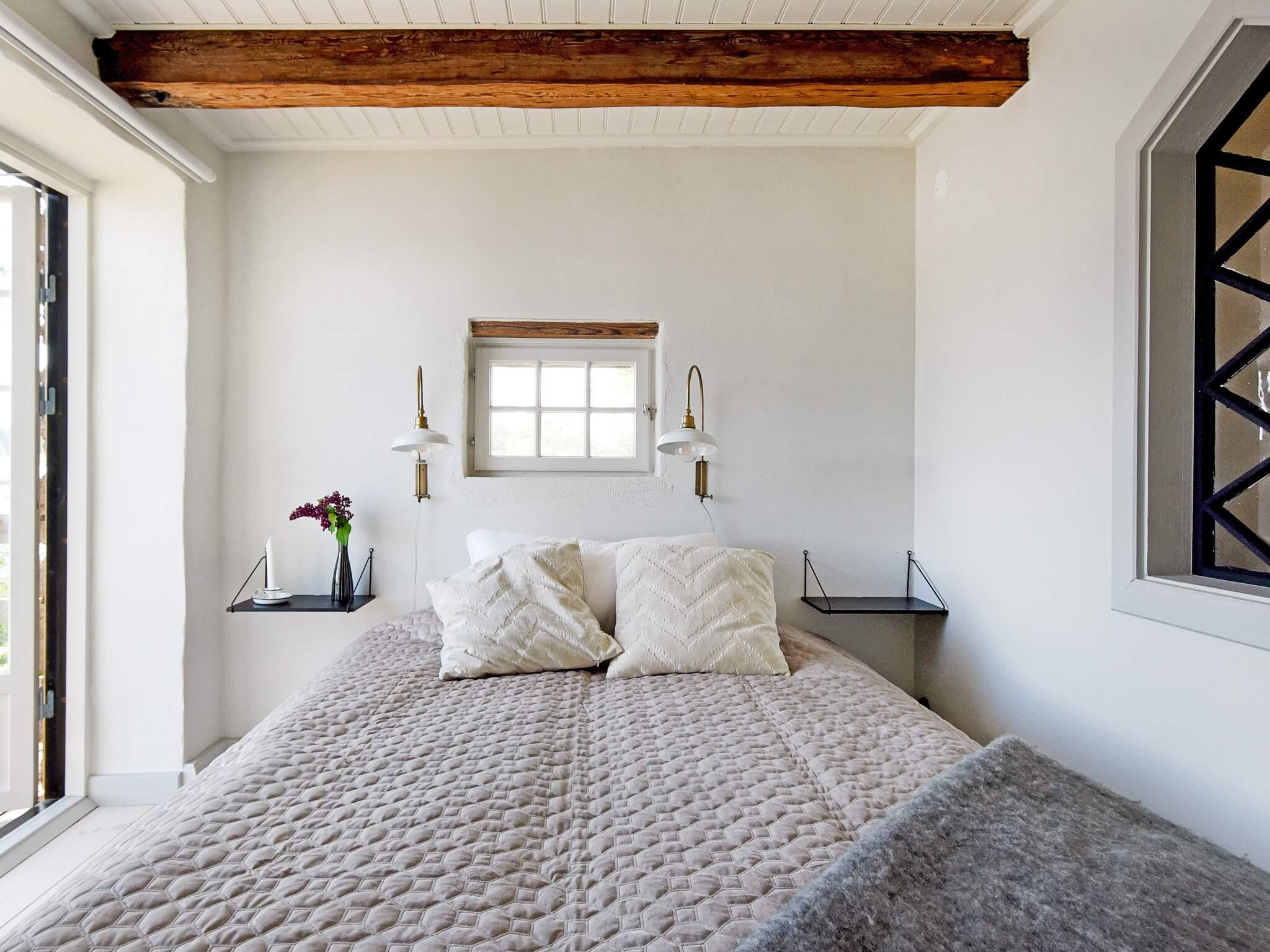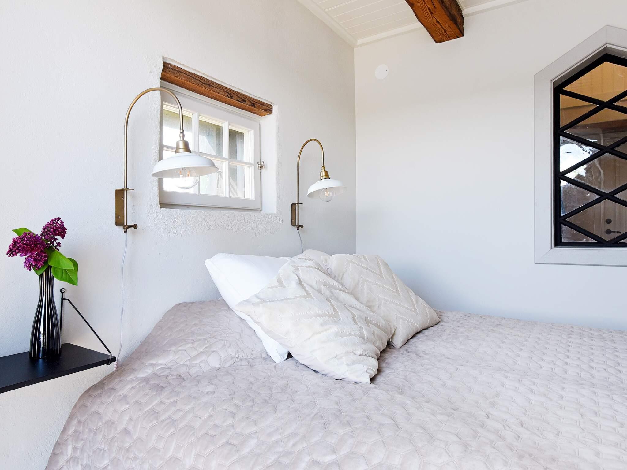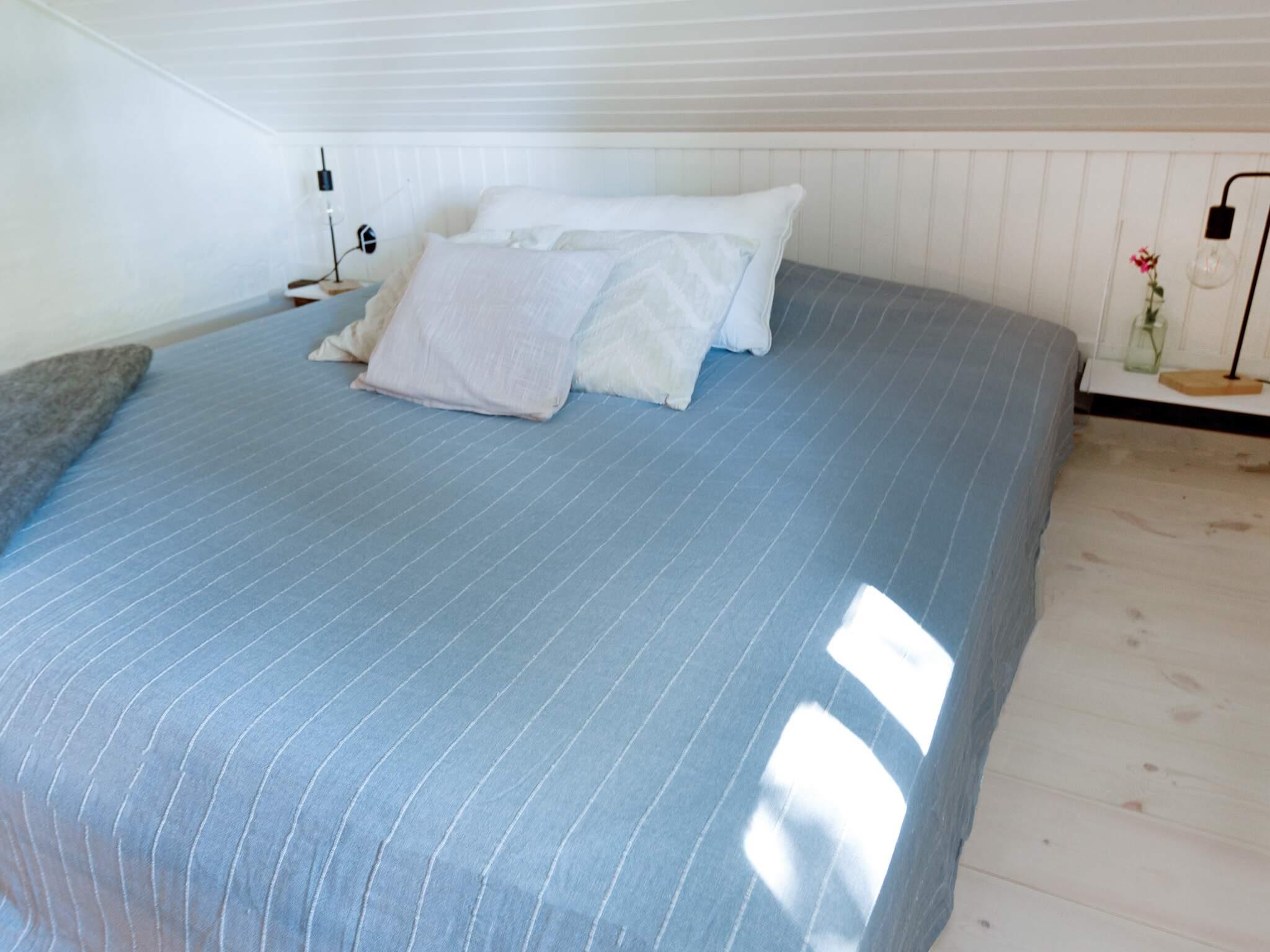 Geradeaus vom Flur führt eine steile Leiter hinauf zum ersten Schlafboden (Hems) des Hauses mit Schlafgelegenheit für 2 Personen. Neben der Küche – mit eigenem Ausgang zum Steg und zum Balkon – befindet sich das zweite Schlafzimmer des Hauses mit einem 160 cm breiten Doppelbett. Vom Küchenbereich führt eine Leitertreppe hinauf zum zweiten Schlafboden des Hauses mit zwei weiteren Betten. Beide Treppen sind etwas steil, seien Sie also vorsichtig, wenn Sie Kleinkinder dabei haben. Die Treppen eignen sich nicht gut bei körperlichen Einschränkungen.