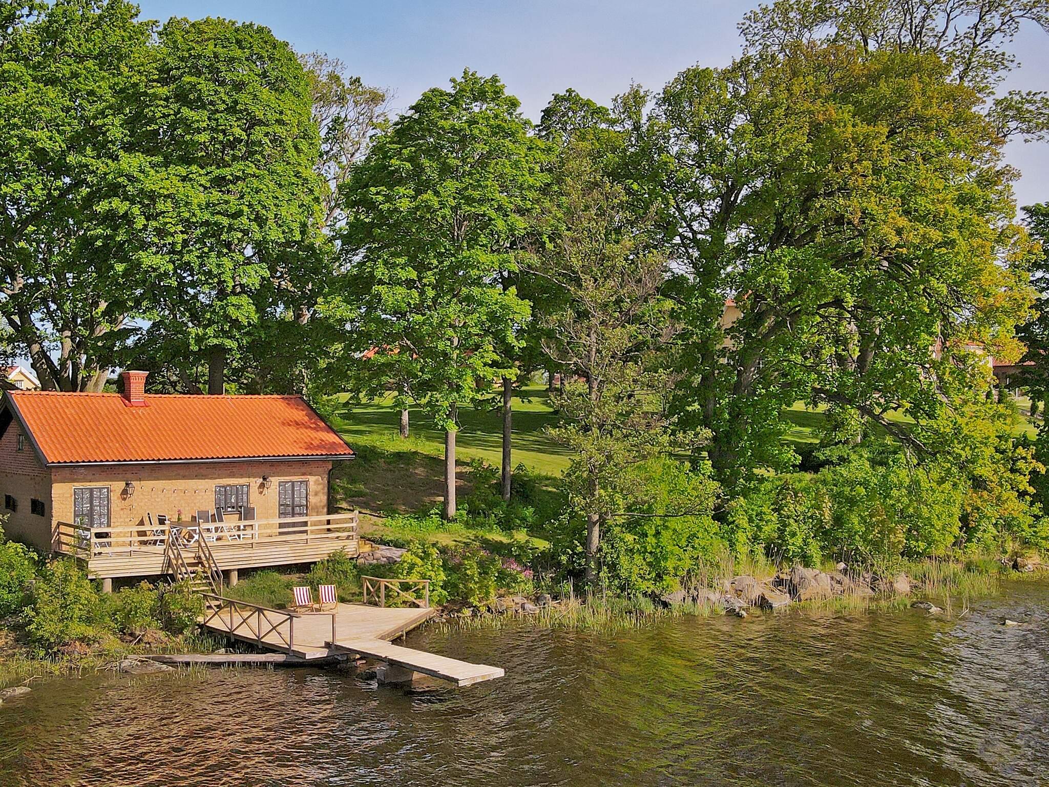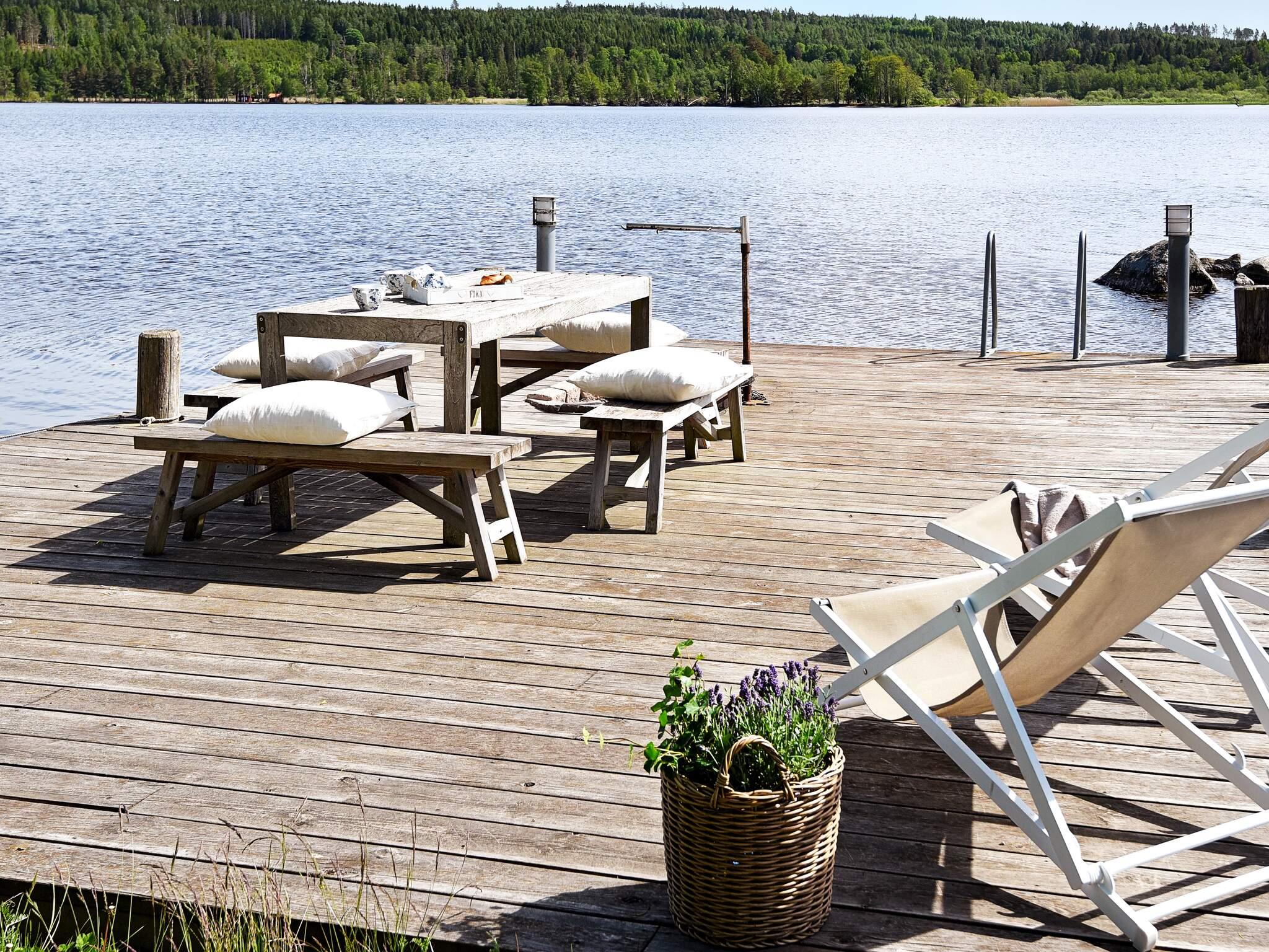 Terrasse und privater Steg unten am Seeufer. Näher und schöner am Wasser geht es kaum. Das Ferienhaus ist Teil des historischen Herrenhofes Gudhammars Herrgård mit mehreren Häusern und einer alten Mühle. Dieses Haus heißt Brygghuset.