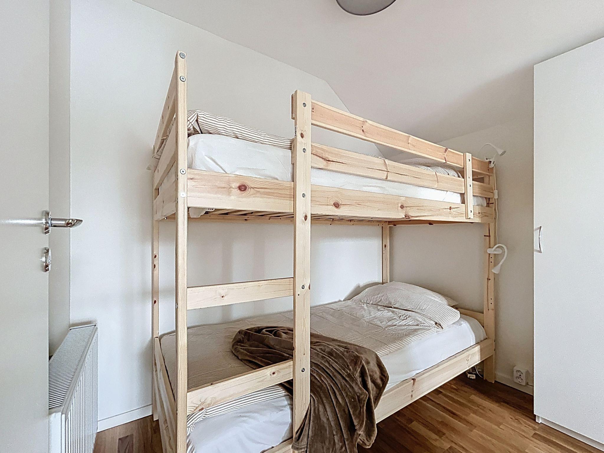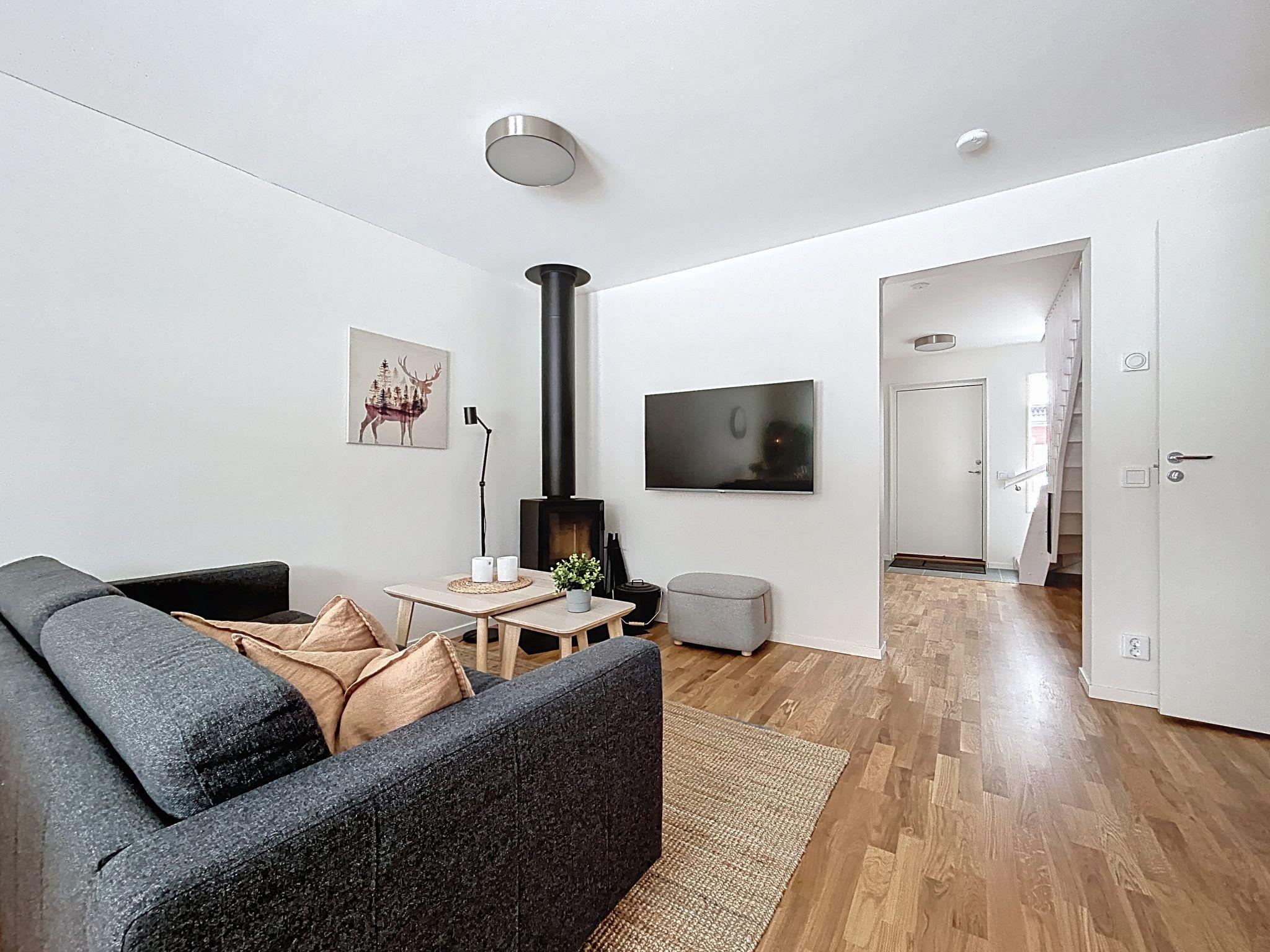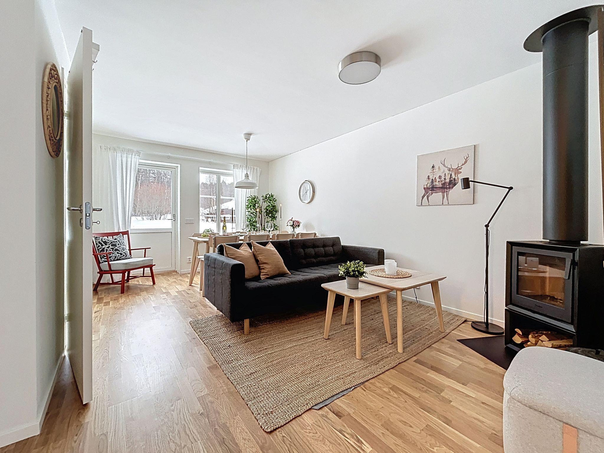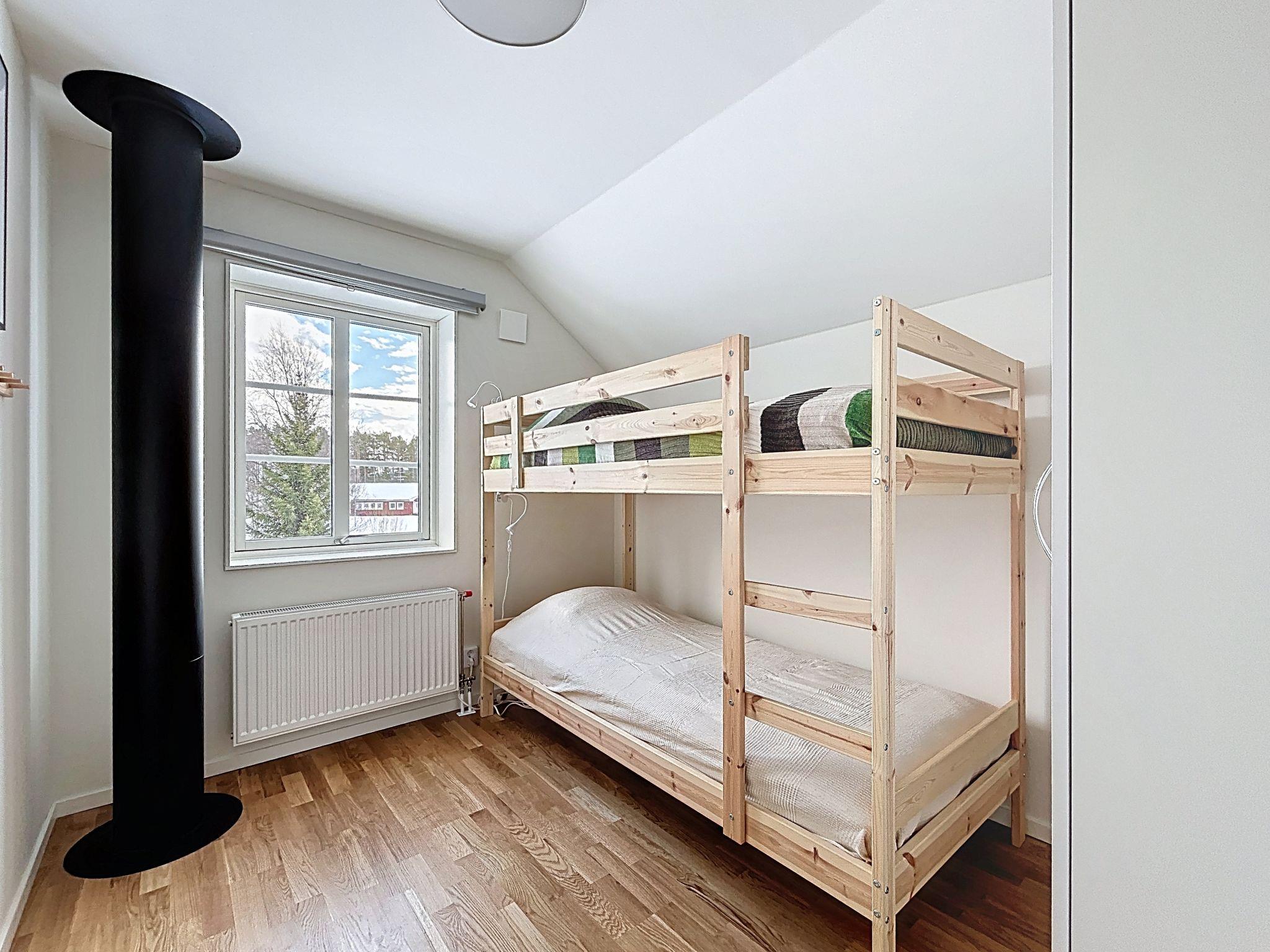 "Östra Svanhågna Gård", 4-Zimmer-Wohnung 87 m2 auf 2 Stockwerken. Einfach und modern eingerichtet: offenes Wohn-/Esszimmer mit Schwedenofen, Esstisch und TV. Ausgang zur Veranda. 1 Zimmer mit 1 Doppelbett (180 cm, Länge 200 cm). Küche (Backofen, Geschirrspüler, 4 Induktionskochplatten, Toaster, Wasserkocher, Mikrowelle, Tiefkühler, elektrische Kaffeemaschine). Dusche/WC, Sauna. Heizung, Holzheizung. Obergeschoss: 1 Zimmer mit 1 x 2 Etagenbetten (90 cm, Länge 200 cm). 1 Zimmer mit 1 x 2 Etagenbetten (90 cm, Länge 200 cm), 1 Doppelbett (180 cm, Länge 200 cm). Dusche/WC. Parkettboden. Terrasse 20 m2. Sitzplatz. Eingeschränkte auf den See, die Berge und das Tal. Zur Verfügung: Waschmaschine, Wäschetrockner, Kinderhochstuhl, Babybett. Internet (WLAN, gratis). Bitte beachten: Nichtraucher-Haus. Rauchmelder.