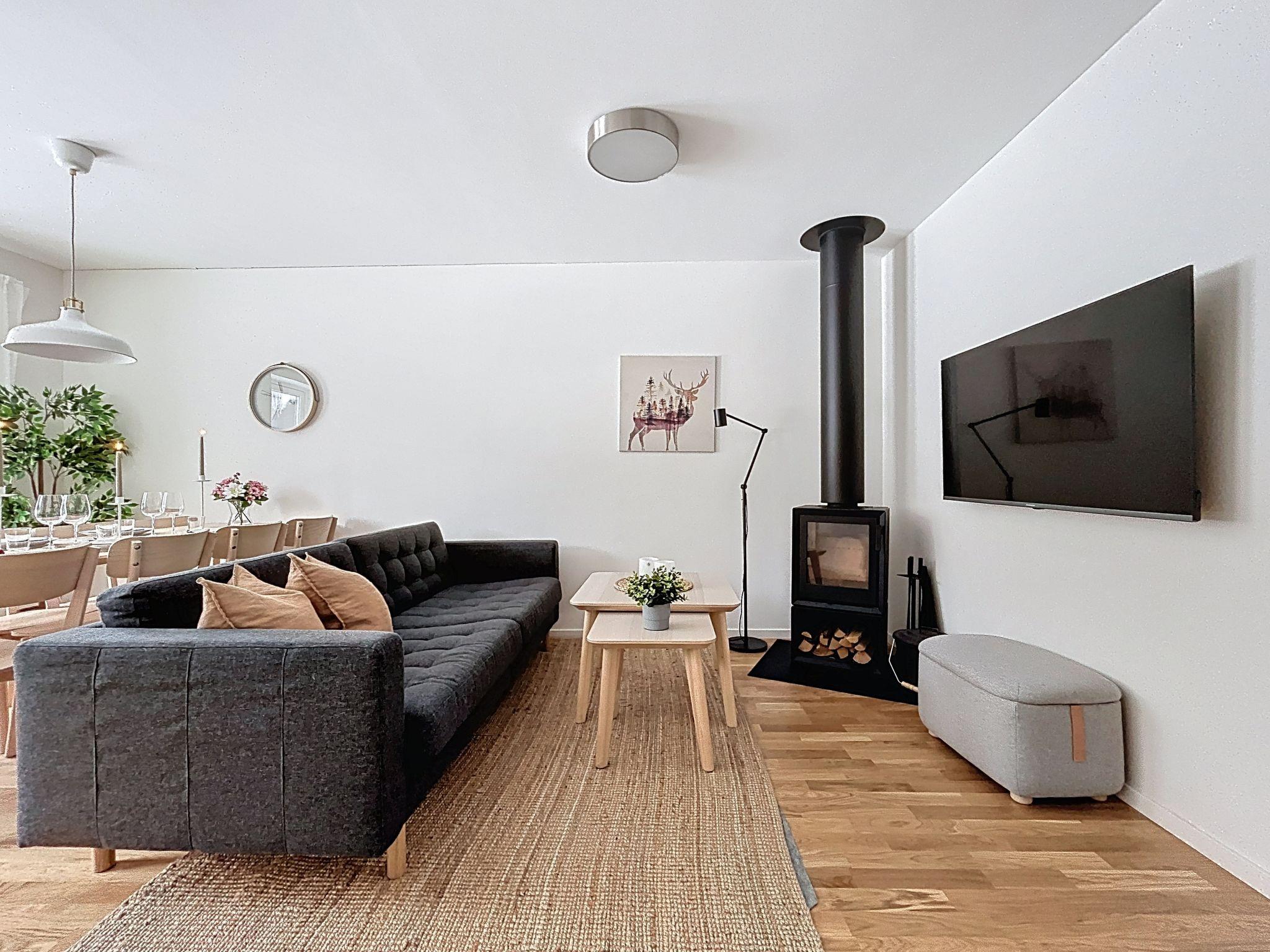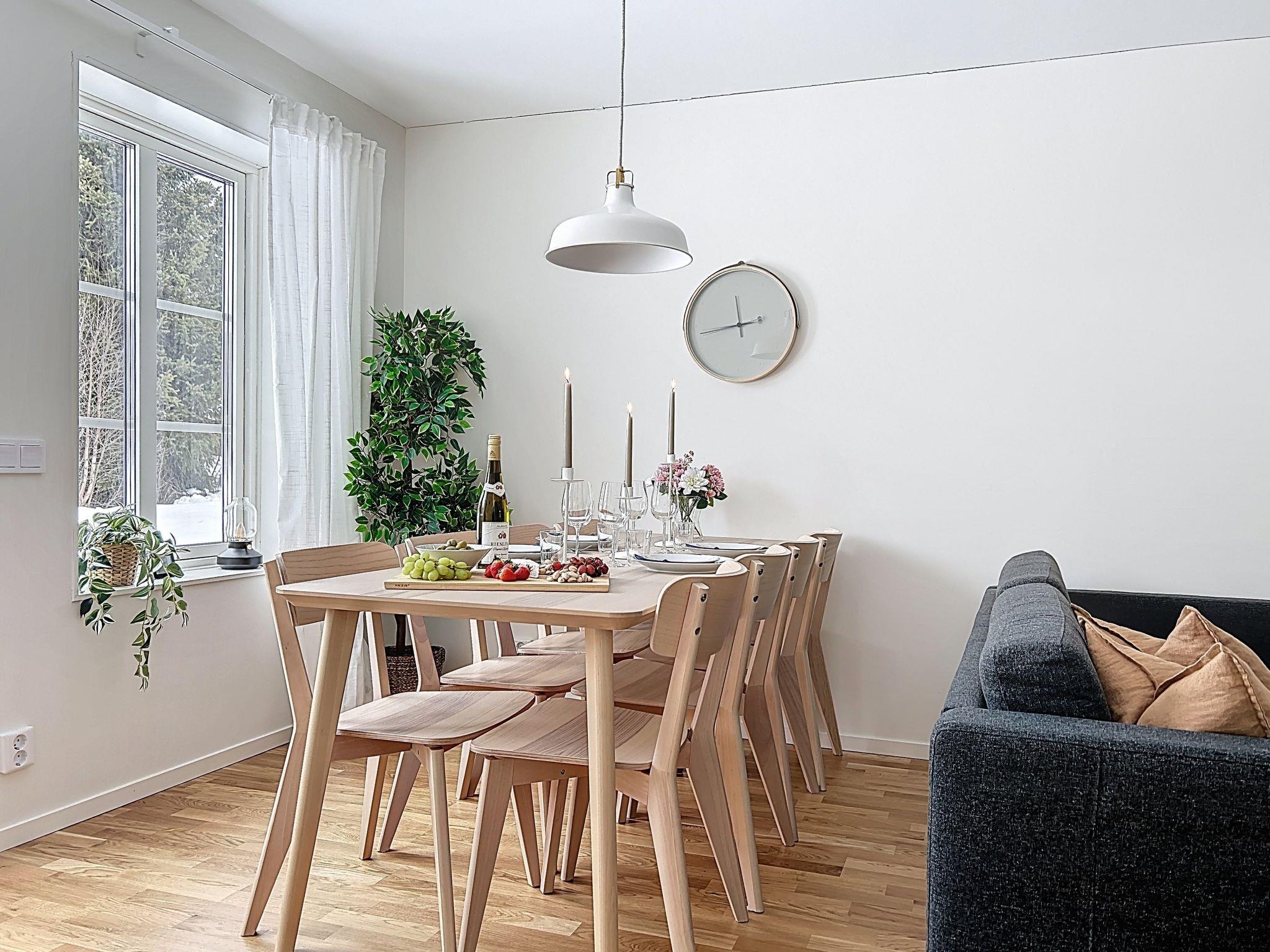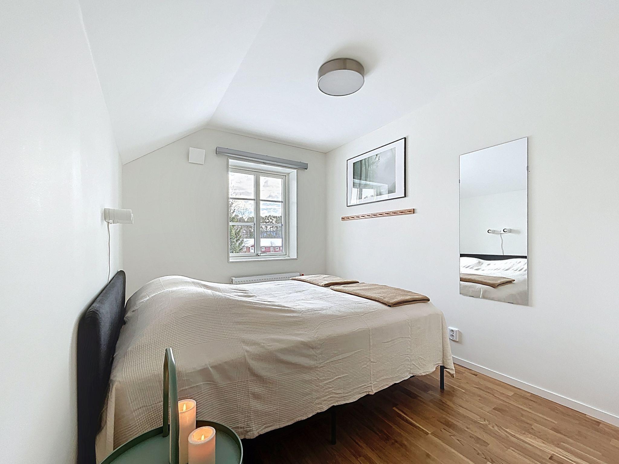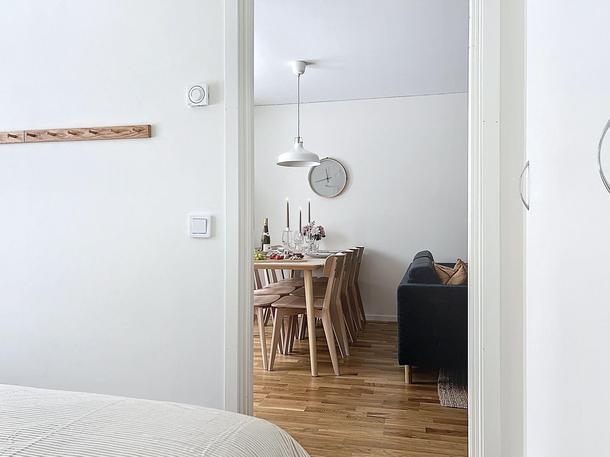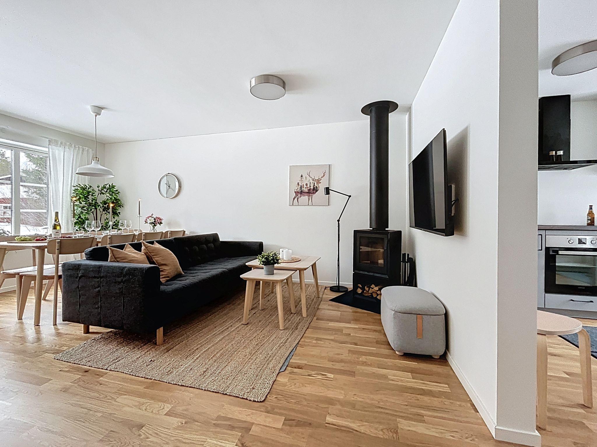 "Östra Svanhågna Gård", 4-Zimmer-Wohnung 87 m2 auf 2 Stockwerken. Einfach und modern eingerichtet: offenes Wohn-/Esszimmer mit Schwedenofen, Esstisch und TV. Ausgang zur Veranda. 1 Zimmer mit 1 Doppelbett (180 cm, Länge 200 cm). Küche (Backofen, Geschirrspüler, 4 Induktionskochplatten, Toaster, Wasserkocher, Mikrowelle, Tiefkühler, elektrische Kaffeemaschine). Dusche/WC, Sauna. Heizung, Holzheizung. Obergeschoss: 1 Zimmer mit 1 x 2 Etagenbetten (90 cm, Länge 200 cm). 1 Zimmer mit 1 x 2 Etagenbetten (90 cm, Länge 200 cm), 1 Doppelbett (180 cm, Länge 200 cm). Dusche/WC. Parkettboden. Terrasse 20 m2. Sitzplatz. Eingeschränkte auf den See, die Berge und das Tal. Zur Verfügung: Waschmaschine, Wäschetrockner, Kinderhochstuhl, Babybett. Internet (WLAN, gratis). Bitte beachten: Nichtraucher-Haus. Rauchmelder.