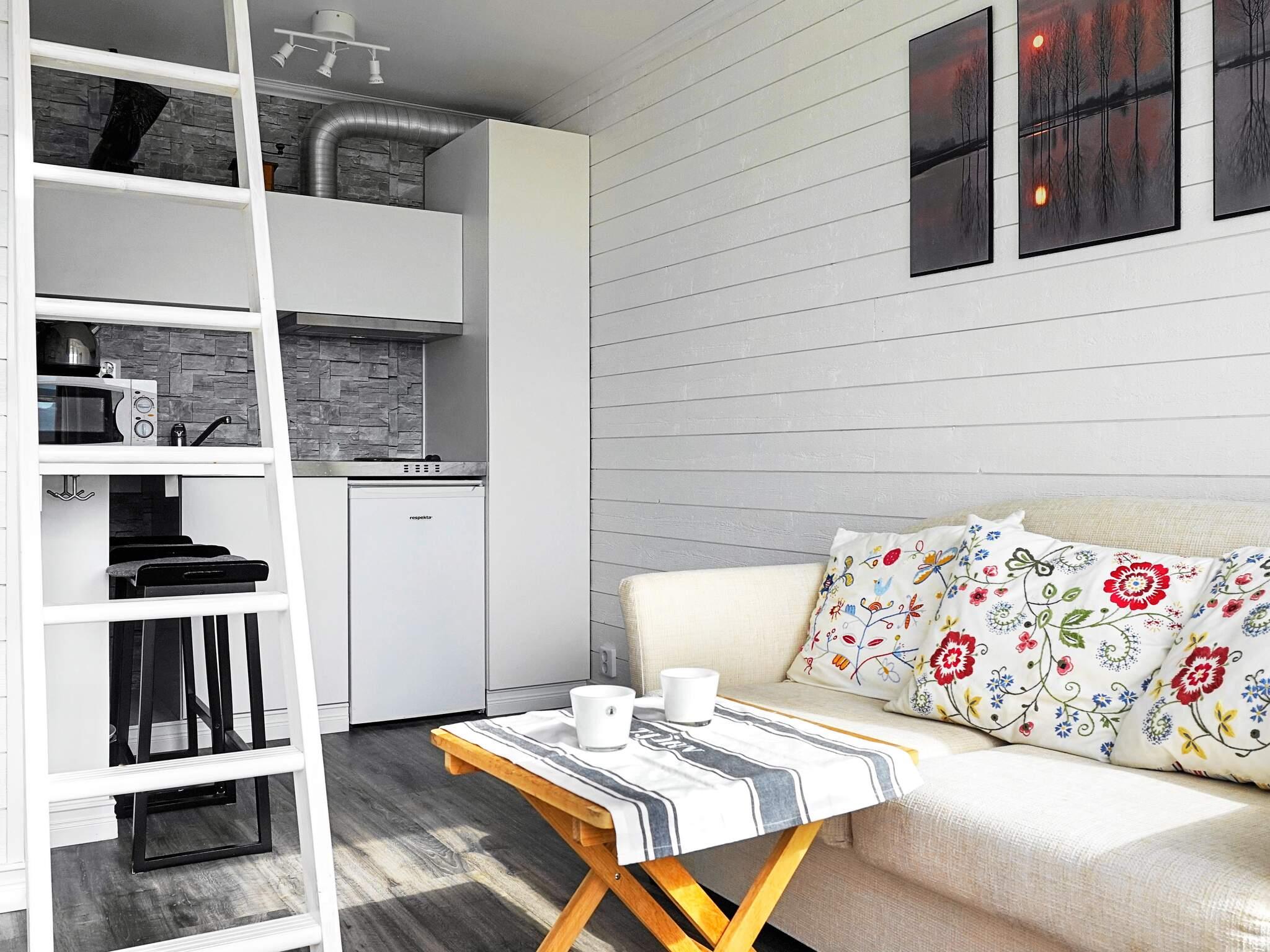 Das Ferienhäuschen ist hell und wohnlich eingerichtet und bietet zeitgemäßen Standard mit teils hochwertigen Materialien und geschmackvollem Ambiente, inklusive des herrlichen Meerblicks. Die Wohnfläche wurde optimal ausgenutzt. Wohnzimmer mit moderner Sitzecke und im Anschluss daran kleine Küchenzeile mit zwei Herdplatten, Mikrowelle, Theke und Barhocker. Zudem kleiner Essplatz am Fenster, falls das Wetter mal nicht mitspielen sollte. Eine Leitertreppe führt hinauf auf den Schlafboden/Hems mit einer 140 cm breiten Federkernmatratze unter der Dachschräge. Der Dachboden hat eine gute Belüftung mit zwei Ventilatoren. Außerdem hell gefliestes, modernes Badezimmer mit Duschkabine im Haus. Zudem guter Internetanschluss per Glasfaser vorhanden.