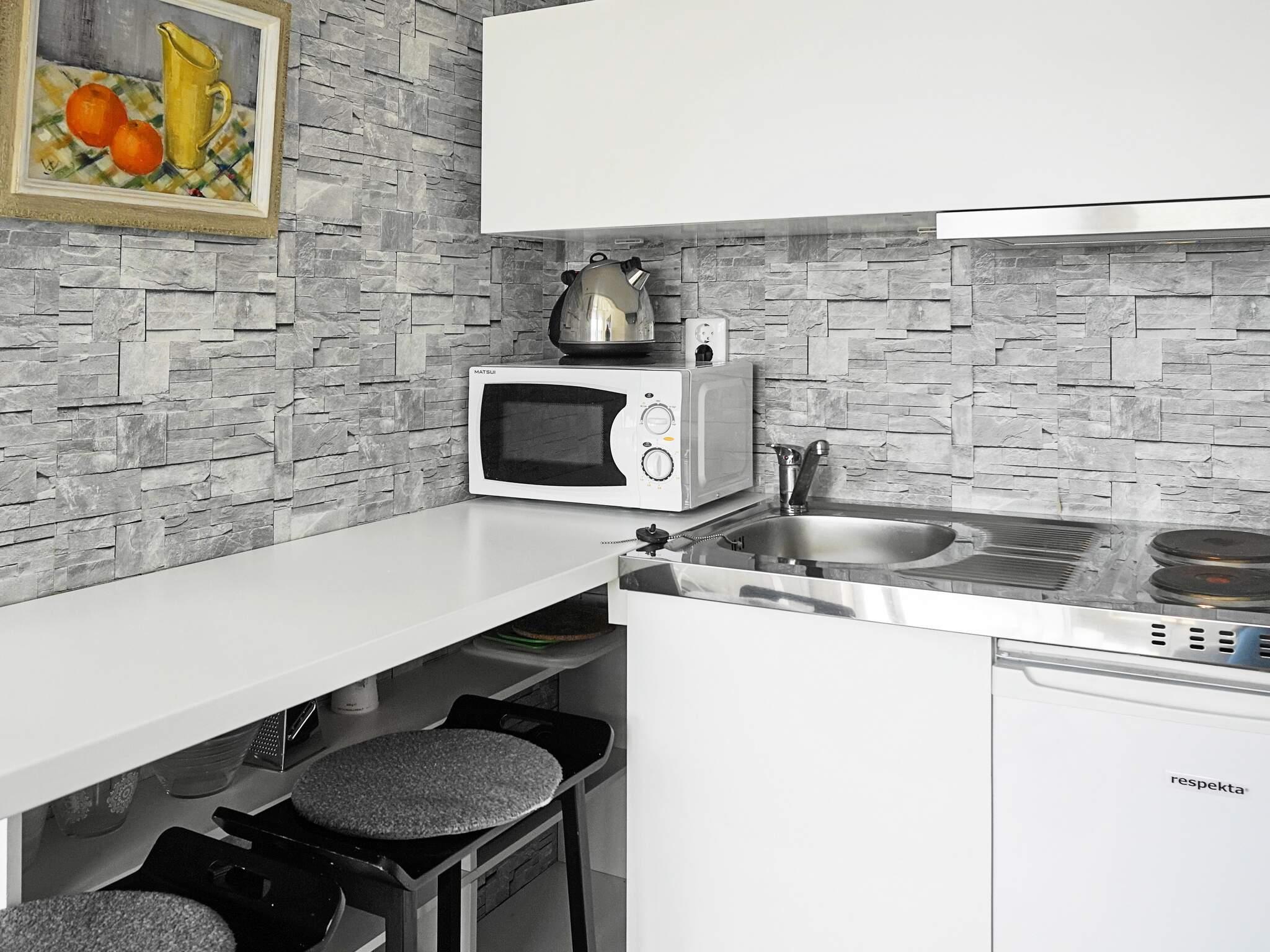 Pantry: E-Kochpl., Kühlschr. m. Gefrierfach, Mikrow., Abzugsh., Kaffeem.