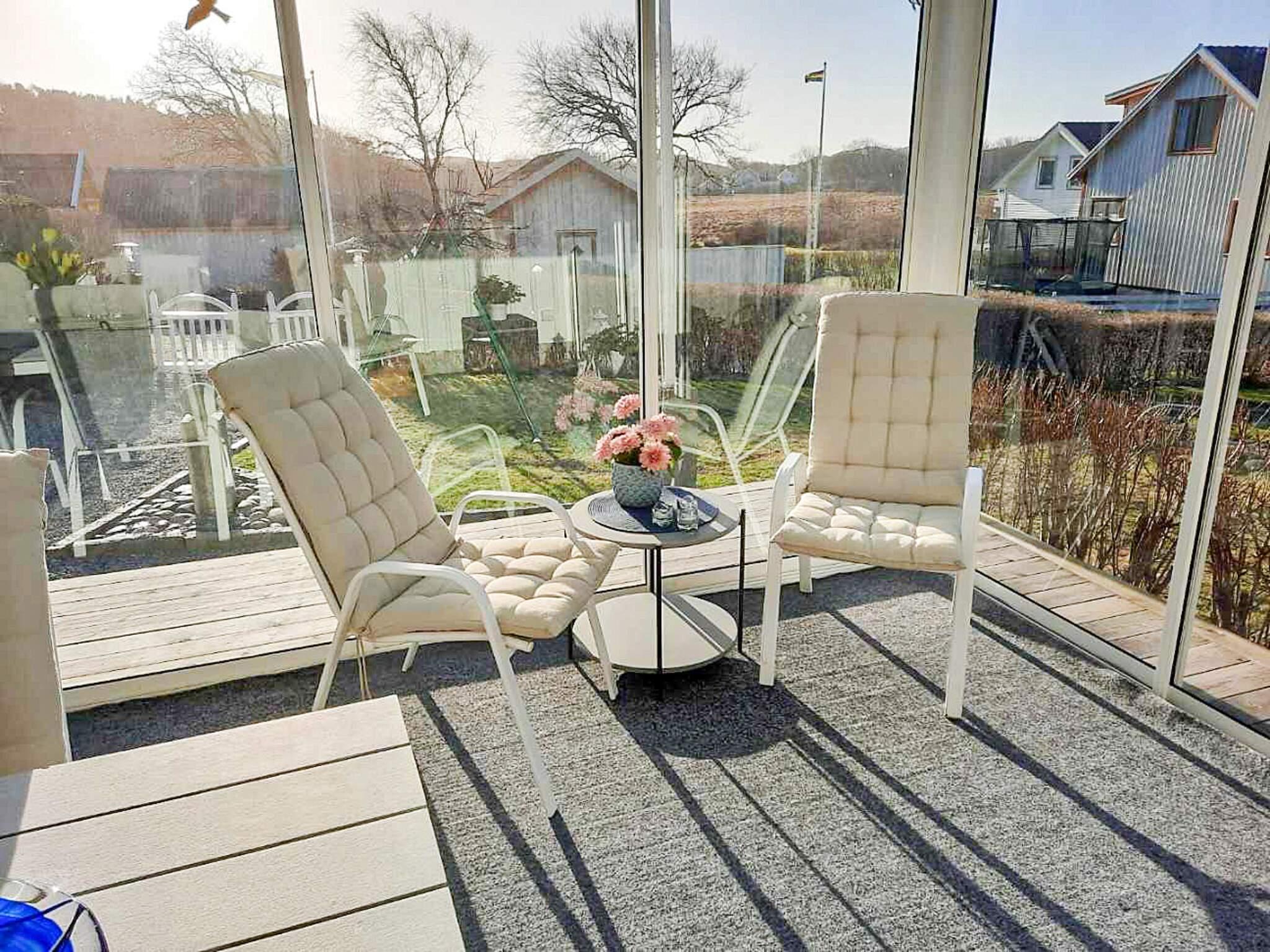 Vorne am Eingang des Hauses liegt ein großer, wunderschön verglaster Wintergarten mit Gartenmöbeln und Grill, ein idealer Ort zum Entspannen nach einem schönen und erfrischenden Bad im Meer oder nach einem Ausflug in Bohuslän.
