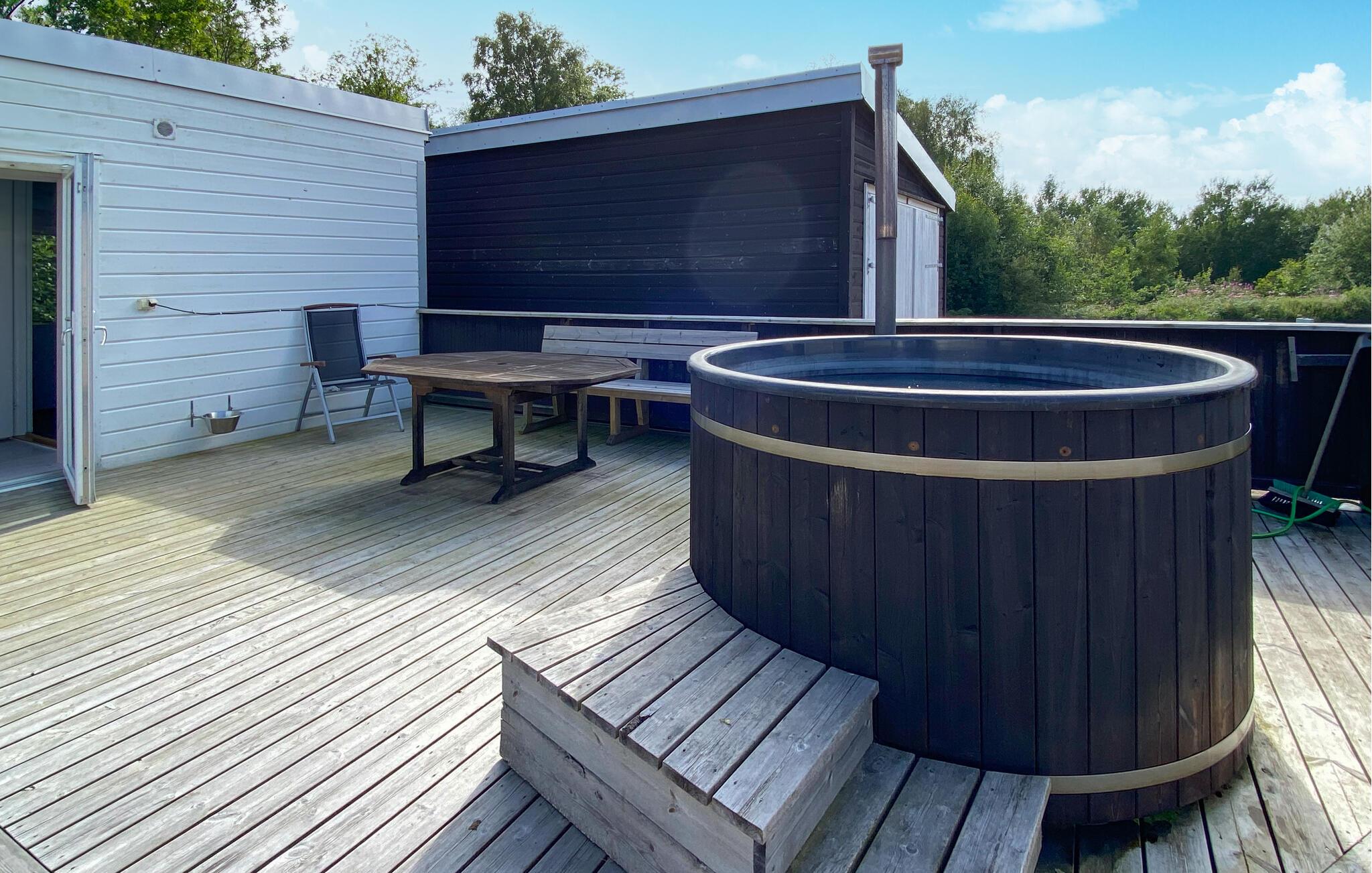 Entspannen Sie sich in diesem großen Ferienhaus mit holzbefeuertem Whirlpool und Holzsauna.