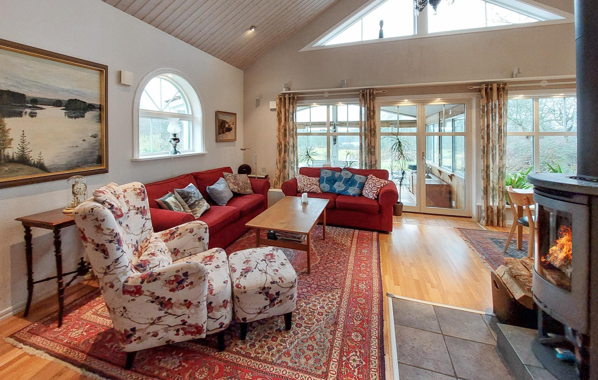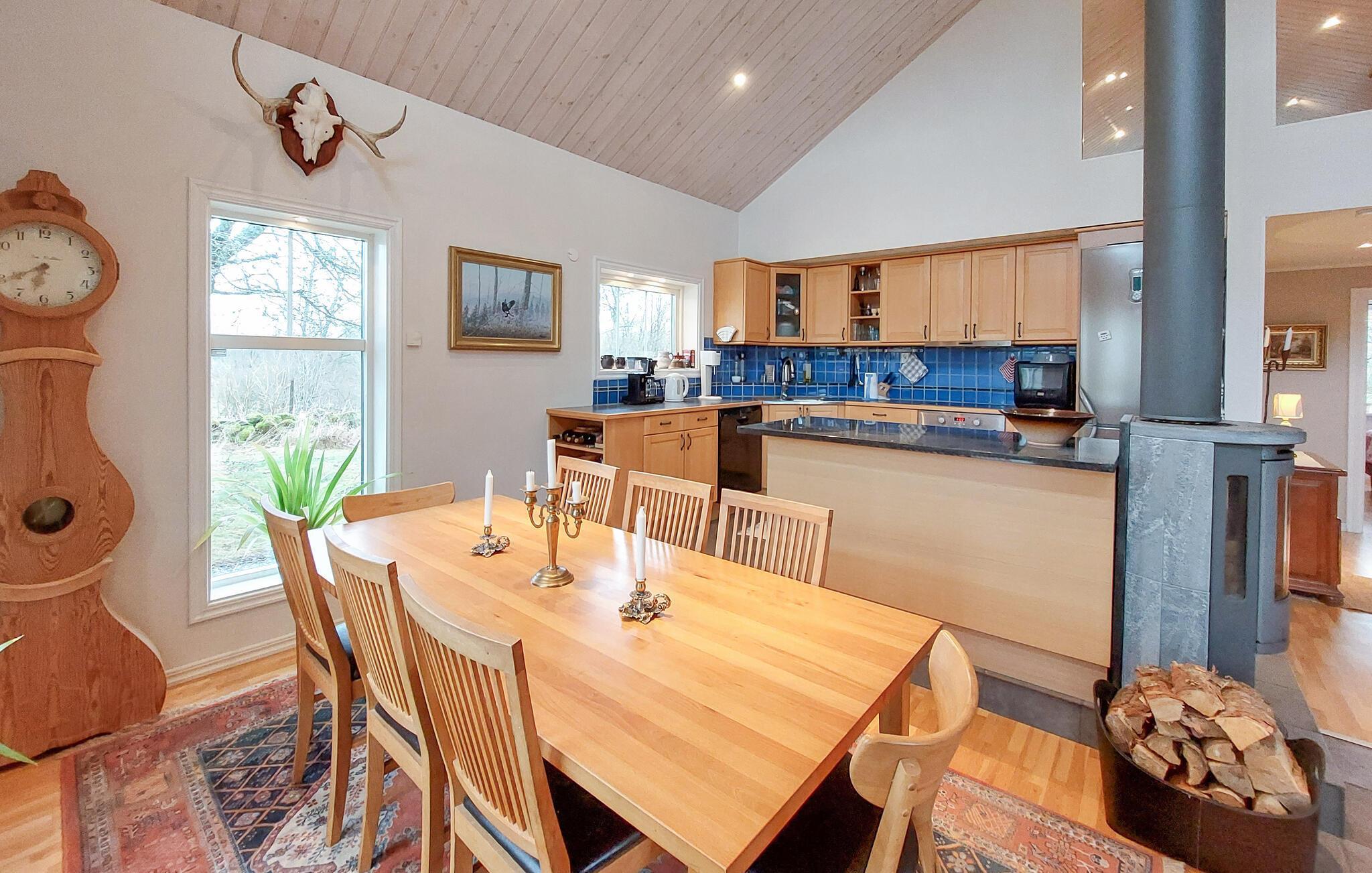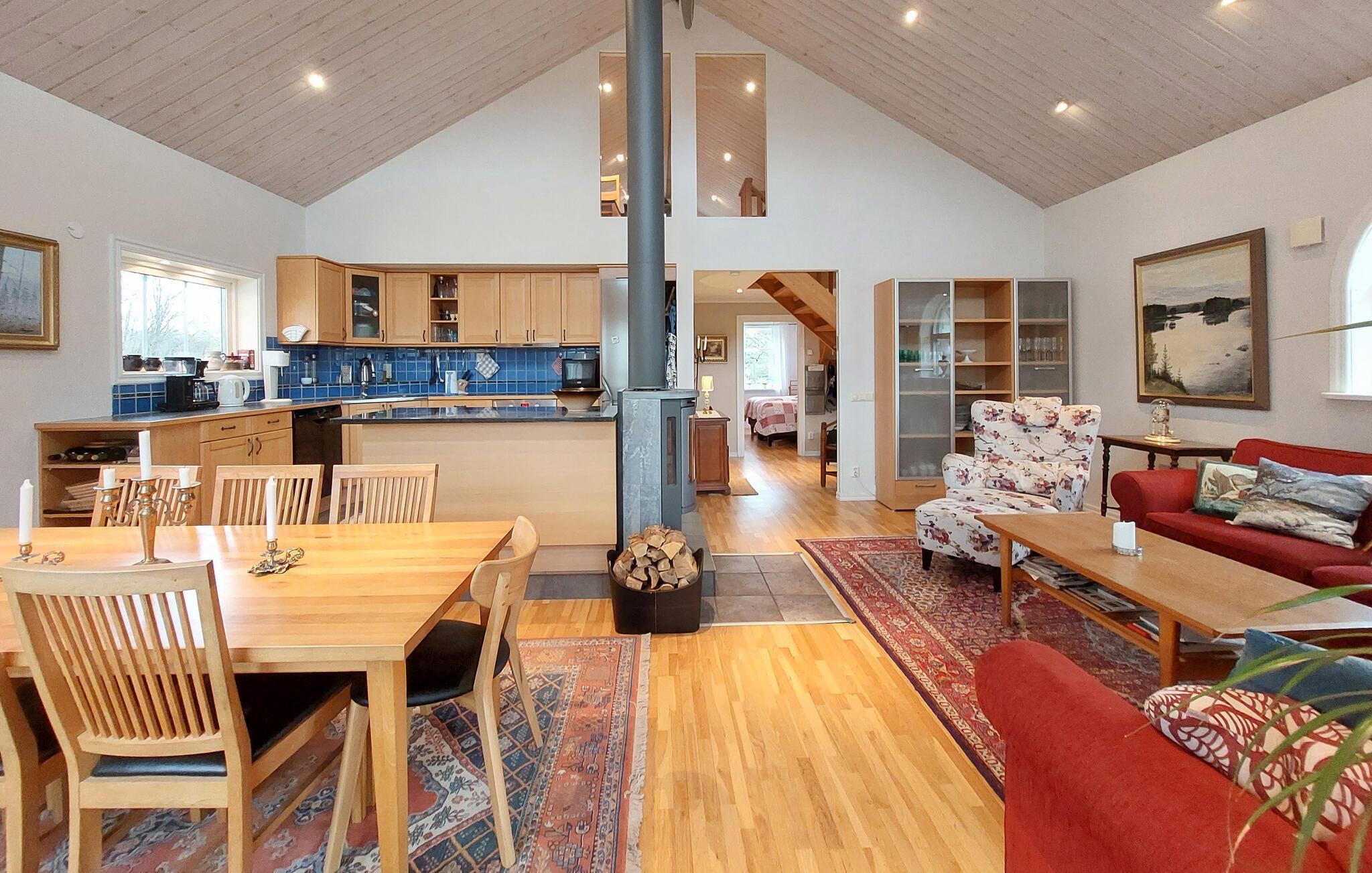 Dieses gemütliche und liebevoll eingerichtete Ferienhaus ist wie geschaffen, um mit einer größeren Familie harmonische Tage im Einklang mit der Natur zu verbringen. Entfachen Sie den Kaminofen und genießen Sie gesellige Kochabende in der offenen Küche sowie leckere Mahlzeiten im behaglichen Essbereich. Machen Sie es sich mit einem Buch auf dem Sofa bequem, gönnen Sie sich wohlige Momente in der Sauna oder veranstalten Sie einen Spieleabend.