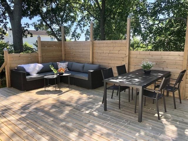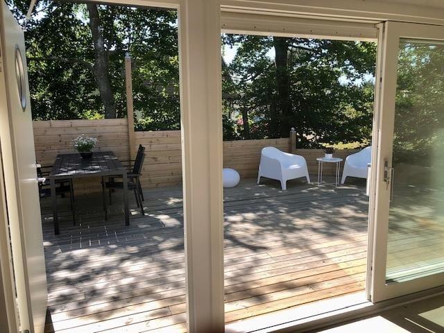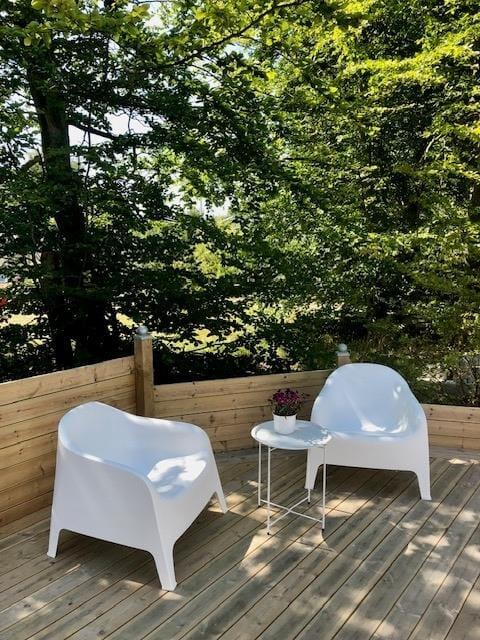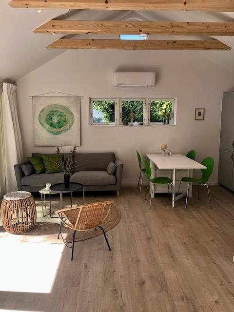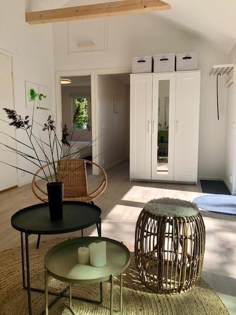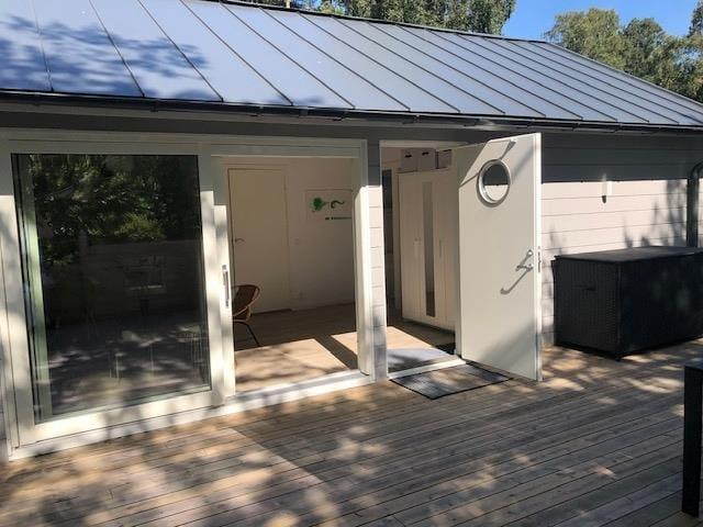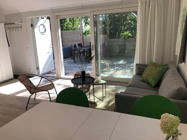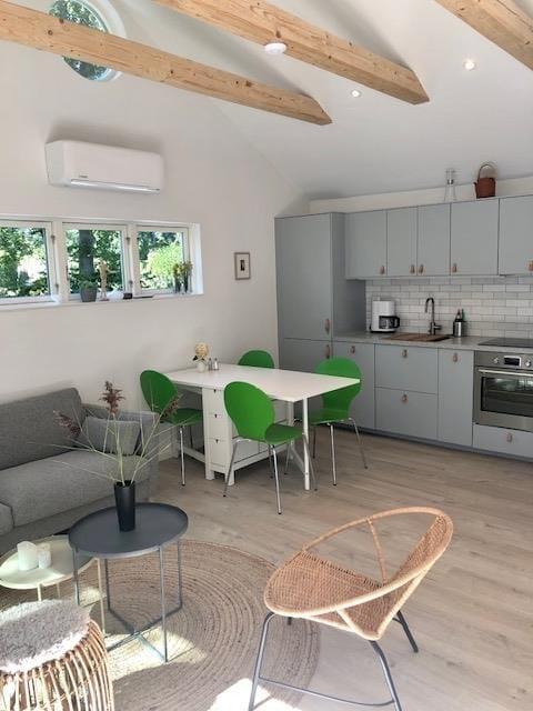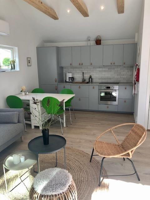 Das neu erbaute Haus “Nybrostrand” bietet besten Komfort auf 44 Quadratmetern. Der offene Wohnraum mit moderner und gut ausgestatteter Küche empfängt dich nicht nur praktisch, sondern auch freundlich eingerichtet. Der Wohnraum ist nach oben hin geöffnet und lässt den Blick auf die Holzbalken frei. Ein kleines Sofa lädt zum Entspannen ein und am Esstisch könnt ihr in gemütlicher Runde eine Mahlzeit einnehmen oder Gesellschaftsspiele spielen. Die Küche ist mit einem modernen Herd mit Ceranfeld und Backofen, einer Geschirrspülmaschine, einer Kühl-Gefrierkombination und einer Kaffeemaschine ausgestattet. In zwei Schlafzimmern finden vier Personen einen Schlafplatz in einem bequemen Doppelbett oder auf dem Schlafsofa für zwei Personen. Das Badezimmer mit Fussbodenheizung ist praktisch und funktional mit einer Dusche und einer Waschmaschine ausgestattet. Eine große Glasschiebetür verbindet im Sommer den Wohnraum mit der Terrasse und lädt zu entspannten Stunden auf dem Loungesofa ein - oder zu einem leckeren Abendessen vom Grill. Im Winter wird der Wohnraum mit einer Wärmepumpe beheizt. Im Haus gibt es Wlan.