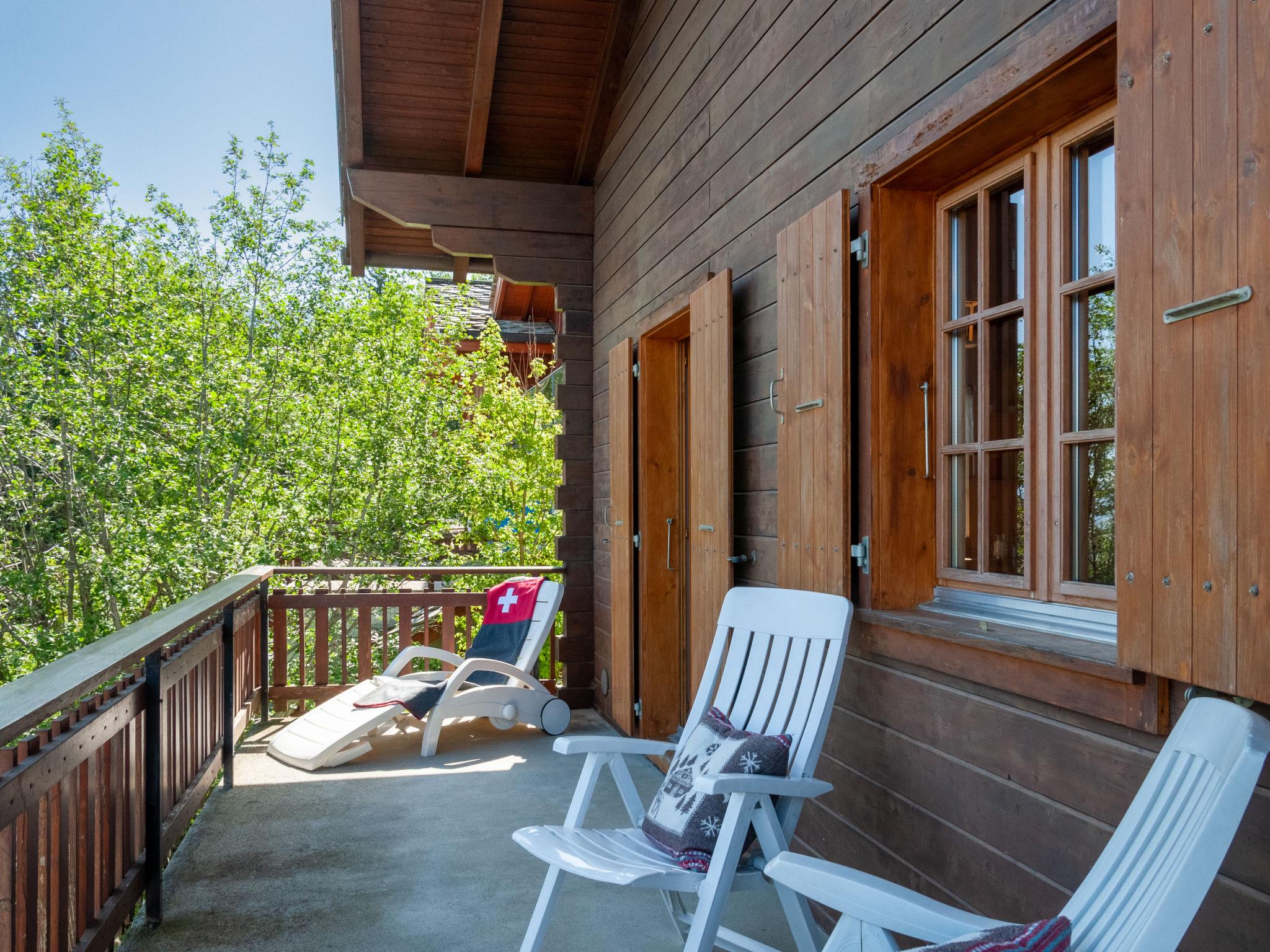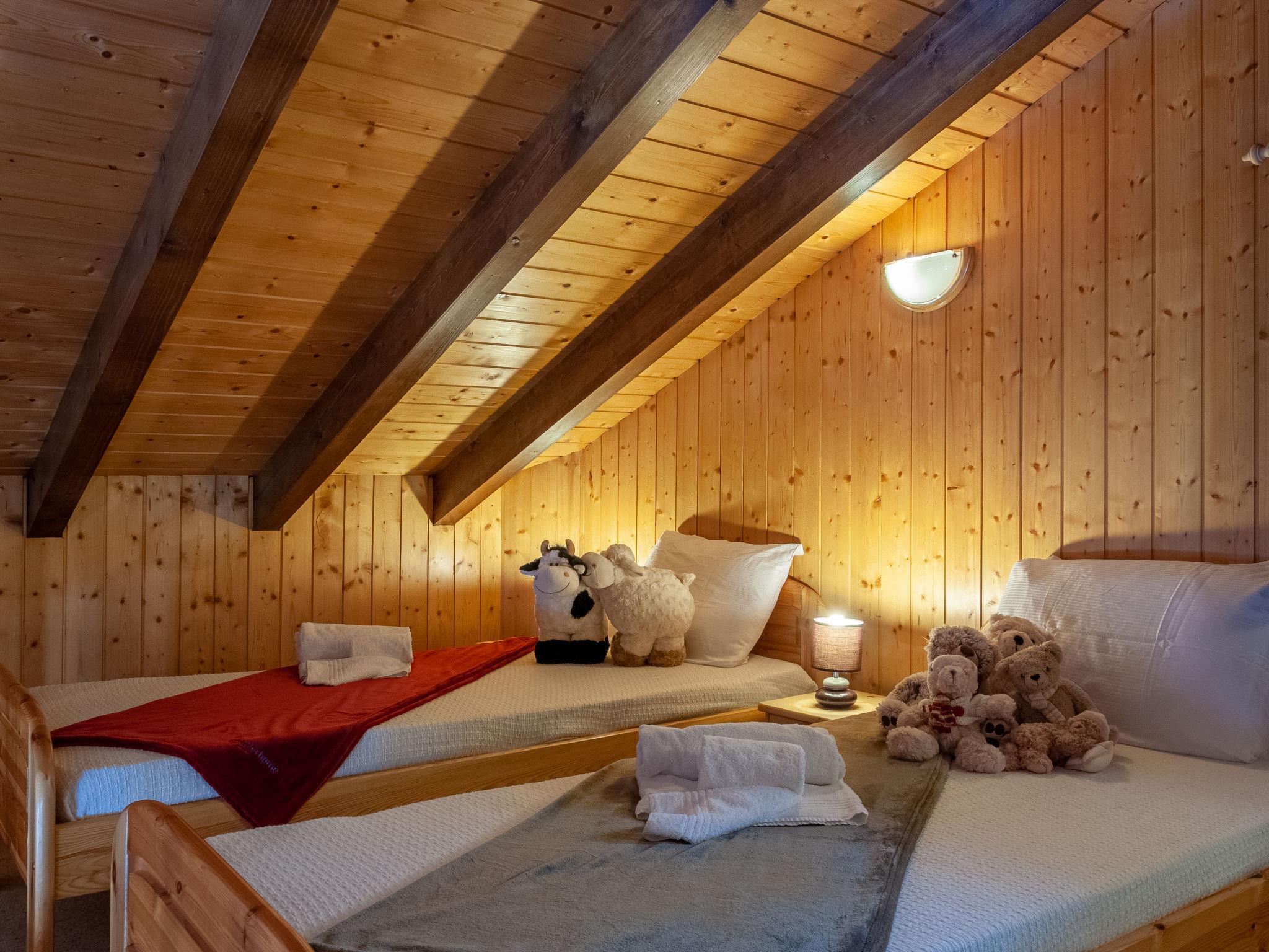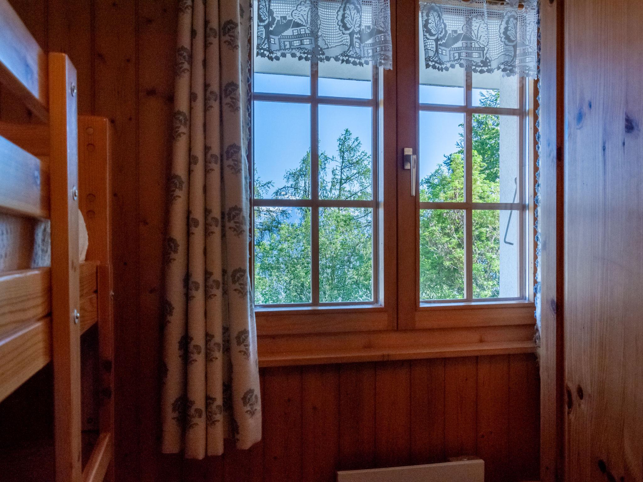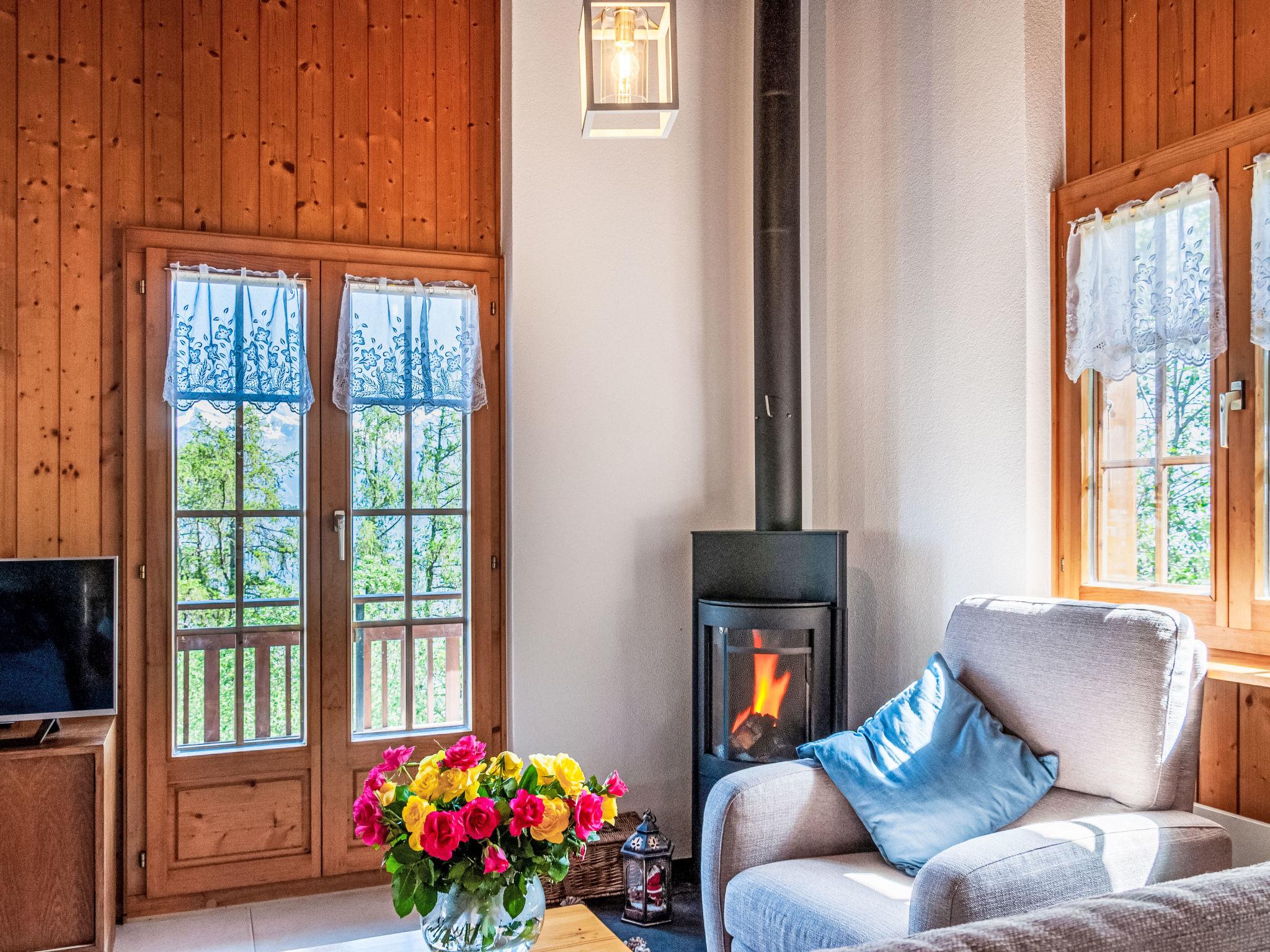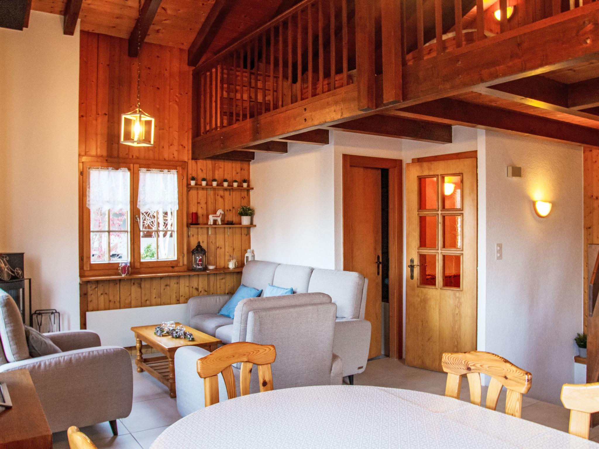 "Anusach", 3-Zimmer-Chalet 80 m2 auf 2 Stockwerken. Teilweise renoviert im Jahre 2022, komfortabel und mit viel Holz eingerichtet: kleiner Eingang. Wohn-/Esszimmer mit Schwedenofen und Kabel-TV. Ausgang zur Terrasse, Richtung Norden und Richtung Westen. Offene Küche (Backofen, Geschirrspüler, 4 Glaskeramikplatten, Toaster, Wasserkocher, Mikrowelle, elektrische Kaffeemaschine, Racletteofen, Fondue Set (Käse)). Dusche/WC. E-Heizung. Unteres Geschoss: 1 Zimmer mit 1 franz. Bett (1 x 160 cm, Länge 200 cm). 1 Zimmer mit 1 x 2 Etagenbetten (90 cm, Länge 190 cm). Bad/WC. Obergeschoss: (steile Treppe) abgeschrägte, offene Galerie mit 2 Betten (90 cm, Länge 190 cm). Terrasse, Nordlage. Sehr schöne Sicht auf die Berge und das Tal. Zur Verfügung: Waschmaschine, Haartrockner. Internet (Wireless LAN, gratis). Garage (1 Auto), Höhe 200 cm, Breite 225 cm. Bitte beachten: Nichtraucher-Unterkunft. 1 kleines Haustier/Hund erlaubt. Anstelle eines abgeschlossenen Schlafzimmers befinden sich manche Schlafplätze in einem offenen Bereich (Galerie, Nische etc.).