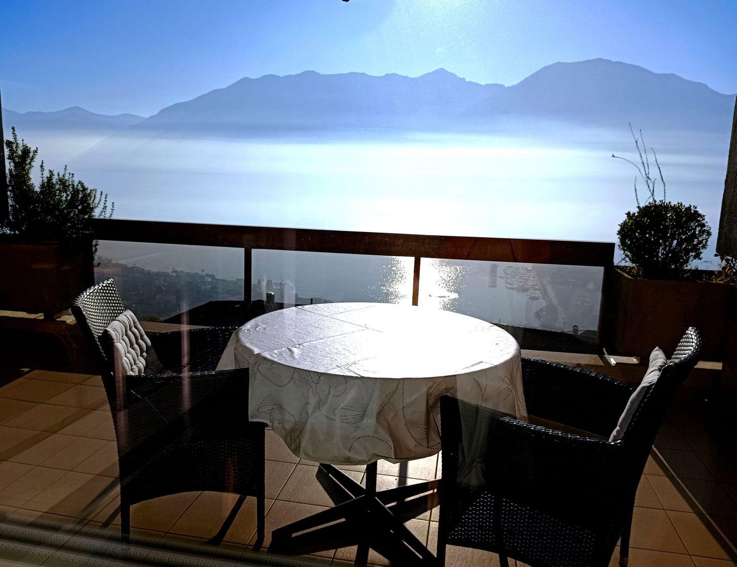 Grosser, möblierter Balkon mit Panorama-See- und Bergsicht.