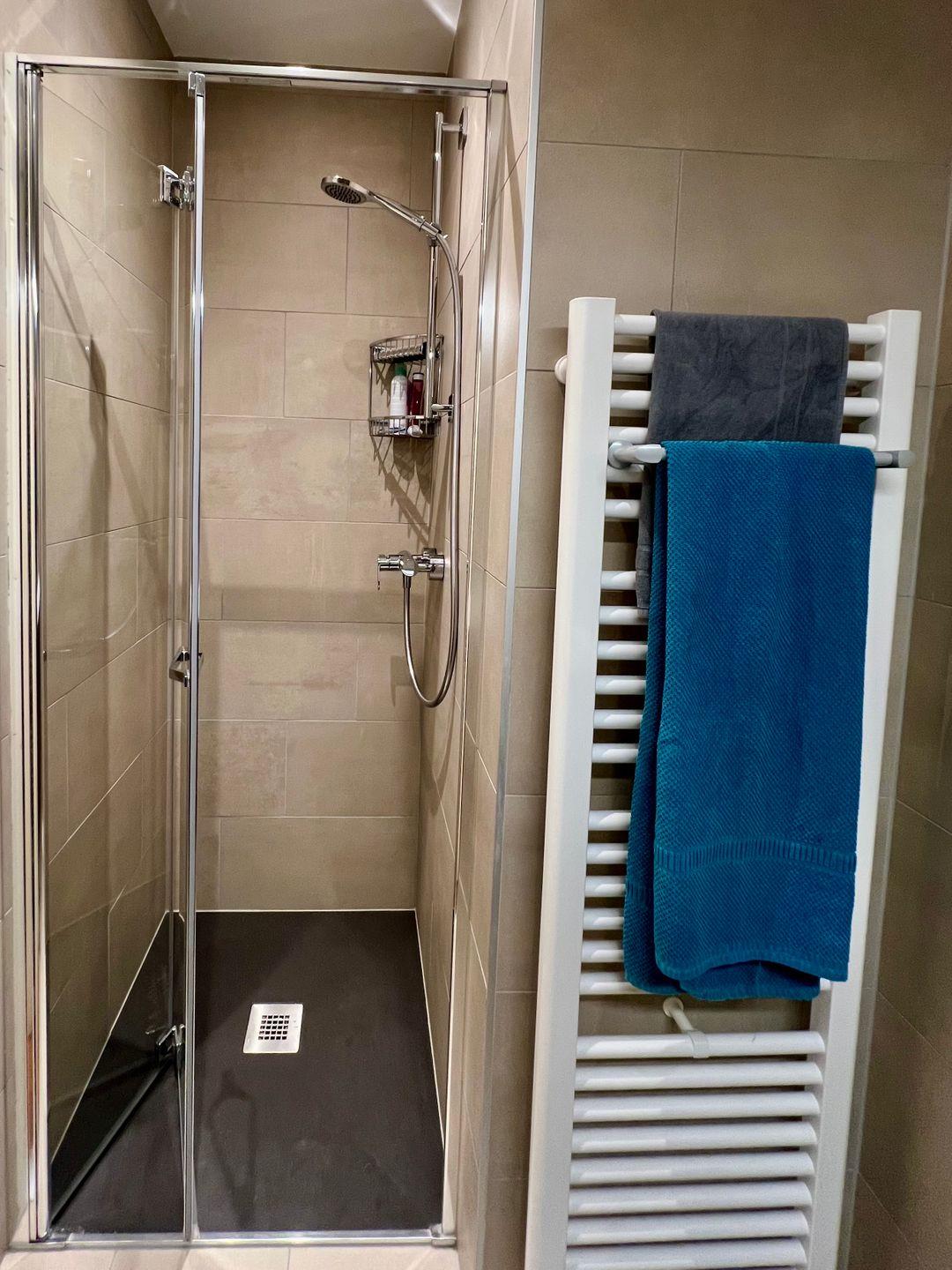 Bad mit Dusche, Waschbecken, Haartrockner, separates WC.