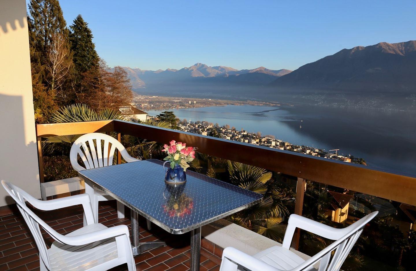 Grosser, möblierter Balkon mit Panorama-See- und Bergsicht.