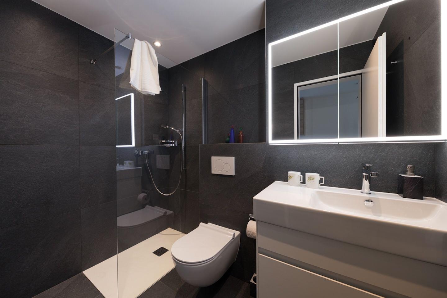 Bad mit Dusche, Waschbecken, Haartrockner und WC.
