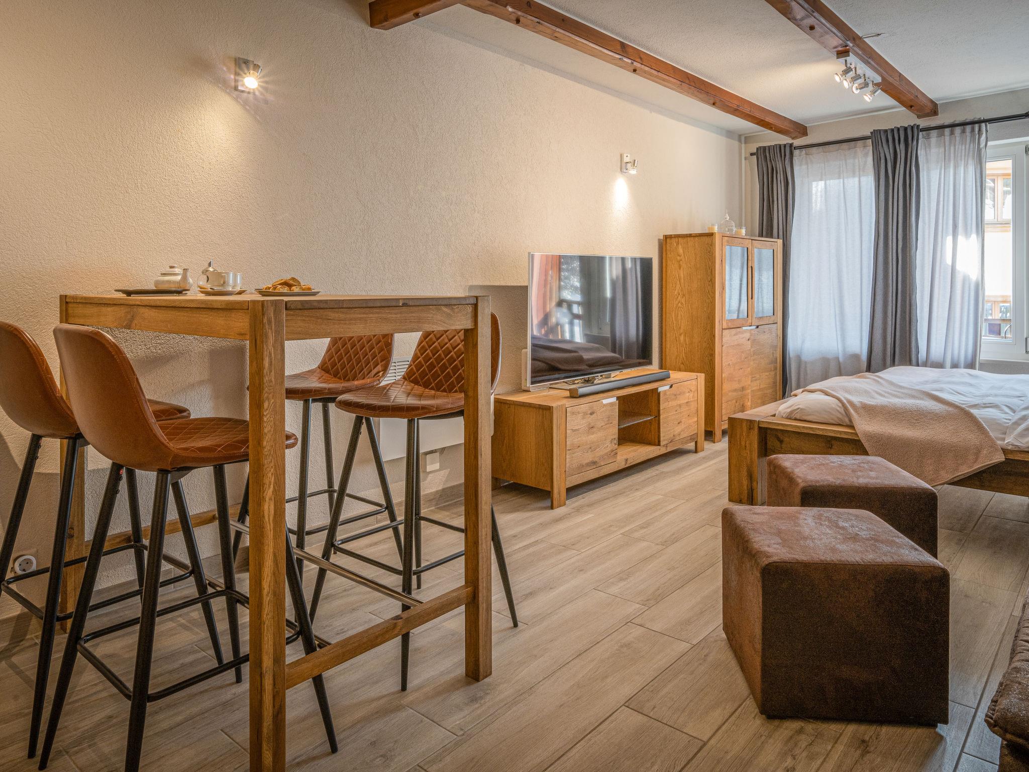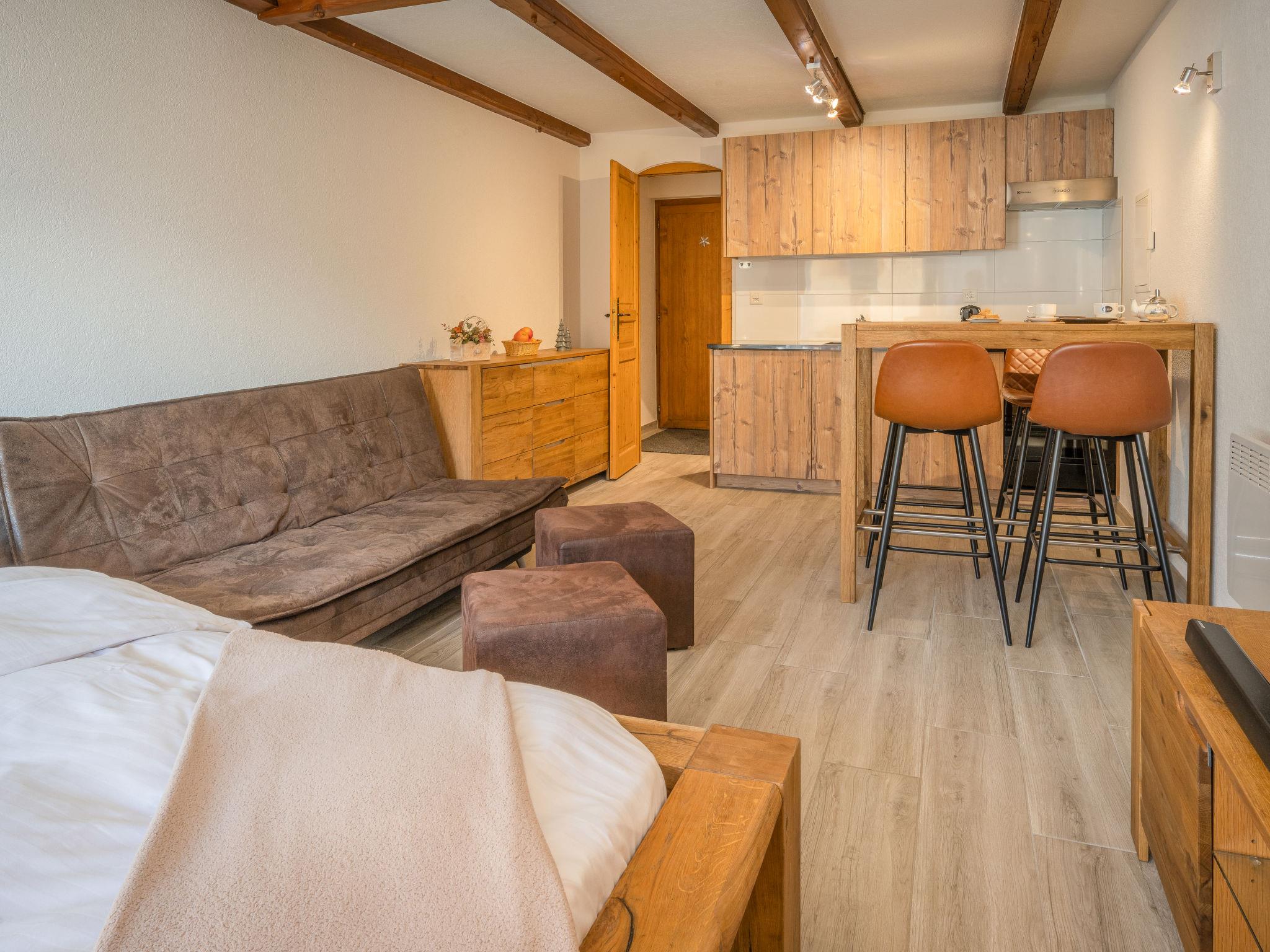 "Morthey 3", 1-Zimmer-Wohnung 28 m2. Geräumig, vollständig renoviert im Jahre 2020, komfortabel und modern eingerichtet: Wohn-/Esszimmer mit 1 franz. Bett (180 cm, Länge 200 cm), Esstisch und Kabel-TV. Ausgang zum Balkon. Offene Küche (Backofen, 2 Glaskeramikplatten, Toaster, Wasserkocher, elektrische Kaffeemaschine, Kapseln für die Kaffeemaschine (Nespresso) extra, Racletteofen, Fondue Set (Käse)). Dusche/WC. E-Heizung. Balkon, Südlage. Balkonmöbel, Liegestühle (2). Zur Verfügung: Internet (WLAN, gratis). Parkplatz beim Haus. Bitte beachten: Nichtraucher-Unterkunft.