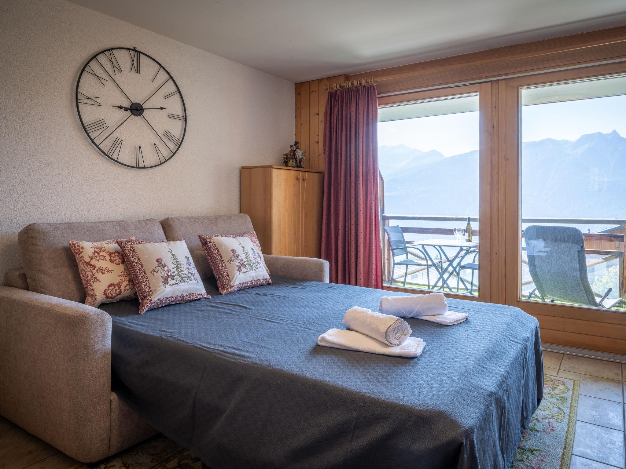 "Seya 21", 1-Zimmer-Studio 26 m2 im 2. Stock, Südlage. Geräumig, komfortabel und geschmackvoll eingerichtet: Wohn-/Schlafzimmer mit Panoramafenster mit 1 Diwanbett (150 cm, Länge 190 cm), Essecke, Kabel-TV und Flachbildschirm. Ausgang zum Balkon, Richtung Süden. Offene Küche (Backofen, 4 Glaskeramikplatten, Toaster, Wasserkocher, Mikrowelle, elektrische Kaffeemaschine, Kapseln für die Kaffeemaschine (Nespresso) extra, Racletteofen, Fondue Set (Chinoise, Käse)). Dusche/WC. Balkon 8 m2, Südlage. Balkonmöbel, Elektrogrill (mobil), Liegestühle (2). Sehr schöne Sicht auf die Berge und das Tal. Zur Verfügung: Haartrockner. Internet (Wireless LAN, gratis). Garage Nr. 21 (1 Auto), Höhe 260 cm, Breite 250 cm. Bitte beachten: Nichtraucher-Unterkunft.