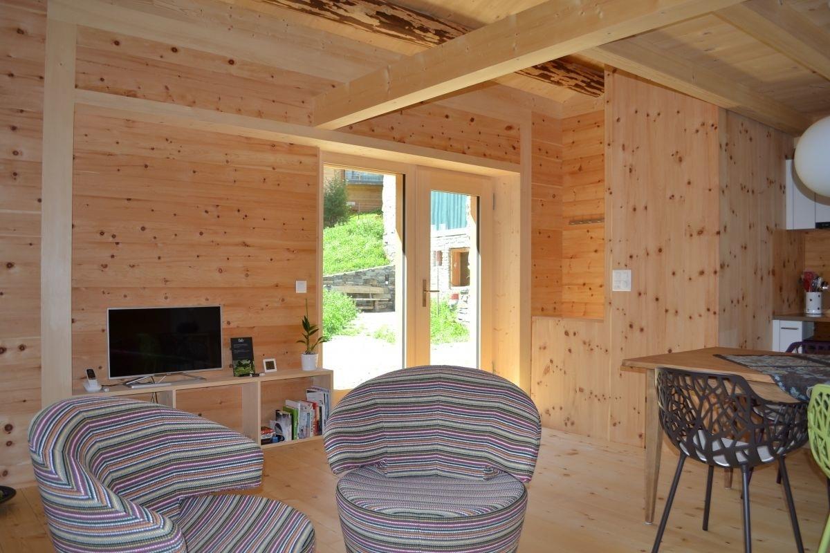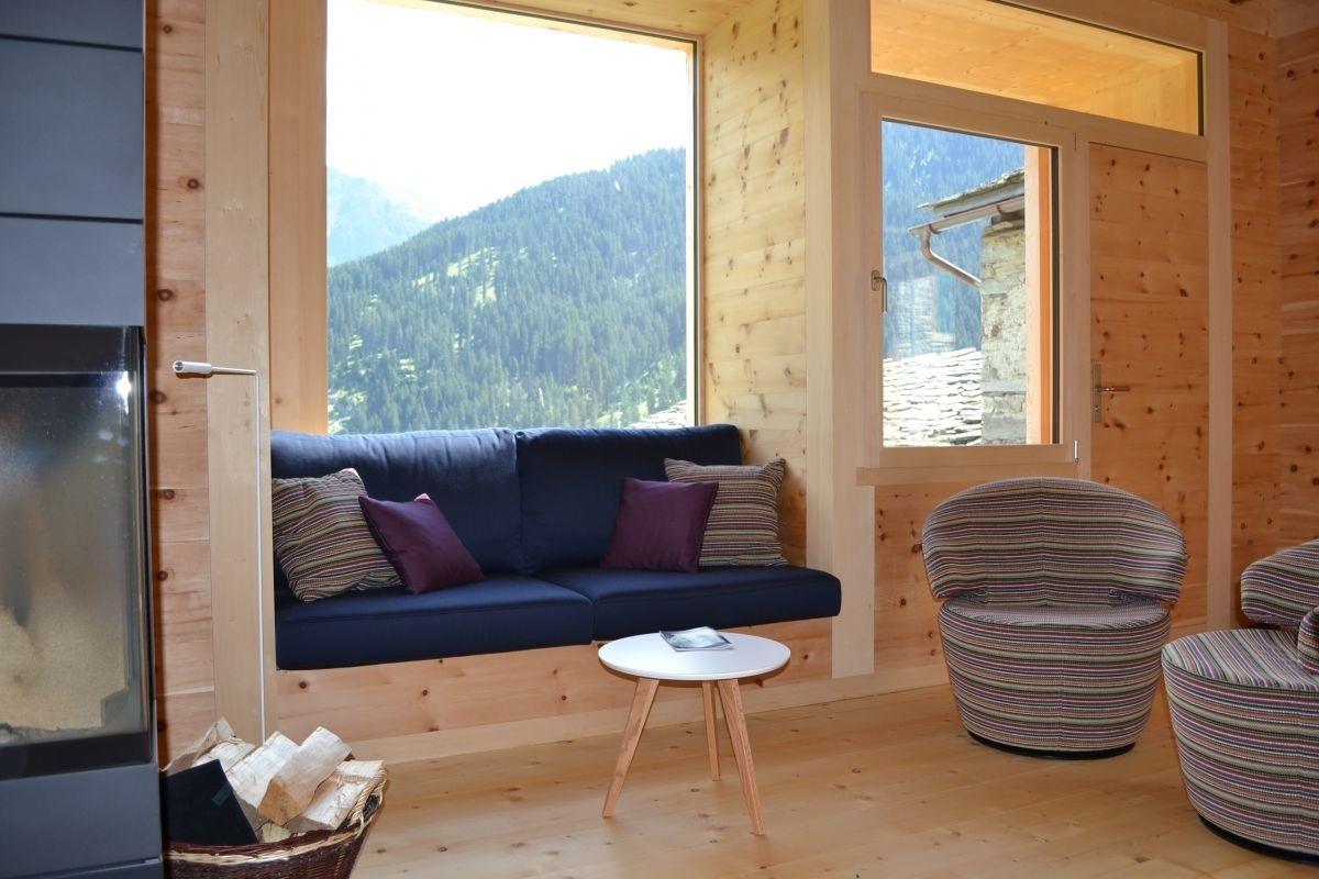Über eine aufgrund der beschränkten Platzverhältnissen steile und enge Treppe (weniger geeignet für kleine Kinder oder gebrechliche Leute, siehe Fotos) gelangt man in den bis zum Dach offenen hellen Wohnraum. Hier findet man eine wunderbare gepolsterte Sitznische mit herrlicher Aussicht zum lesen, kuscheln und ausspannen. Zwei bequeme drehbare Sessel bieten weitere Sitzgelegenheiten. Am rustikalen Küchentisch mit Forest Designstühlen finden bis zu sechs Personen Platz. Die kleine, aber moderne und gut ausgestattete Küche (Abwaschmaschine, Combi Steamer, Nespresso Kaffeemaschine, Fonduecaquelon, Racletteofen) bietet alle Voraussetzungen für das kulinarische Verwöhnprogramm. Valser Mineralwasser sowie Nespresso Kaffee sind inklusive.