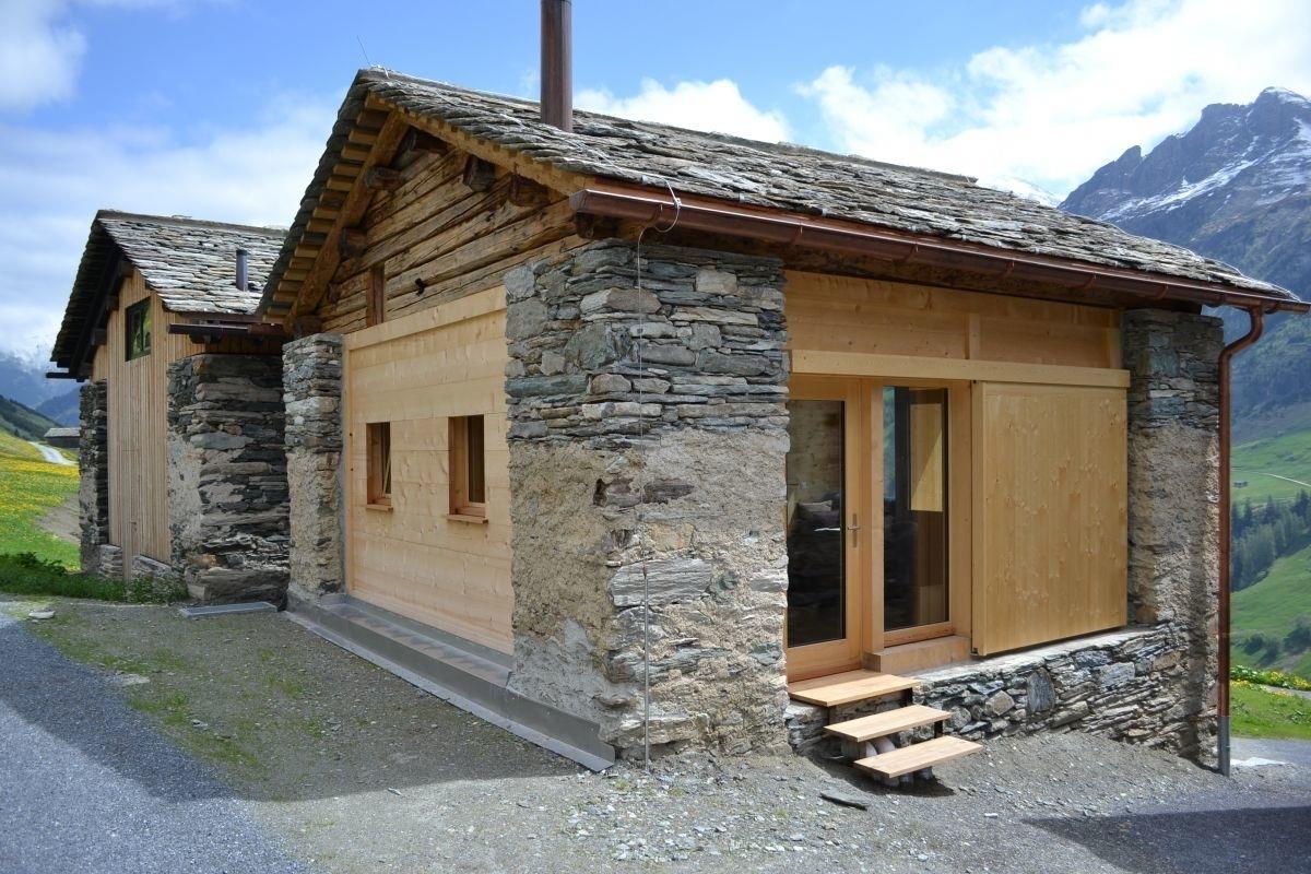 Beim Bau wurde darauf geachtet, einheimische Materialien zu verwenden. So wurde hauptsächlich Fichtenholz verbaut. Die Zimmer im Untergeschoss verfügen über einen Lärchenboden. WC und Bad sind selbstverständlich in einheimischem Valser Quarzit gehalten. Und die Steinplatten auf dem Dach sind in Vals ja sowieso ein Muss. Im oberen Geschoss wurde neben der konstruktiven Elemente aus Fichte viel wohlriechendes und gesundes Arvenholz verwendet.