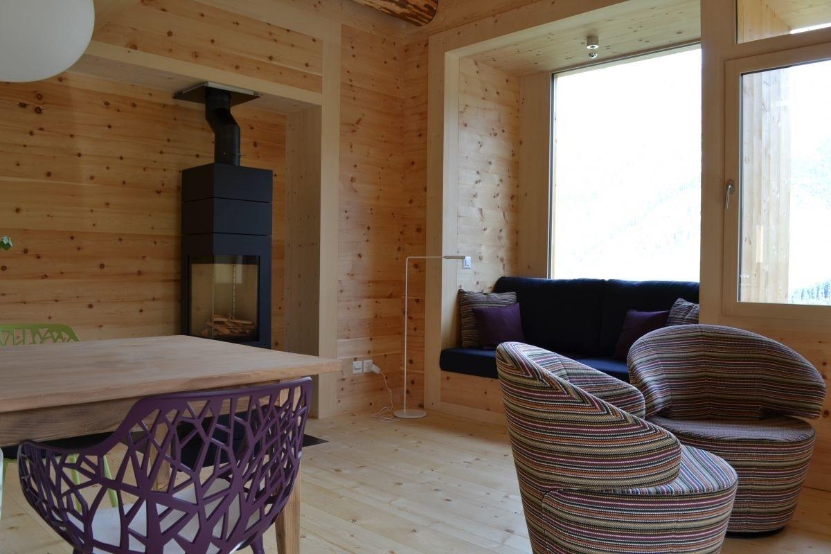 Der Wohnraum verfügt als schmuckes Extra über einen kleinen feinen Balkon mit fantastischer Aussicht. An dunklen Winterabenden kann zudem der in schwarzem Stahl gehaltene Skandia Chemineeofen manuell eingefeuert werden. Das knisternde Holz und das flackernde Licht des Feuers tragen zur einmaligen Hüttenromantik bei.