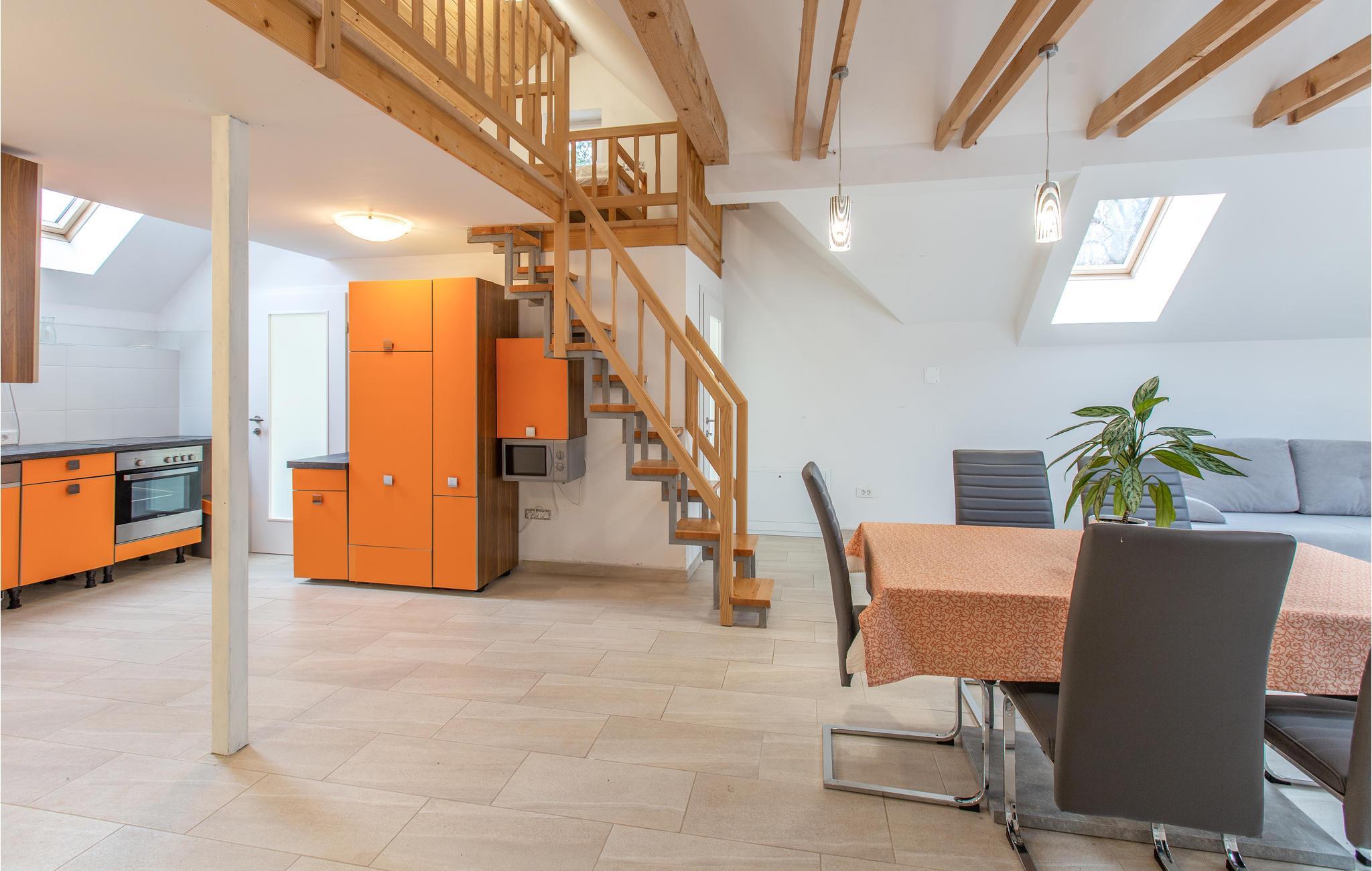 Lassen Sie sich in den hellen Räumen häuslich nieder, mit der wohnlichen Einrichtung, die durch viel Holz einen warmen Ausdruck erhält, ist die Wohnung der ideale Ort für eine schöne Auszeit nahe der Natur. Machen Sie es sich nach Ihren Unternehmungen im Wohnzimmer gemütlich, das mit bequemen Sofas zum Entspannen einlädt.