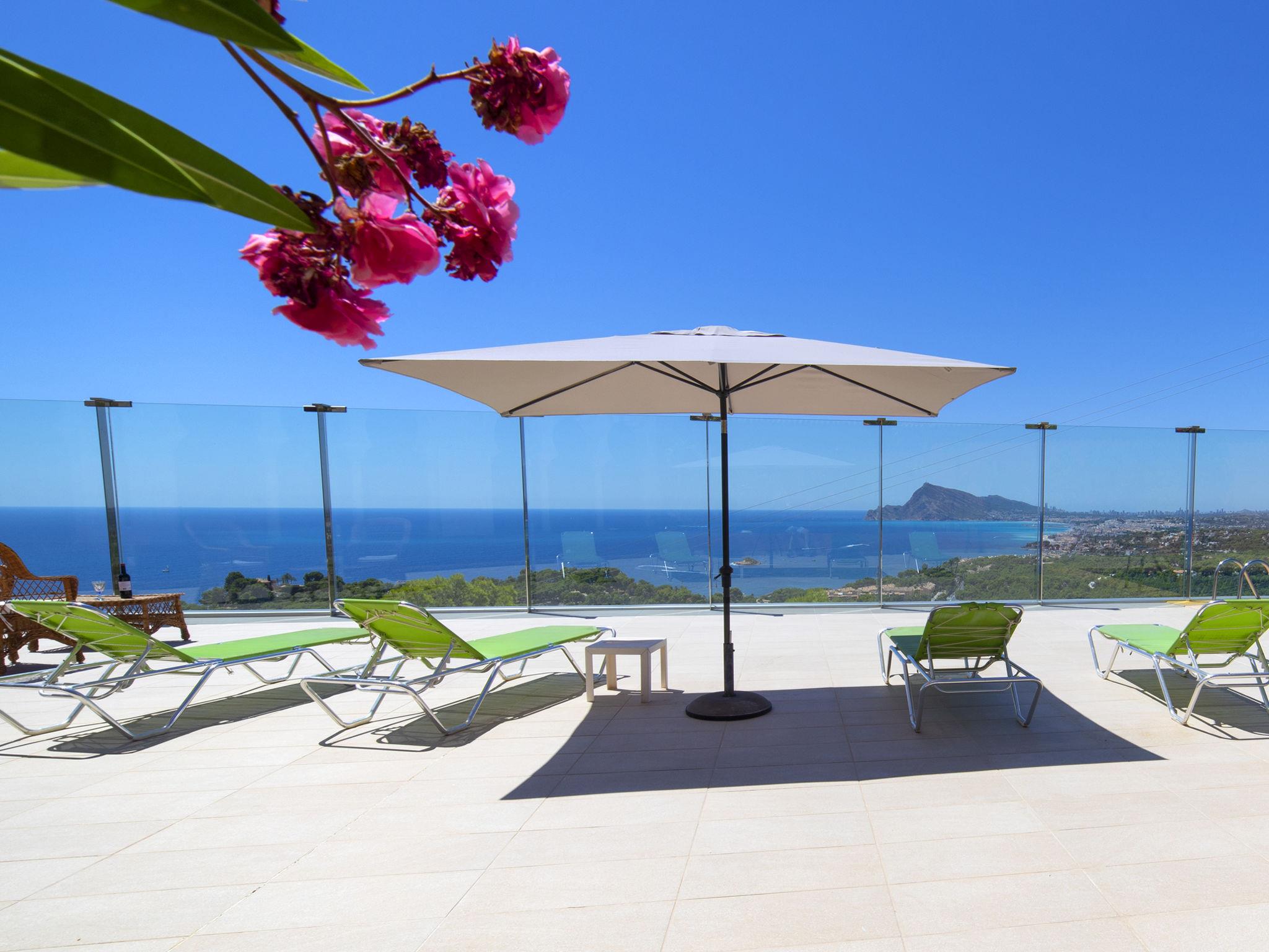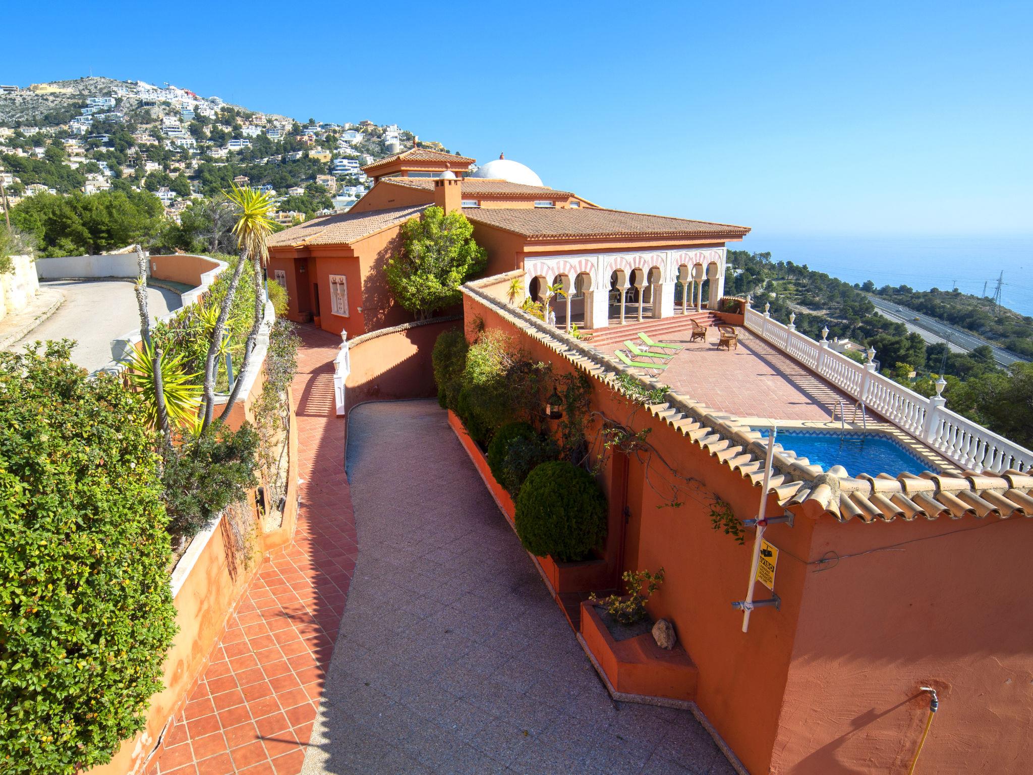 Sierra de Altea: Grosse, schöne Villa "Azahara". Im Ort, 5 km vom Zentrum von Altea, 7.6 km vom Zentrum von Calpe, sonnige, erhöhte Lage im Villenviertel, 2.3 km vom Meer, 2.8 km vom Strand. Zur Alleinbenutzung: Grundstück 1'800 m2 (eingezäunt), Schwimmbad (8 x 5 m, saisonale Verfügbarkeit: 01.Jan. - 31.Dez.). Aussendusche, Terrasse, Grill. Supermarkt 1.2 km, Restaurant, Café 650 m, Bushaltestelle 3.7 km, Sandstrand "Cap Negret" 3.9 km, Steinstrand "Playa el Mascarat" 2.3 km. Sporthafen 2.6 km, Jacht-Hafen 2.6 km, Golfplatz (9 Loch) 4.2 km. Nahe gelegene Sehenswürdigkeiten: Aqualandia, Mundomar, Terra Mítica, Terra Natura, Benidorm Palace (Benidorm), Les Fonts de l'Algar, Castillo de Guadalest. Jugendgruppen nur auf Anfrage. Bitte beachten: Autobahn in der Nähe 500 m vom Haus.