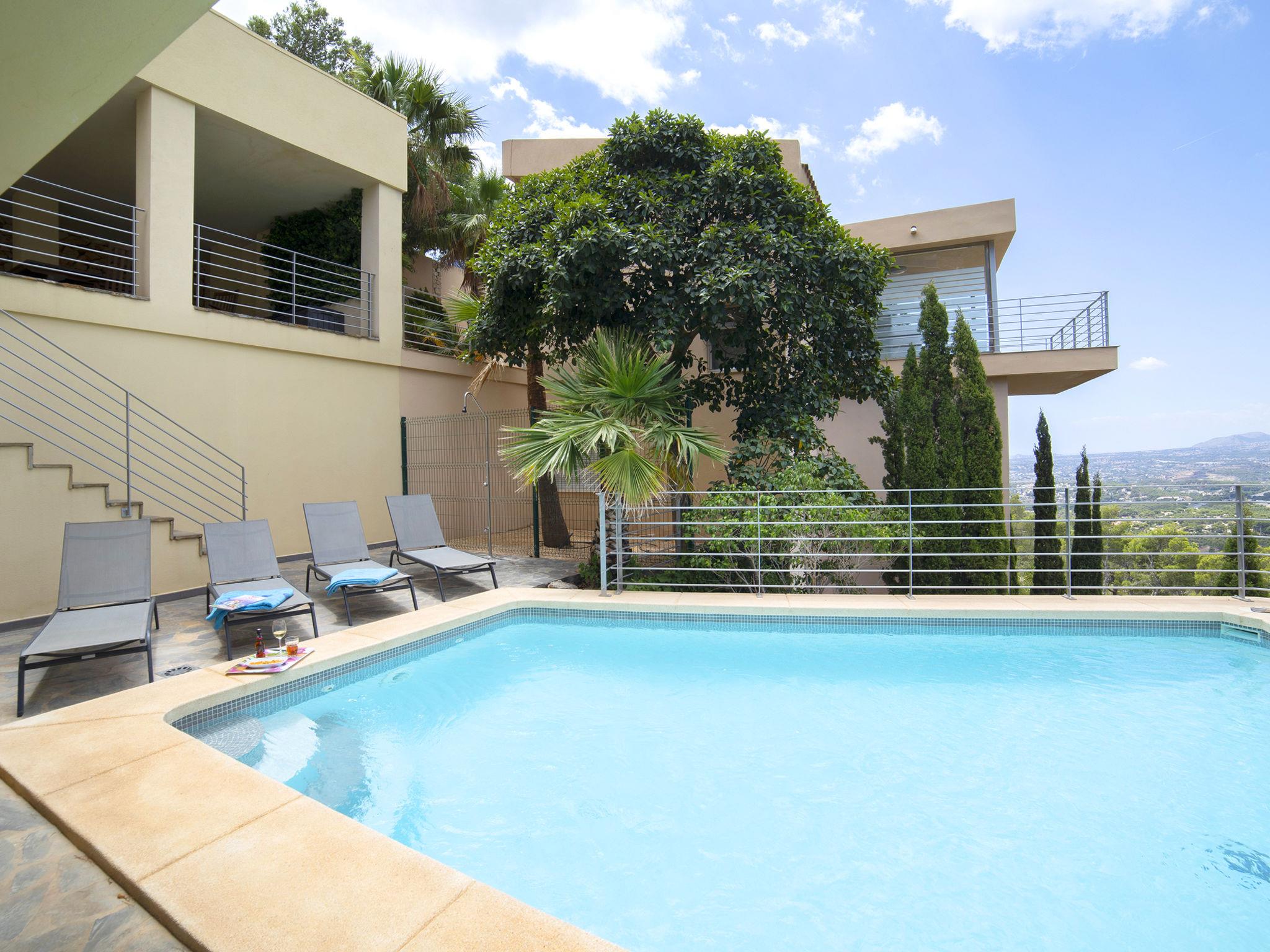 Altea Hills: Die im Haus installierten Sonnenkollektoren machen es autark bei der Erzeugung von Strom für den Eigenverbrauch. Moderne, schöne Villa "La Estrella", auf 2 Stockwerken. Im Ort, 7 km vom Zentrum von Altea, 9 km vom Zentrum von Calpe, ruhige, sonnige, erhöhte Lage im Villenviertel, verkehrsberuhigte Zone, 4 km vom Meer, 4 km vom Strand, in einer Sackgasse. Zur Alleinbenutzung: Grundstück 863 m2 (eingezäunt), schöner, gepflegter Garten, Schwimmbad (6 x 5 m, saisonale Verfügbarkeit: 01.Jan. - 31.Dez.). Aussendusche, Terrasse, Grill. Treppenweg bis zum Haus. Parkplatz (für 2 Autos). Supermarkt 3 km, Restaurant 4 km, Bushaltestelle 5.2 km, Felsstrand "Playa de l´Olla" 4 km. Sporthafen 4 km, Jacht-Hafen 4 km, Golfplatz (9 Loch) 6 km, Segelschule 4 m. Nahe gelegene Sehenswürdigkeiten: Aqualandia, Mundomar, Terra Mítica, Terra Natura, Benidorm Palace (Benidorm), Les Fonts de l'Algar, Castillo de Guadalest. Der Besitzer akzeptiert keine Jugendgruppen.