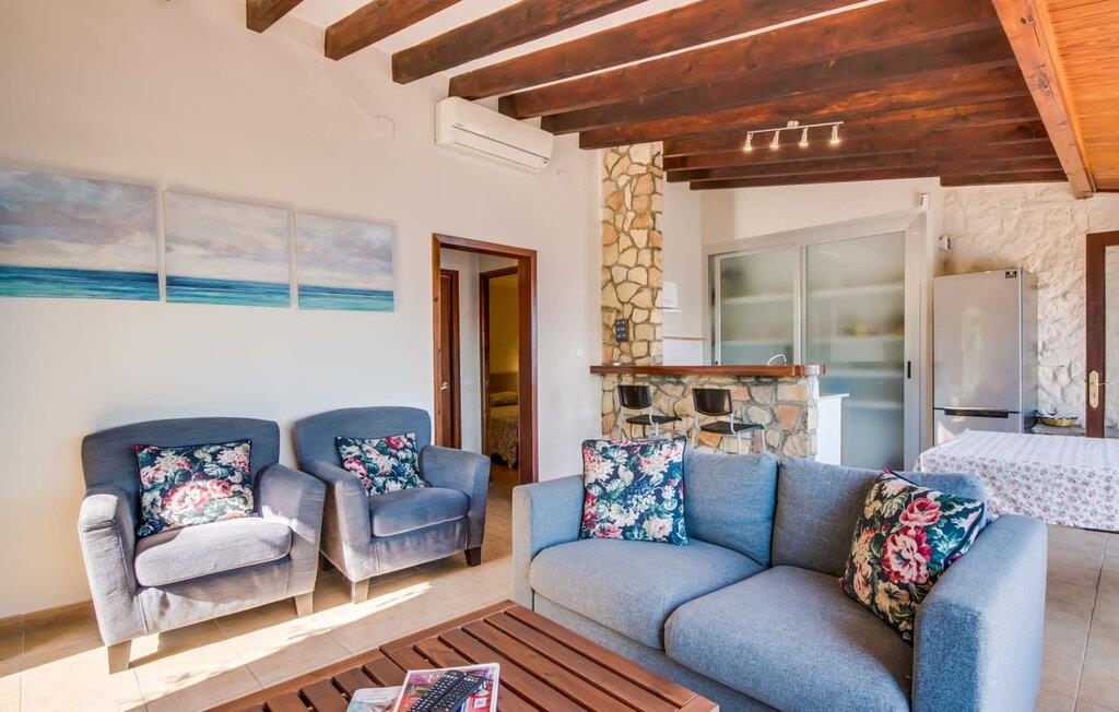 Die aus Naturstein erbaute Villa verfügt über zwei Sonnenterrassen, die nahtlos in einen hellen Wohnbereich mit großen Fenstern übergehen. Gäste können sich auf den Gartenmöbeln oder den entspannenden Sonnenliegen bei einem erfrischenden Getränk entspannen und die ruhige Atmosphäre genießen.