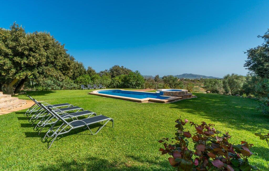 Das Anwesen ist von einer wunderschönen Naturlandschaft mit Zypressen, Oliven-, Johannisbrot- und Mandelbäumen sowie blühenden Gärten und weitläufigen Rasenflächen umgeben. Ein Highlight der Finca ist der einzigartige Poolbereich mit seinem blau gekachelten Becken und dem herrlichen Whirlpool, der bequem über eine Treppe erreichbar ist. Die lange, überdachte Terrasse neben dem Haus eignet sich hervorragend für gemeinsame Mahlzeiten und ermöglicht es Ihnen, gemeinsam die Aussicht zu genießen.