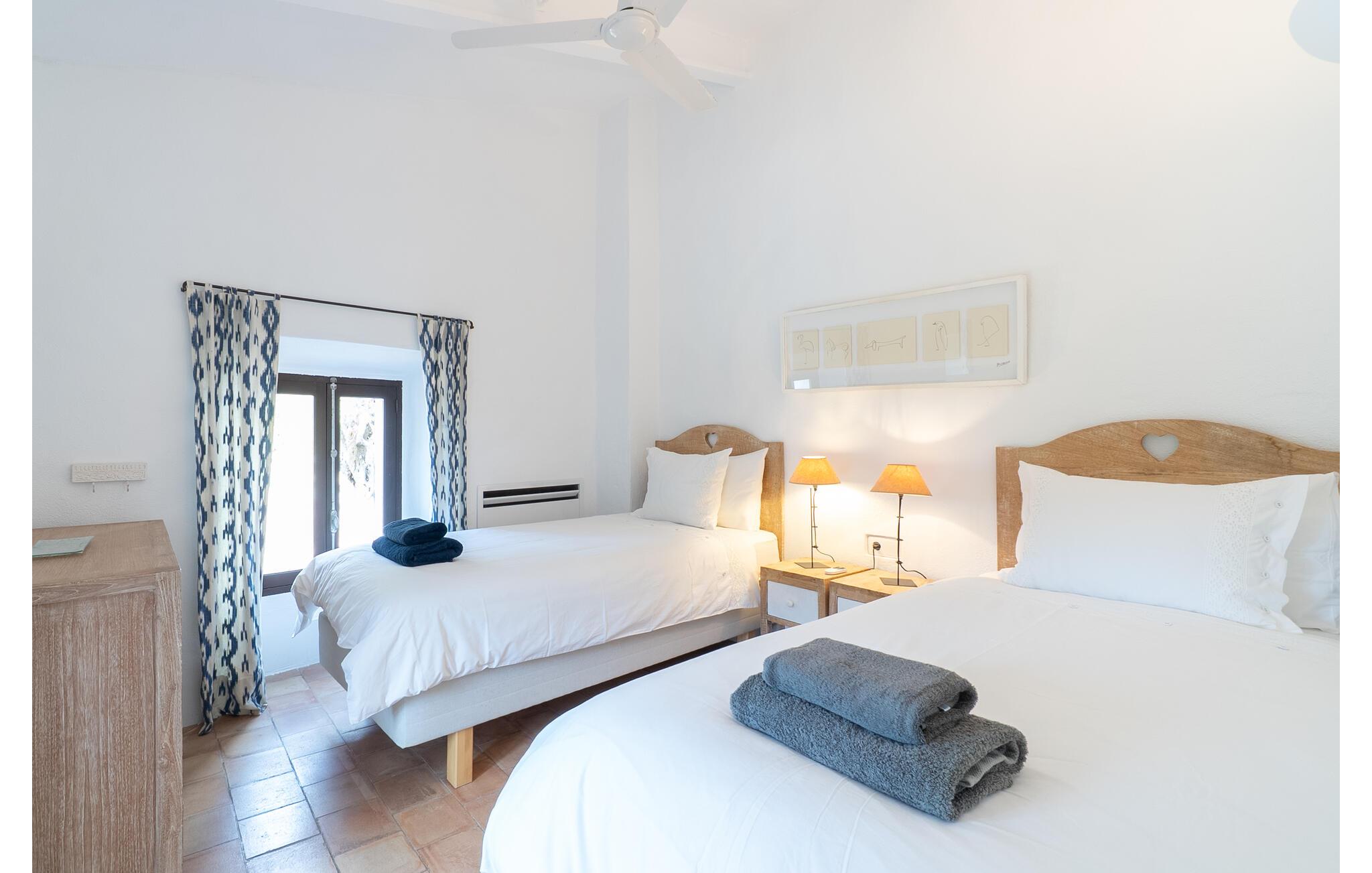 Der Innenraum passt perfekt zur wunderbar natürlichen Schönheit des Außenbereichs. Im Erdgeschoss finden Sie ein gemütliches Wohnzimmer mit Kamin, wo Sie ein Glas köstlichen Malvasia-Wein, typisch für die Region, genießen können. Eine stilvolle, weiße und voll ausgestattete Küche beherbergt einen runden Esstisch; Es ist der perfekte Ort, um gemeinsam zu kochen. In diesem Raum befinden sich auch zwei antike Vitrinen, die beide durch ihre Rustikalität ins Auge fallen. Die Schlafzimmer sind besonders gemütlich und mediterran gestaltet. Ein Schlafzimmer ist mit einem Doppelbett ausgestattet, das zweite Schlafzimmer hat zwei Einzelbetten. Beide Badezimmer verfügen über ein geschmackvolles und charmantes Design mit Akzenten in Gold, Marineblau und natürlichem Bruchstein.