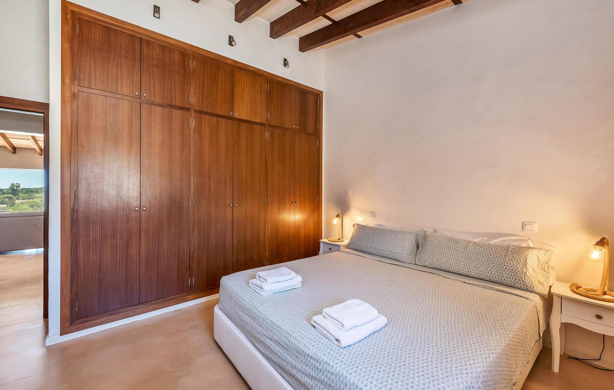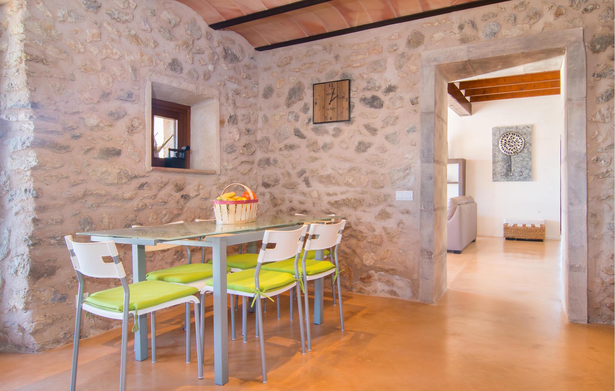 Dank seiner erhöhten Lage kommen Sie in dieser bezaubernden Finca in den Genuss atemberaubender Ausblicke auf die sanfte Hügellandschaft. Lassen Sie sich vom geschmackvoll eingerichteten Interieur und charmanten Details begeistern: Im Eingangsbereich erinnern die dreieckigen Milchglasfenster daran, dass sich in diesem ursprünglichen Bauernhaus einst der Kuhstall befand. Bereiten Sie in der hochwertigen Küche Ihre Mahlzeiten zu und lassen Sie sich für einen Filmabend auf dem bequemen Sofa nieder, wo an kühleren Tagen der Kamin für zusätzliche Behaglichkeit sorgt.