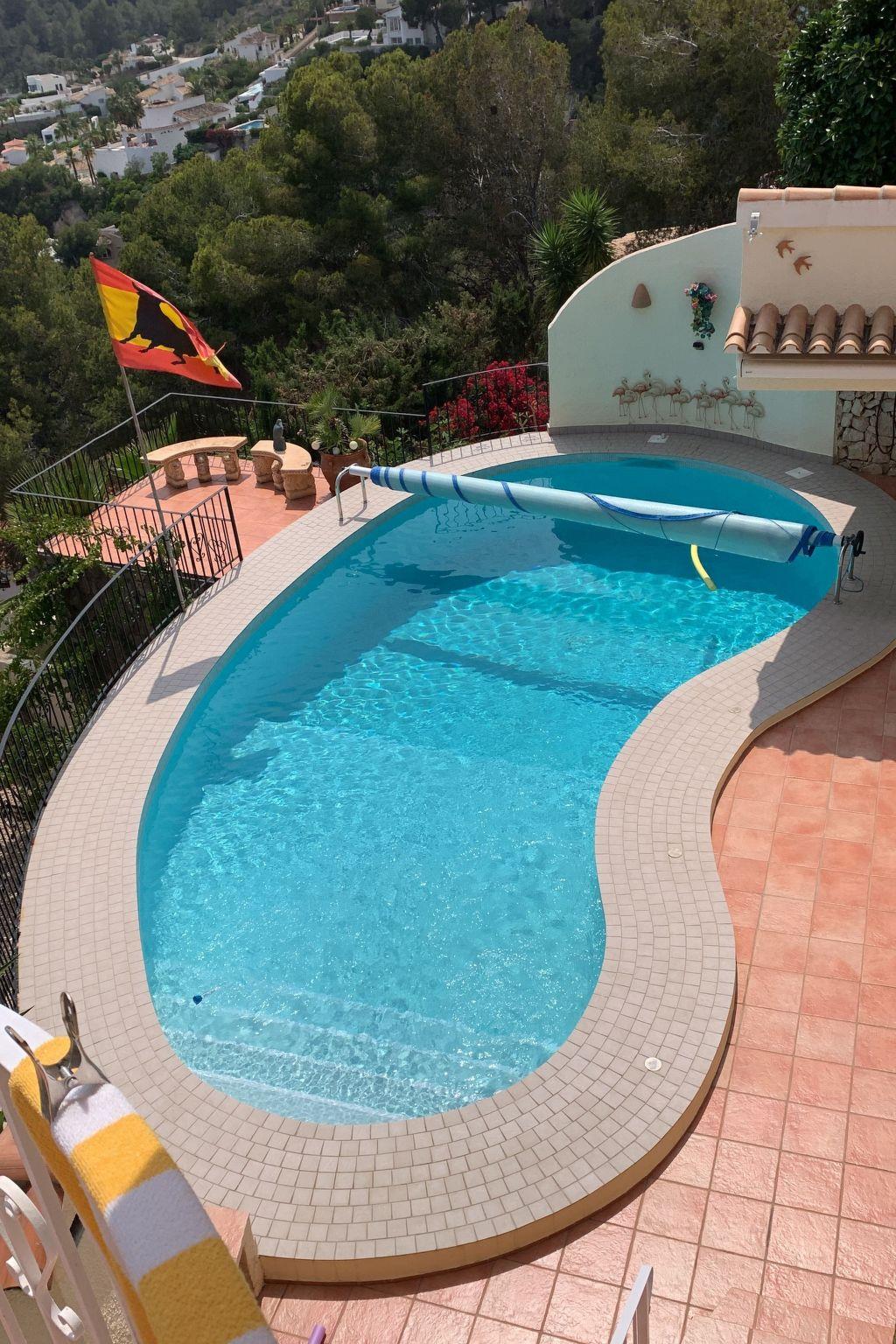 Es gibt zwei gedeckte Balkone. Zur Wohnung mit einem eigenen Pool (5x10m, Tiefe: 120-250cm)) gehört auch eine Poolterrasse mit Barbecue und Gartenmöbeln und eine weitere Terrasse. Ein beschatteter Parkplatz für das Auto ist vorhanden.