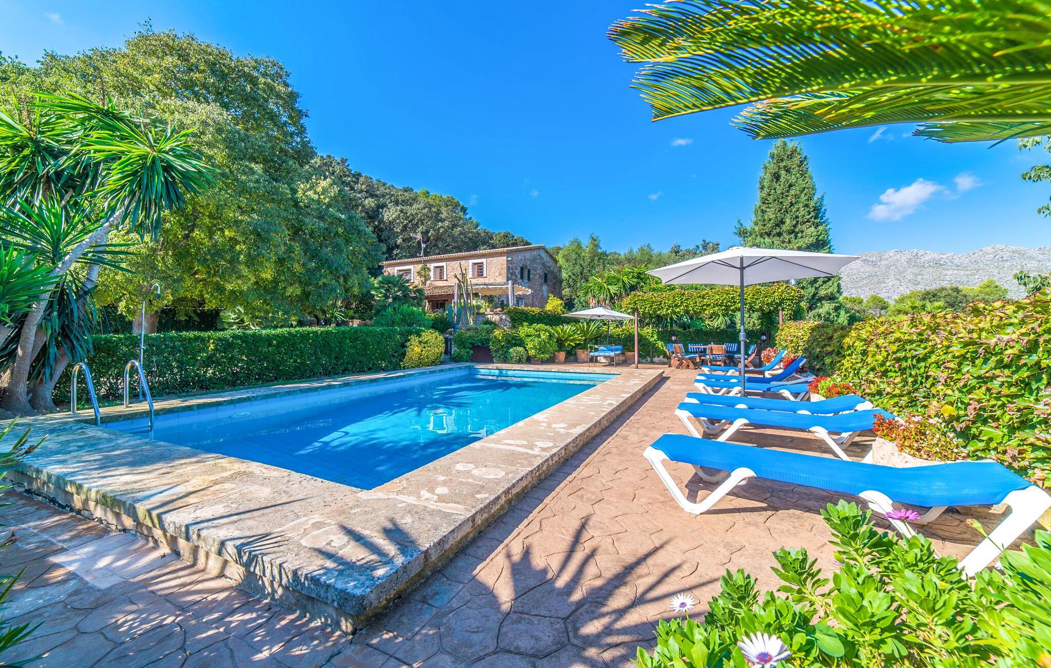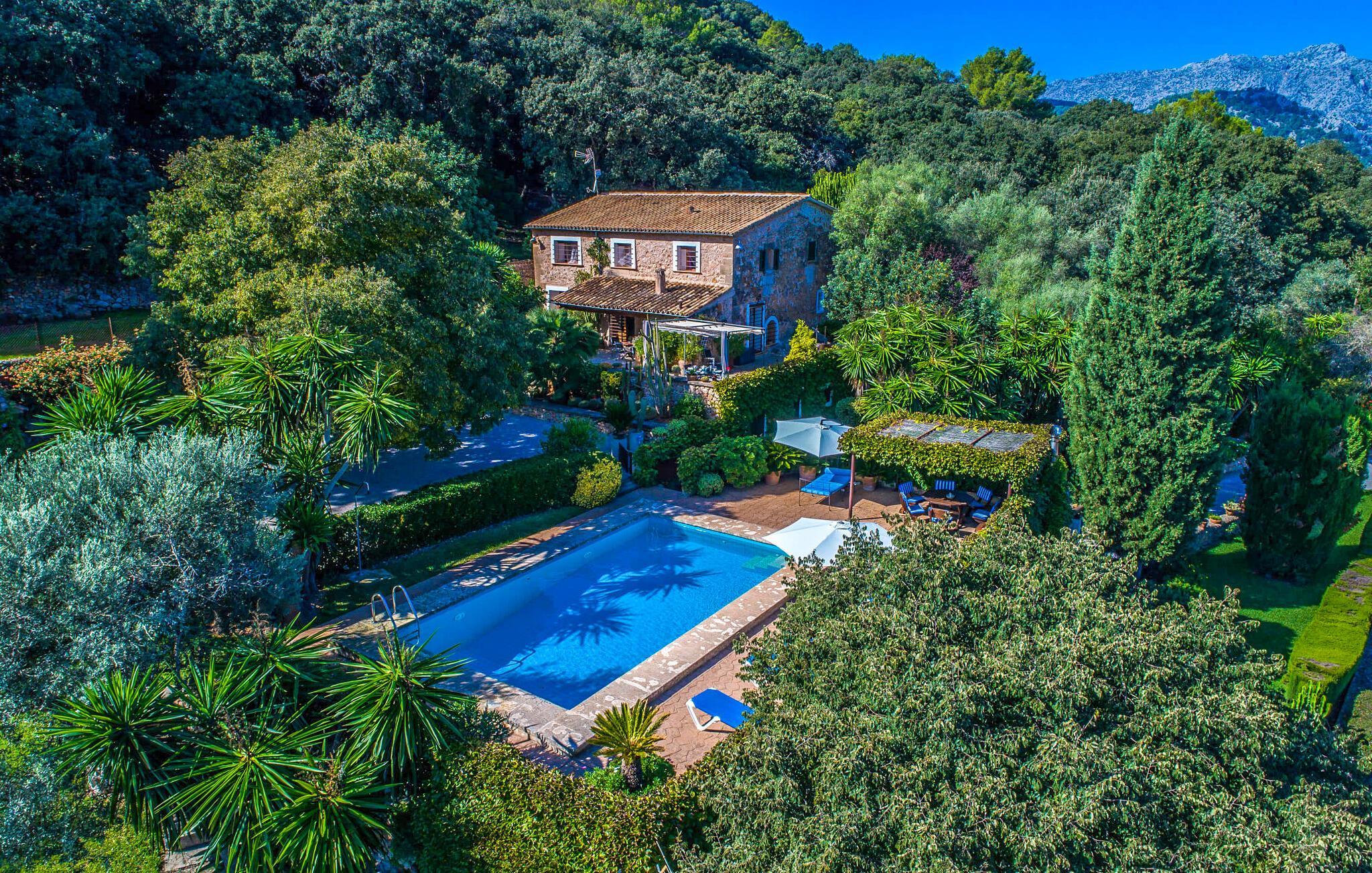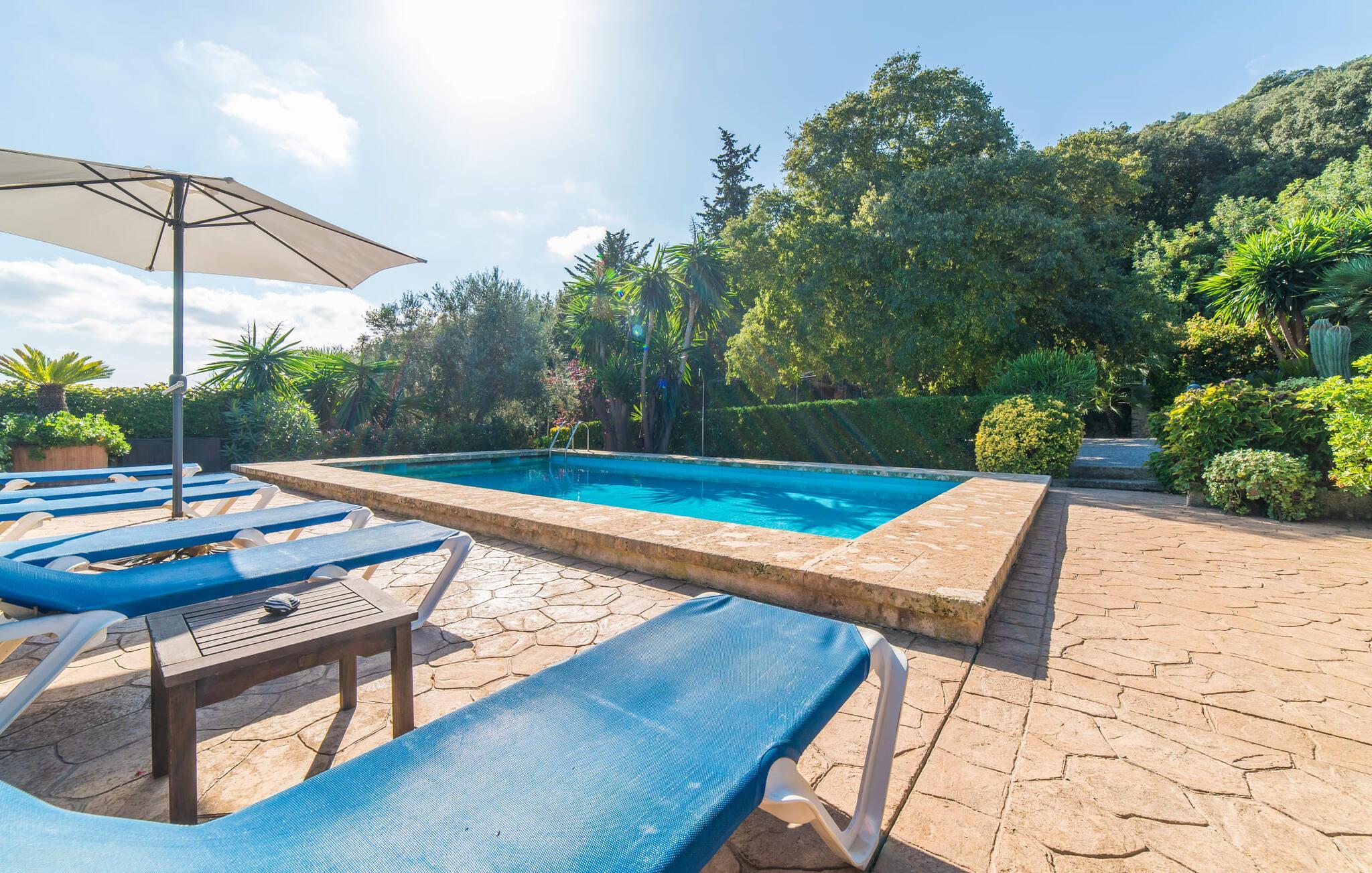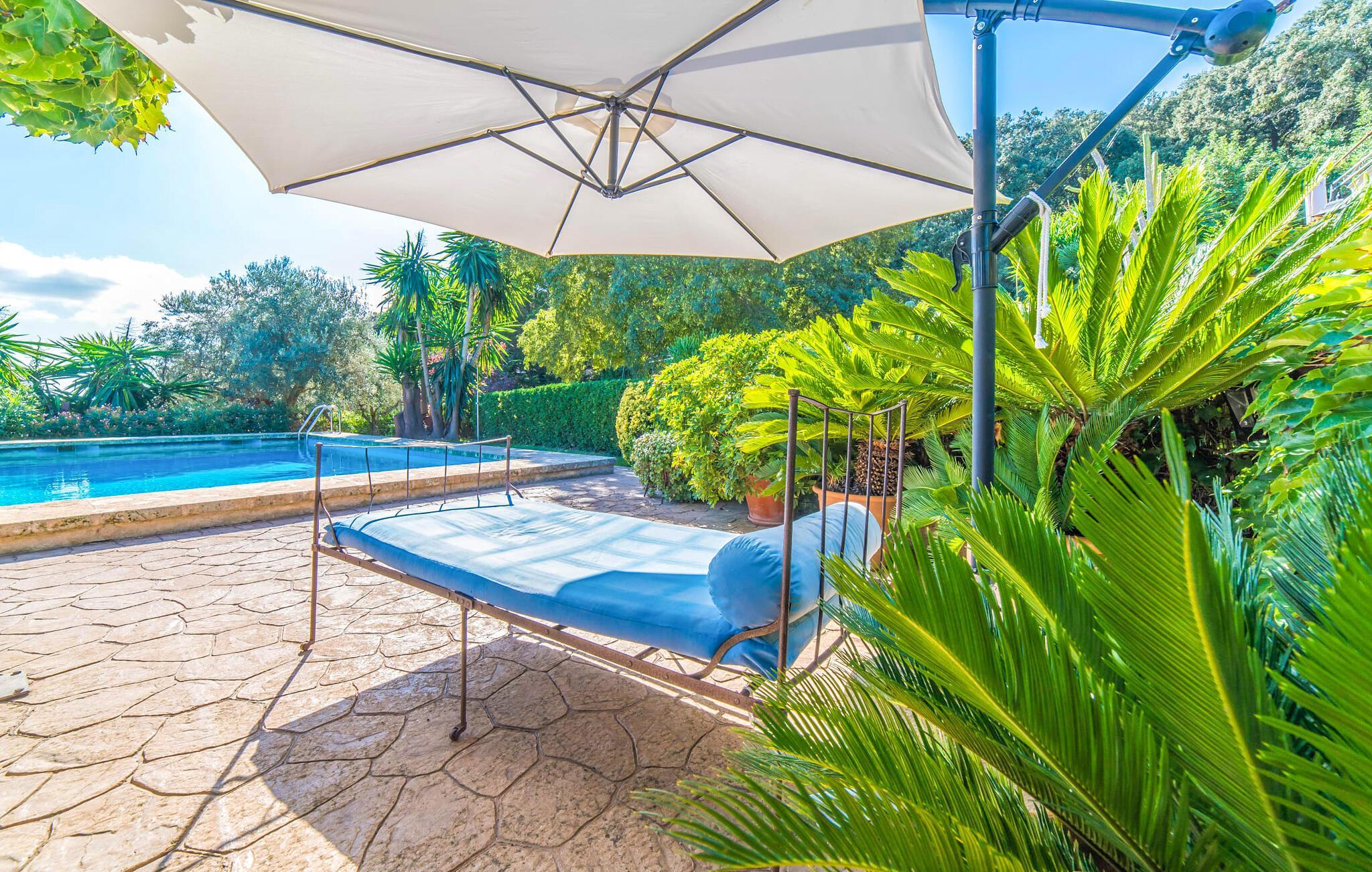 Wenn Sie Ihre Zeit auf der Insel im Grünen und in der Nähe der Natur verbringen möchten, ist die Villa „Ca les Estamenyes“ genau das Richtige für Sie – die Region hat es geschafft, ihren authentischen Charakter zu bewahren und dennoch einige überraschende Entdeckungen in petto zu haben. Dass man für die eine oder andere Entdeckung nicht weit fahren muss, sondern auf dem Anwesen bleiben kann, ist einer der vielen Pluspunkte dieses durch und durch einzigartigen Kleinods. Die Art und Weise, wie es sich an den bewaldeten Hang des hügeligen Nordens schmiegt, hat einen gewissen Postkarten-Charme: Hier können Sie sich rund um den Pool rundum sicher und gesund fühlen, geschützt durch Bäume, Pflanzen und das positive Gefühl, das rund um die Villa spürbar ist. Es wird mehr geboten als nur ein Sprung in den Pool. Hier spürt man ein Gefühl von einer anderen Zeit. Die Poolterrasse verfügt über Sonnenliegen, eine Sitzecke unter einem Blätterdach sowie ein Himmelbett, das tagsüber auch mit Sonnenschirm genutzt werden kann und somit vielfältige Möglichkeiten bietet, die laue Inselluft zu genießen und zu nutzen Genießen Sie die entspannte Urlaubsatmosphäre, um spannende Pläne zu schmieden – ob Sie sich auf die Heimkehr oder das abendliche Grillen konzentrieren, Sie haben die Wahl. Freiheit ist schließlich das Motto eines angenehmen Villenaufenthalts. Auch Ihre Kinder werden von den geheimen Ecken, die sich im abwechslungsreichen Außenbereich verbergen, begeistert sein. Neben der urig-ländlich dekorierten Veranda gibt es noch einen weiteren Sitzbereich inklusive Markise; Wenn Sie auf der Suche nach einem schönen Ort zum Zusammensitzen sind, können Sie die Dinge auf jeden Fall frisch halten.