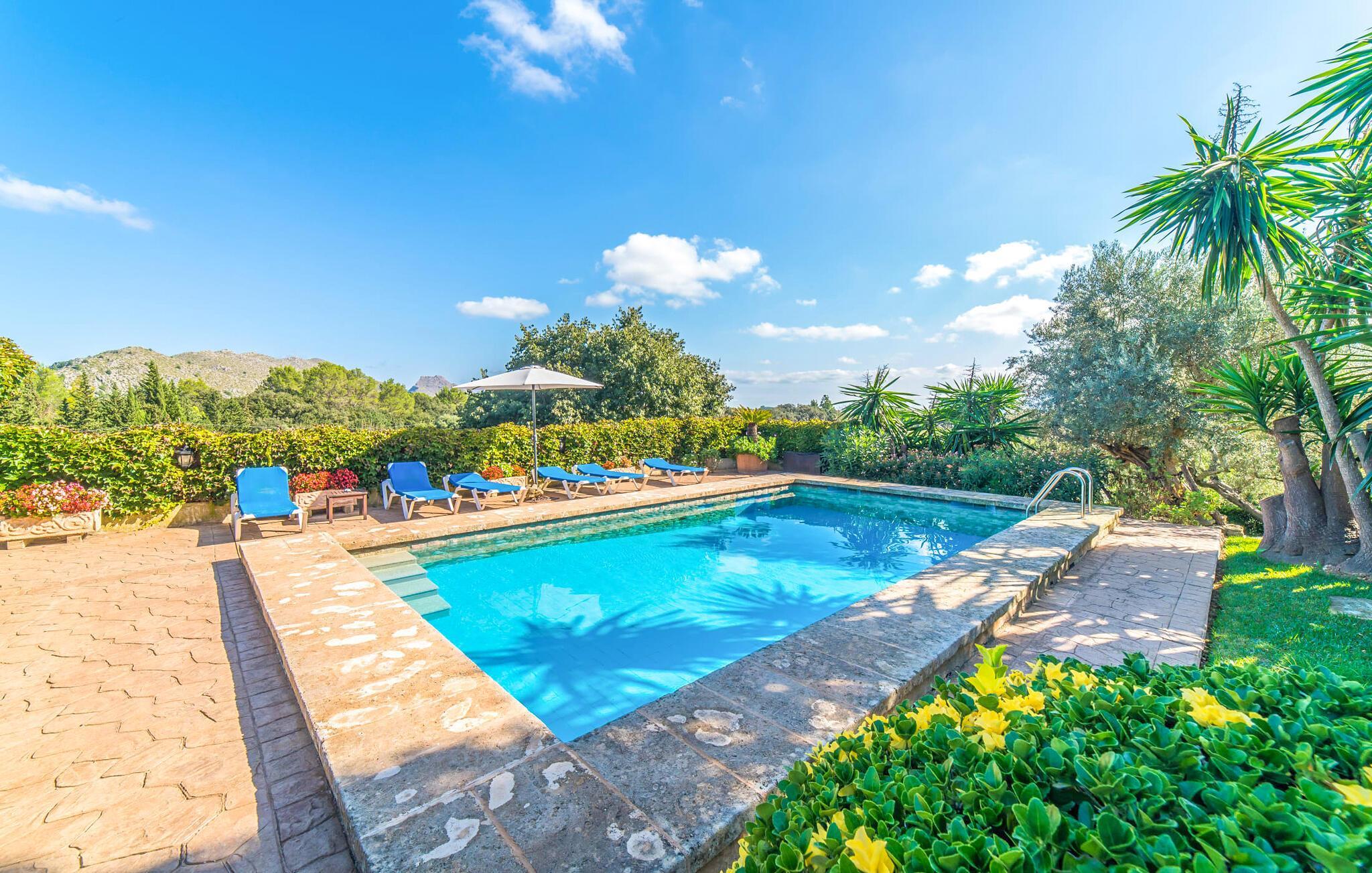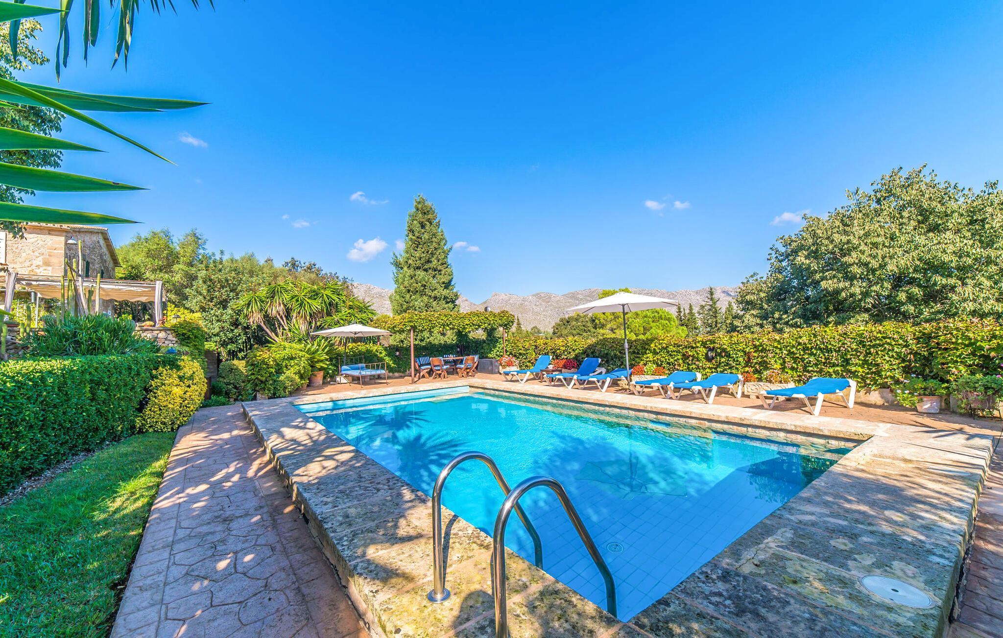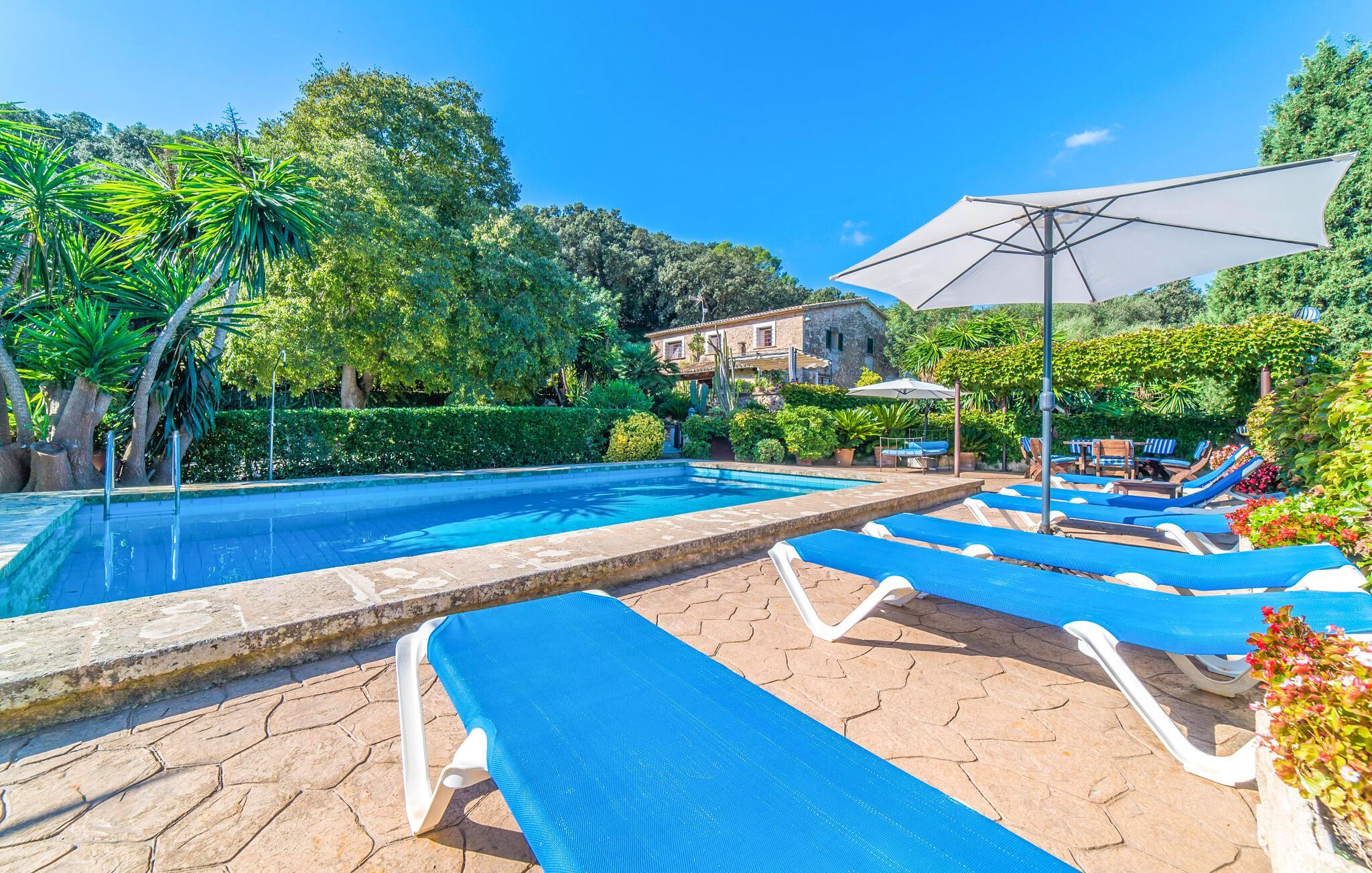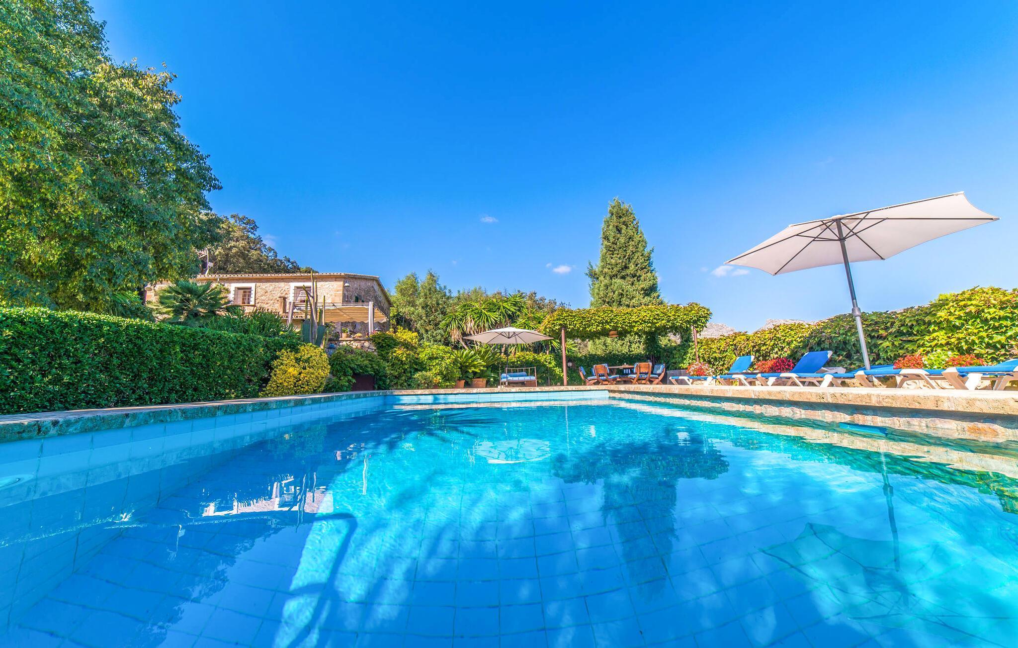 Wenn Sie Ihre Zeit auf der Insel im Grünen und in der Nähe der Natur verbringen möchten, ist die Villa „Ca les Estamenyes“ genau das Richtige für Sie – die Region hat es geschafft, ihren authentischen Charakter zu bewahren und dennoch einige überraschende Entdeckungen in petto zu haben. Dass man für die eine oder andere Entdeckung nicht weit fahren muss, sondern auf dem Anwesen bleiben kann, ist einer der vielen Pluspunkte dieses durch und durch einzigartigen Kleinods. Die Art und Weise, wie es sich an den bewaldeten Hang des hügeligen Nordens schmiegt, hat einen gewissen Postkarten-Charme: Hier können Sie sich rund um den Pool rundum sicher und gesund fühlen, geschützt durch Bäume, Pflanzen und das positive Gefühl, das rund um die Villa spürbar ist. Es wird mehr geboten als nur ein Sprung in den Pool. Hier spürt man ein Gefühl von einer anderen Zeit. Die Poolterrasse verfügt über Sonnenliegen, eine Sitzecke unter einem Blätterdach sowie ein Himmelbett, das tagsüber auch mit Sonnenschirm genutzt werden kann und somit vielfältige Möglichkeiten bietet, die laue Inselluft zu genießen und zu nutzen Genießen Sie die entspannte Urlaubsatmosphäre, um spannende Pläne zu schmieden – ob Sie sich auf die Heimkehr oder das abendliche Grillen konzentrieren, Sie haben die Wahl. Freiheit ist schließlich das Motto eines angenehmen Villenaufenthalts. Auch Ihre Kinder werden von den geheimen Ecken, die sich im abwechslungsreichen Außenbereich verbergen, begeistert sein. Neben der urig-ländlich dekorierten Veranda gibt es noch einen weiteren Sitzbereich inklusive Markise; Wenn Sie auf der Suche nach einem schönen Ort zum Zusammensitzen sind, können Sie die Dinge auf jeden Fall frisch halten.