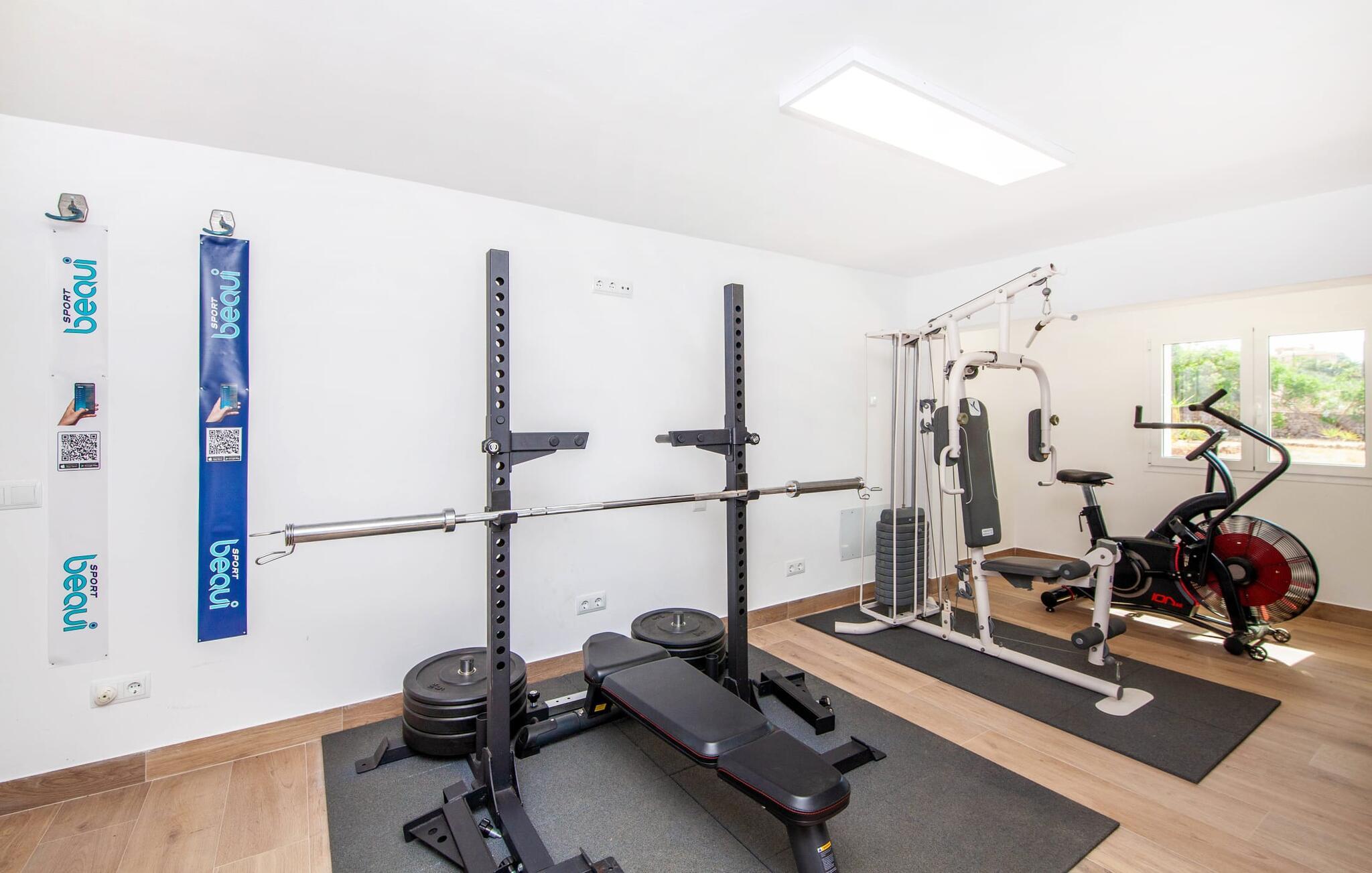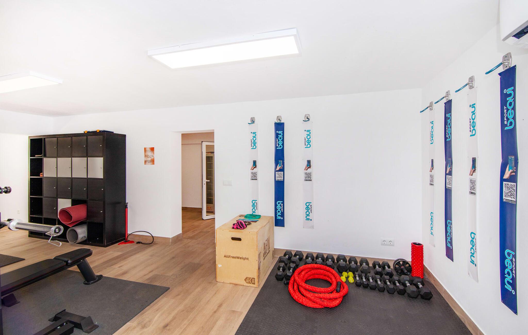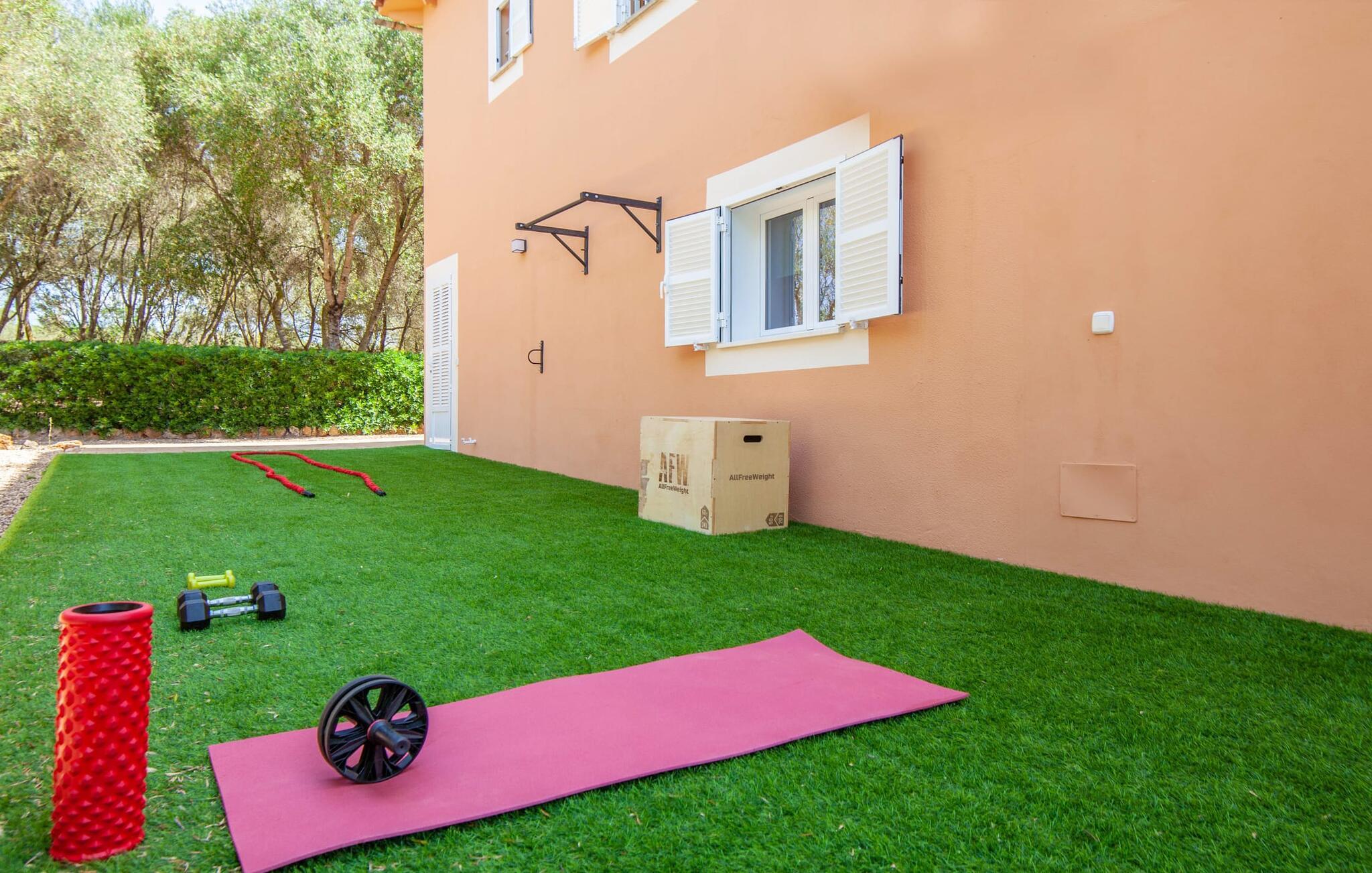 Der weitläufige, gepflegte Außenbereich ist mit Palmen bewachsen und schafft eine einladende Atmosphäre für das Leben im Freien. Ein Pool mit einer stilvollen Sonnenterrasse bietet den perfekten Ort zum Entspannen mit bequemen Liegen. Großzügige, möblierte Terrassen, von denen viele überdacht sind, bieten viel Platz zum Entspannen, während die vielseitige Außenküche das Leben im Freien zum Kinderspiel macht. Aktive Gäste werden die Vielfalt der Aktivitäten zu schätzen wissen, darunter der CrossFit-Bereich im Freien. Die Finca verfügt auch über eine Fahrradwerkstatt und liegt ideal in der Nähe von Radwegen.