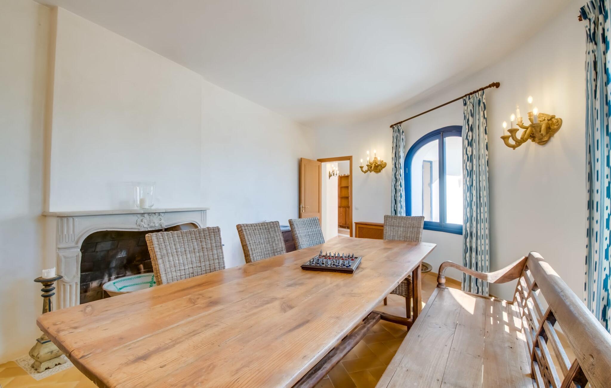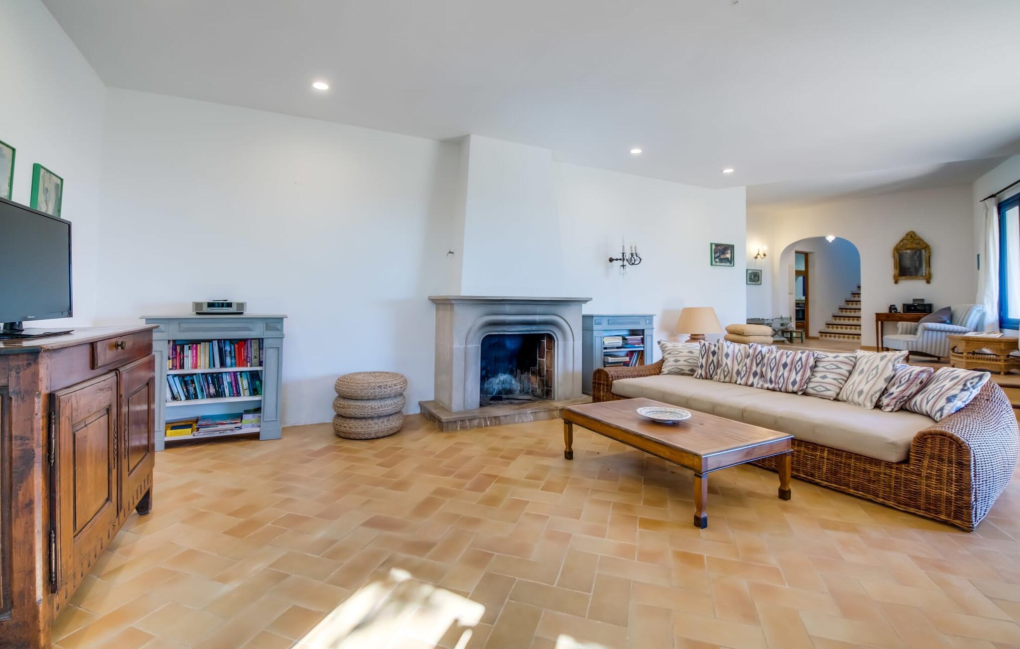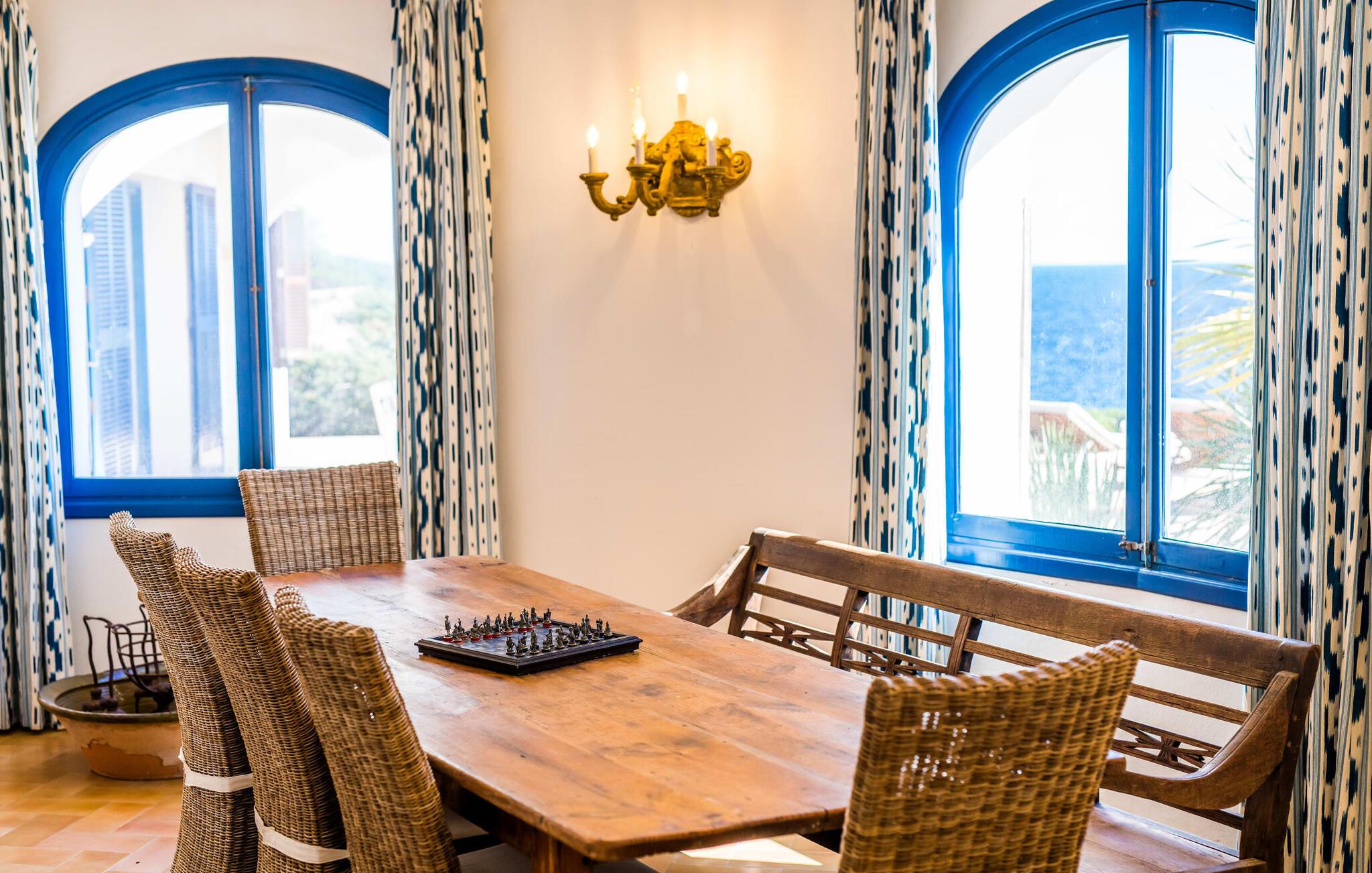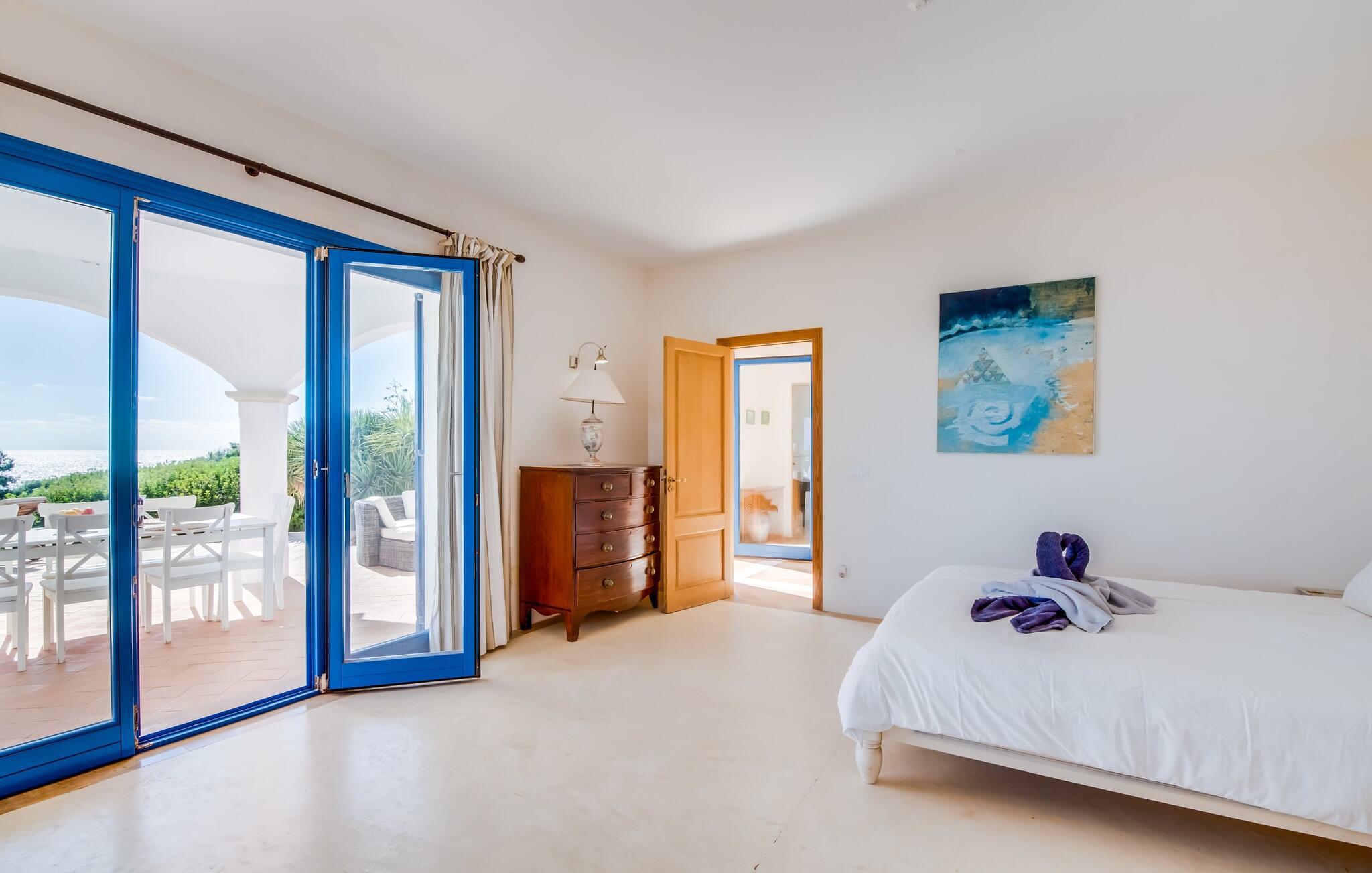 Die lichtdurchfluteten Räume der Villa verteilen sich auf zwei Flügel, verbunden durch einen Rundturm. Beide Flügel haben Zugang zur Terrasse mit Meerblick. Zwei der fünf Doppelschlafzimmer haben direkten Zugang zum Garten, während das große Hauptschlafzimmer mit angrenzendem Büro und einem Einzelzimmer direkt auf die Meerblickterrasse führt. Im Obergeschoss des Turms befindet sich ein weiteres Doppelzimmer mit Himmelbett und sensationellem Meerblick. Die Fenster verfügen über Fliegengitter und können mit Rollläden verdunkelt werden. Die geräumige, voll ausgestattete Küche mit zwei Kühlschränken befindet sich im Erdgeschoss des Turms. Auf dieser Etage befinden sich auch das große Wohnzimmer mit englischem Sat-TV und das Esszimmer, beide mit herrlichem Meerblick. In den kühleren Monaten sorgen mehrere Kamine und eine Fußbodenheizung (außer im Obergeschoss) für eine gemütliche Atmosphäre