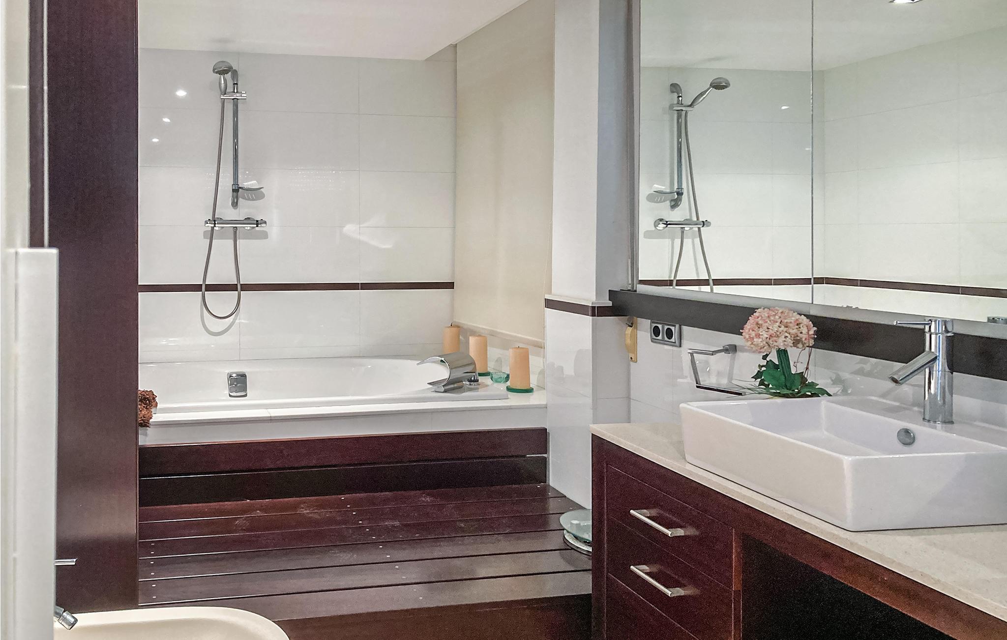 Diese geräumige Ferienwohnung in den oberen Etagen eines Apartmenthauses heißt Sie direkt am Strand willkommen. Die geschmackvolle Einrichtung und großen Fenster erfüllen die Räume nicht nur mit natürlichem Licht, sondern sorgen auch dafür, dass Sie mit Blick auf den Strand und das Meer auf dem Sofa sitzen oder beim Grillen auf der Dachterrasse Ihren Blick über das Meer schweifen können. Entspannen Sie in der Whirlpool-Badewanne oder nutzen Sie den Gemeinschaftspool, in dem Sie am Morgen die ersten Bahnen ziehen können, während Ihre Lieben noch schlummern oder schon das Frühstück zubereiten. Auch Sport kommt nicht zu kurz, denn Sie können sich beim Paddle-Tennis verausgaben, bevor Sie zum Strand gehen.