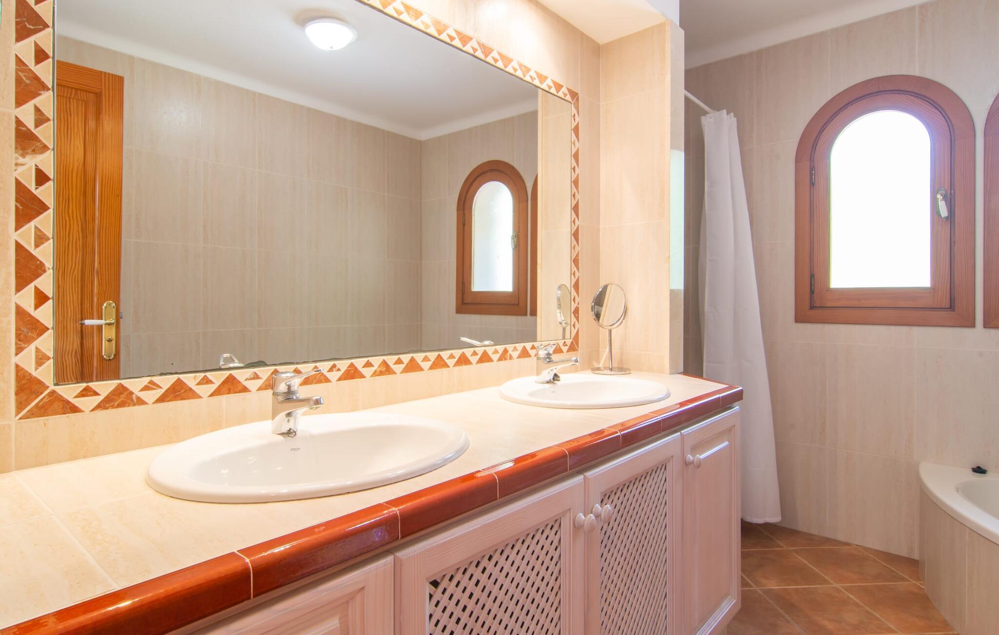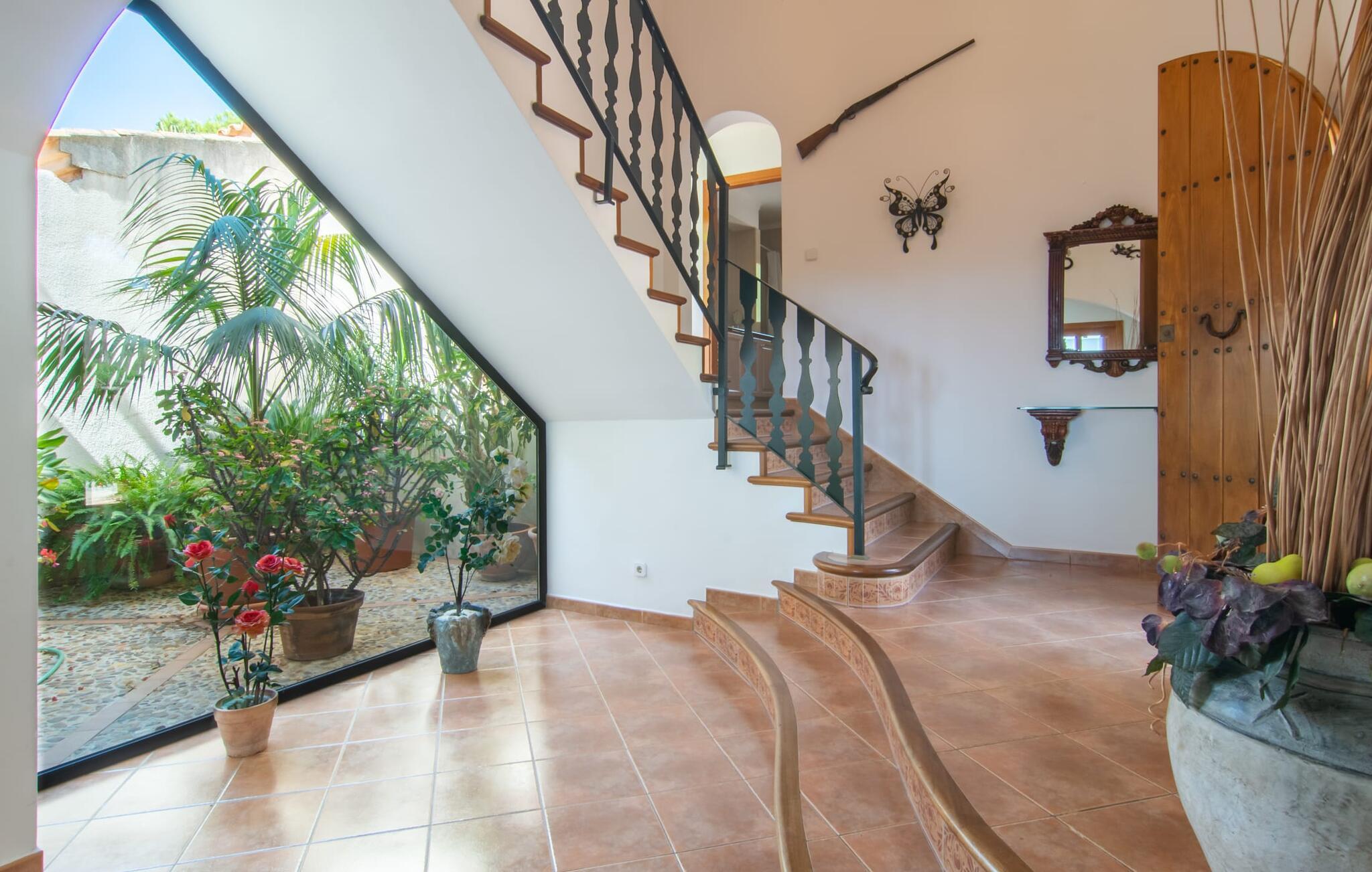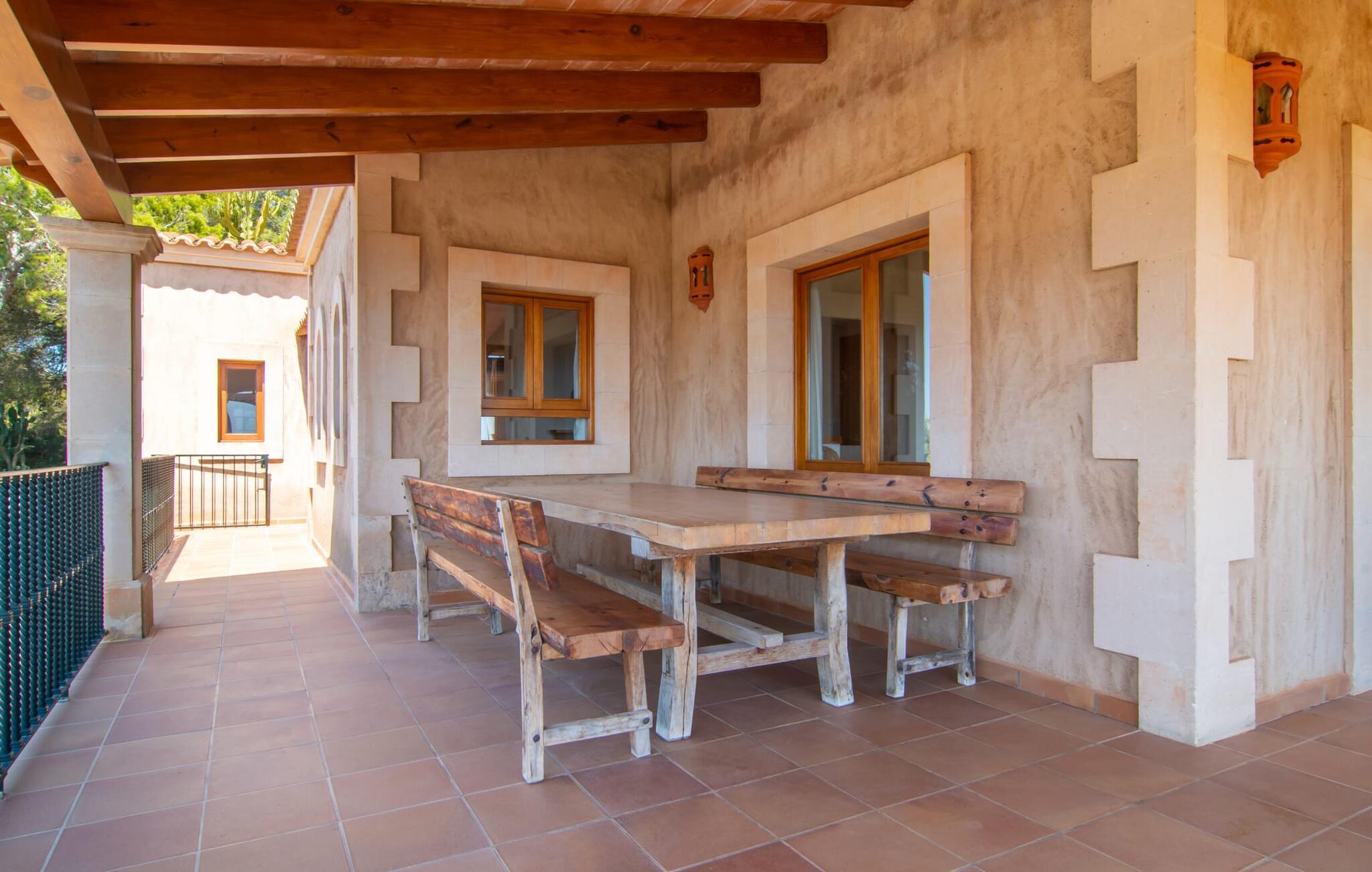 Im Inneren besticht das Ferienhaus durch eine harmonische Einrichtung mit mokkafarbenen Bodenfliesen und hochwertigen Holzmöbeln. Der Wohnbereich verfügt über einen dekorativen Kamin, während der Essbereich an eine Küche angrenzt, die modernen Komfort mit traditionellem mallorquinischem Charme verbindet. Die Finca bietet Platz für bis zu acht Gäste und verfügt über vier Schlafzimmer, von denen eines über ein eigenes Bad verfügt. Jedes Badezimmer spiegelt Komfort und typisch mallorquinisches Design wider und macht „Es Puig s'Horta“ perfekt für Familien oder Freunde, die einen unvergesslichen Urlaub auf Mallorca verbringen möchten.