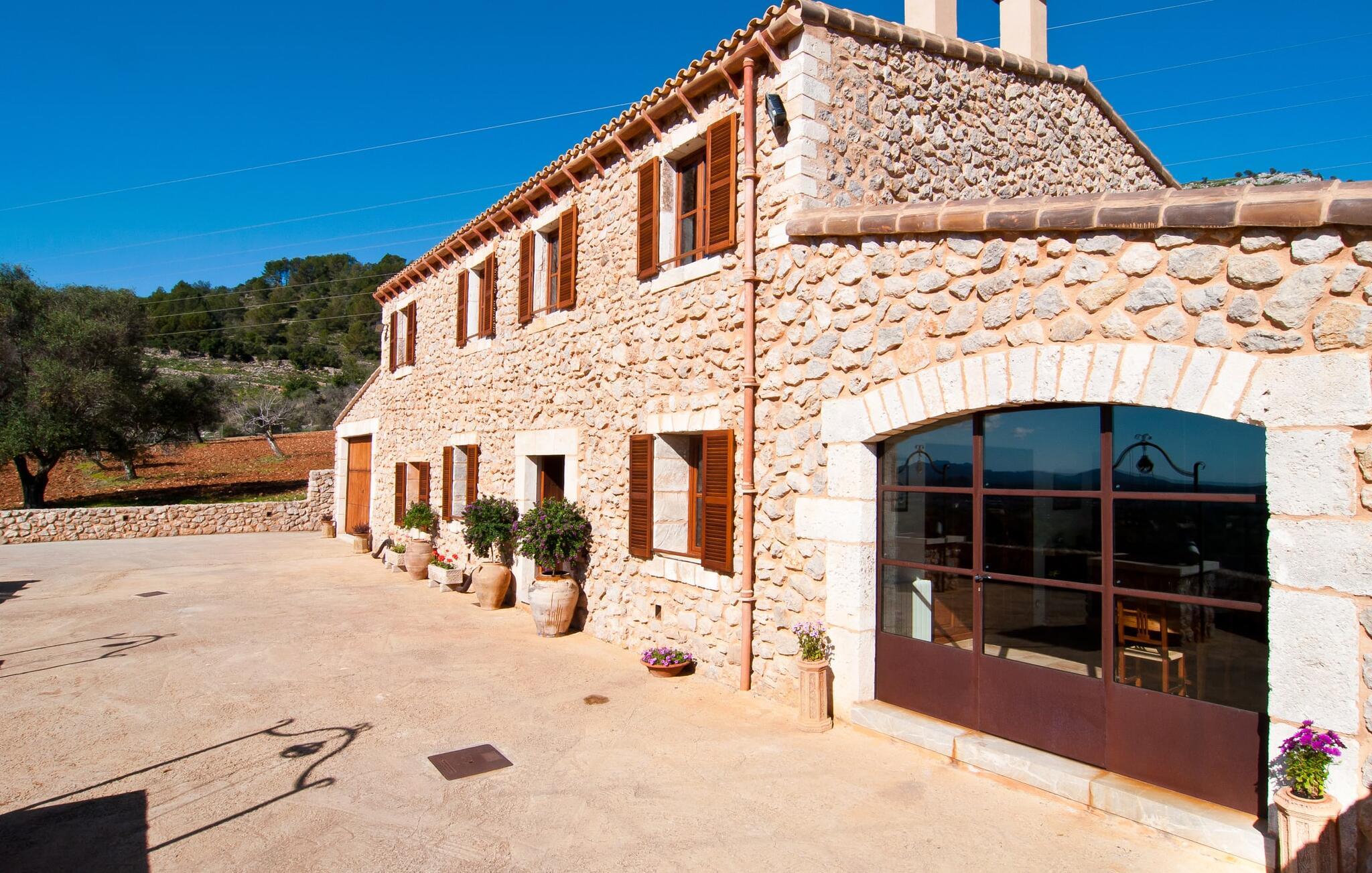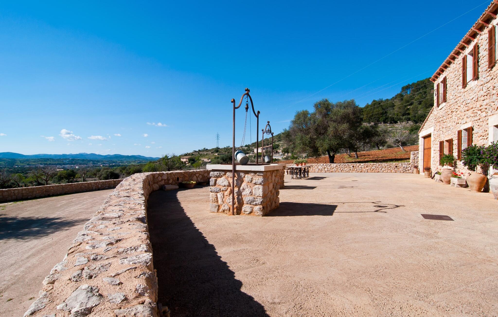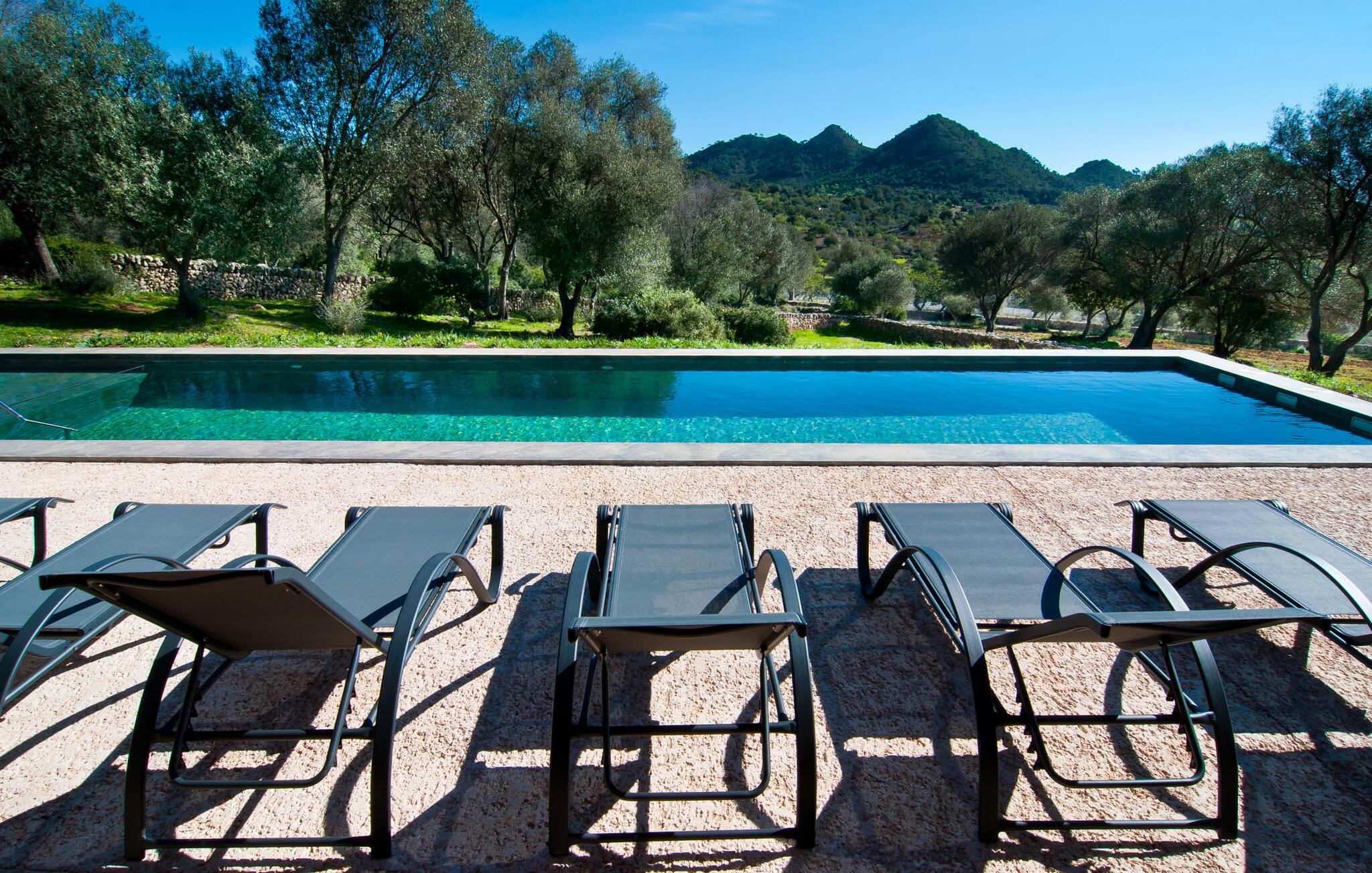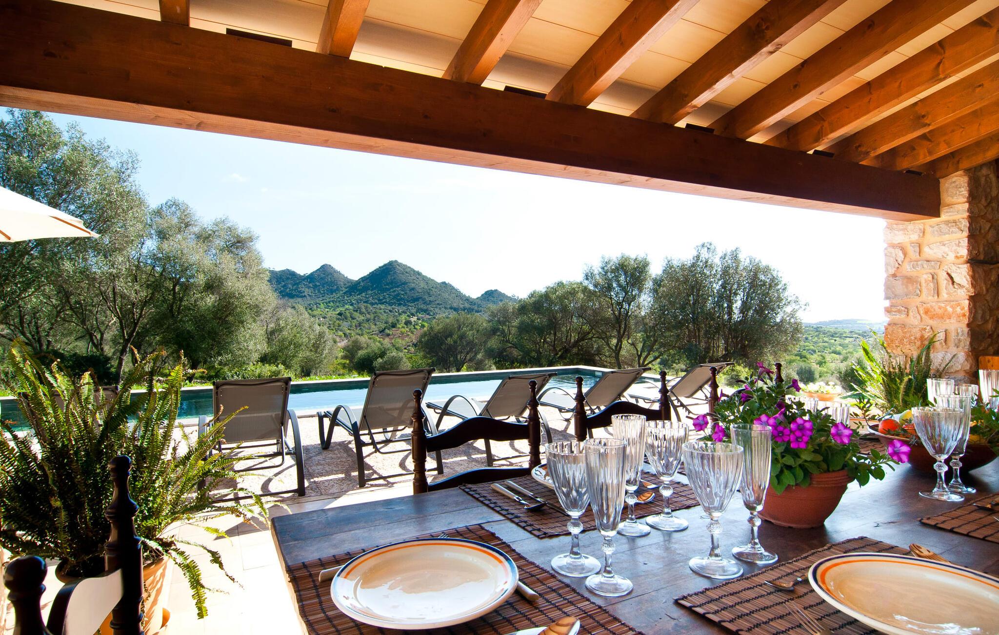 Schon beim Betreten der Villa „Esteparo“ fällt dem Besucher die typisch mallorquinische Architektur des Hauses – Naturstein, breite Wände, Fensterläden aus Holz – angenehm ins Auge. Das Anwesen verfügt über eine außergewöhnliche Größe von 175.000 m², wurde teilweise als dekoratives Atrium sowie einen wunderschönen Garten gestaltet und ist wunderschön in die hügelige Umgebung eingebettet. Die Eingangsfassade und der Vorhofbereich empfangen die Gäste in einer sehr gepflegten und geschmackvollen Atmosphäre. Es macht sofort Lust, einzutreten und den Innenraum zu betrachten. Doch bleiben wir zunächst im Außenbereich, denn hier gibt es einiges zu entdecken. Wenn Sie im Uhrzeigersinn um das Haus herumgehen, gelangen Sie auf den sehr einladenden überdachten Terrassenbereich, auf dem Sie im luftigen Schatten sitzen und einen wunderschönen Blick auf den Pool, den herrlich grünen Garten und weit darüber hinaus genießen können. Dies ist der ideale Ort, um den Tag morgens mit einem erfrischenden Frühstück zu begrüßen und Pläne für den aufregenden Tag zu schmieden, der vor Ihnen liegt. Ein nostalgischer, großer Holztisch mit Bank und Stühlen verleihen diesem Bereich in Kombination mit den beeindruckenden Holzbalken an der Decke ein ganz besonderes Flair. Das lässt sich auch am Abend genüsslich zelebrieren. Der direkt nebenan installierte fest installierte Grill wird hier sicherlich gute Dienste leisten und frische, regionale Köstlichkeiten zubereiten. Im übergroßen Pool können Sie sich nach Herzenslust erfrischen. Das Becken verfügt über einen besonders bequemen Einstieg und grenzt an die Lounge-Terrasse, auf der Sie unter mediterranem Himmel ausgiebig entspannen können. Wenn die Sonneneinstrahlung zu stark wird, kann und sollte ein Sonnenschirm zum Einsatz kommen. Insgesamt stehen Ihnen 10 bequeme Poolliegen zur Verfügung, weitere nette Sitzgelegenheiten warten in der Nähe des Pooleingangs.