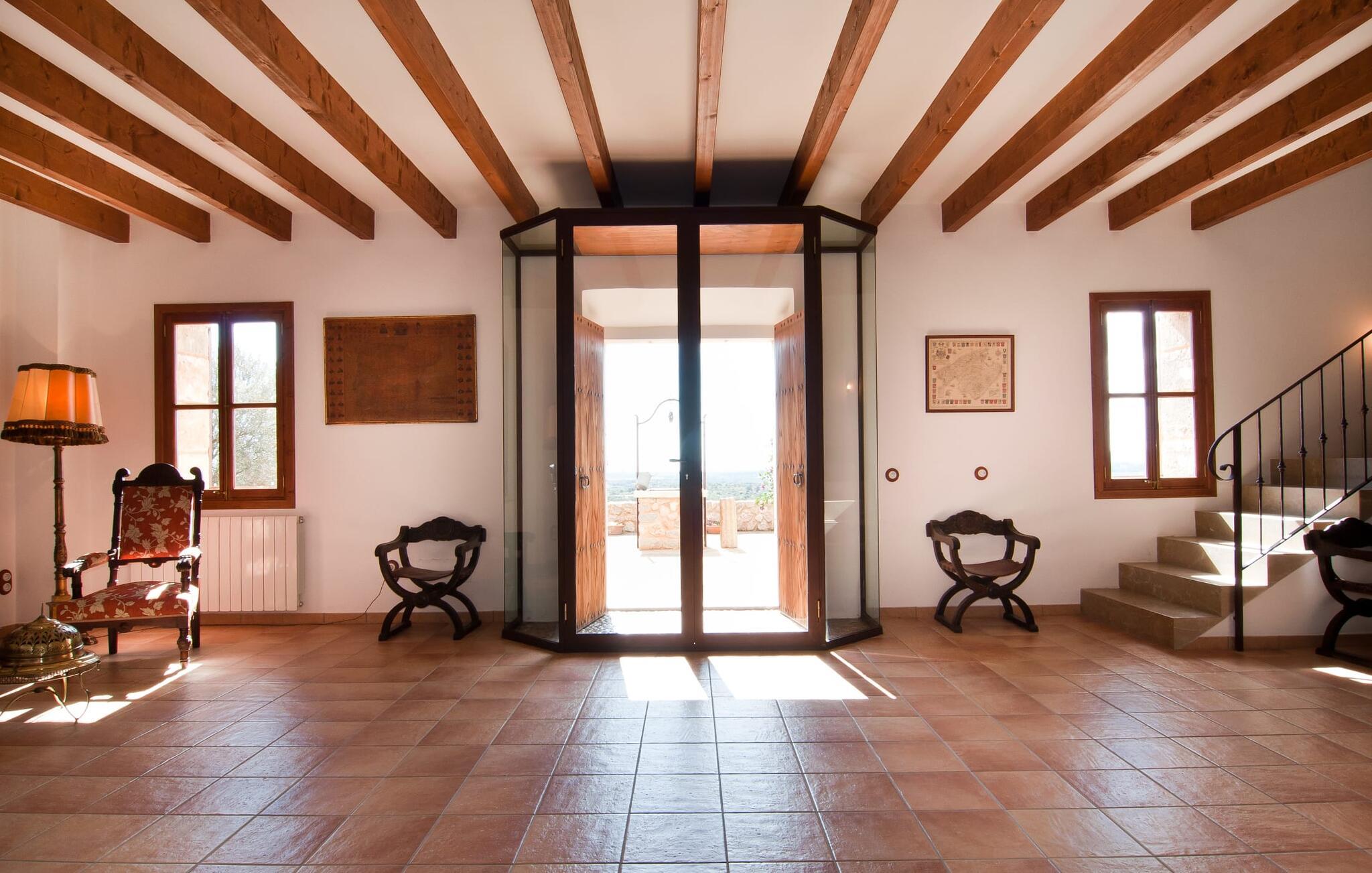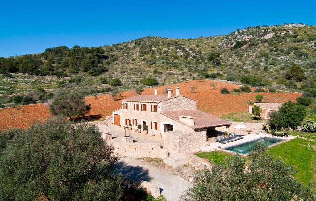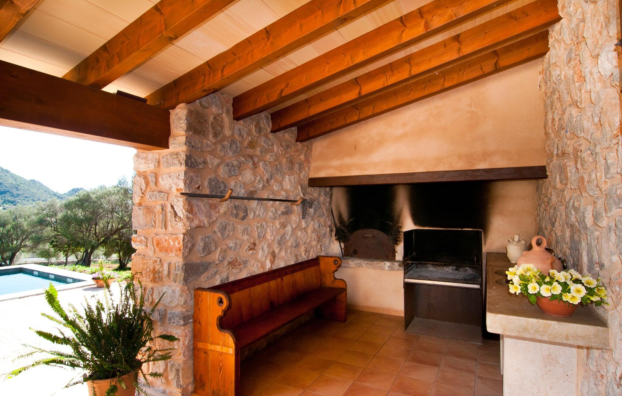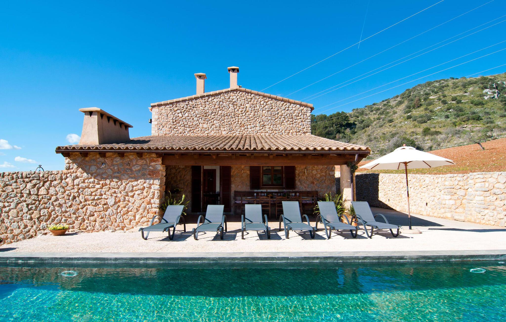 Schon beim Betreten der Villa „Esteparo“ fällt dem Besucher die typisch mallorquinische Architektur des Hauses – Naturstein, breite Wände, Fensterläden aus Holz – angenehm ins Auge. Das Anwesen verfügt über eine außergewöhnliche Größe von 175.000 m², wurde teilweise als dekoratives Atrium sowie einen wunderschönen Garten gestaltet und ist wunderschön in die hügelige Umgebung eingebettet. Die Eingangsfassade und der Vorhofbereich empfangen die Gäste in einer sehr gepflegten und geschmackvollen Atmosphäre. Es macht sofort Lust, einzutreten und den Innenraum zu betrachten. Doch bleiben wir zunächst im Außenbereich, denn hier gibt es einiges zu entdecken. Wenn Sie im Uhrzeigersinn um das Haus herumgehen, gelangen Sie auf den sehr einladenden überdachten Terrassenbereich, auf dem Sie im luftigen Schatten sitzen und einen wunderschönen Blick auf den Pool, den herrlich grünen Garten und weit darüber hinaus genießen können. Dies ist der ideale Ort, um den Tag morgens mit einem erfrischenden Frühstück zu begrüßen und Pläne für den aufregenden Tag zu schmieden, der vor Ihnen liegt. Ein nostalgischer, großer Holztisch mit Bank und Stühlen verleihen diesem Bereich in Kombination mit den beeindruckenden Holzbalken an der Decke ein ganz besonderes Flair. Das lässt sich auch am Abend genüsslich zelebrieren. Der direkt nebenan installierte fest installierte Grill wird hier sicherlich gute Dienste leisten und frische, regionale Köstlichkeiten zubereiten. Im übergroßen Pool können Sie sich nach Herzenslust erfrischen. Das Becken verfügt über einen besonders bequemen Einstieg und grenzt an die Lounge-Terrasse, auf der Sie unter mediterranem Himmel ausgiebig entspannen können. Wenn die Sonneneinstrahlung zu stark wird, kann und sollte ein Sonnenschirm zum Einsatz kommen. Insgesamt stehen Ihnen 10 bequeme Poolliegen zur Verfügung, weitere nette Sitzgelegenheiten warten in der Nähe des Pooleingangs.