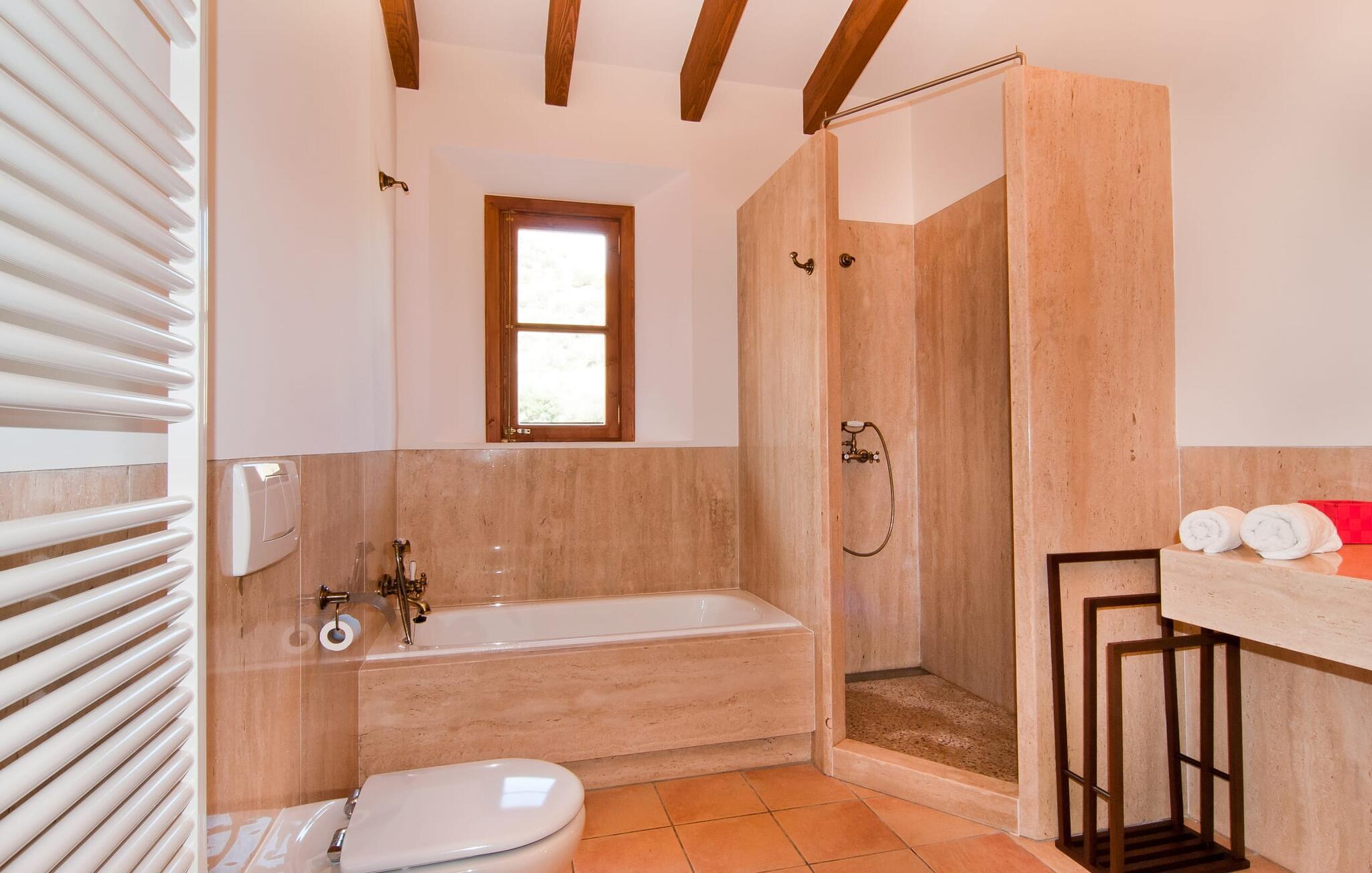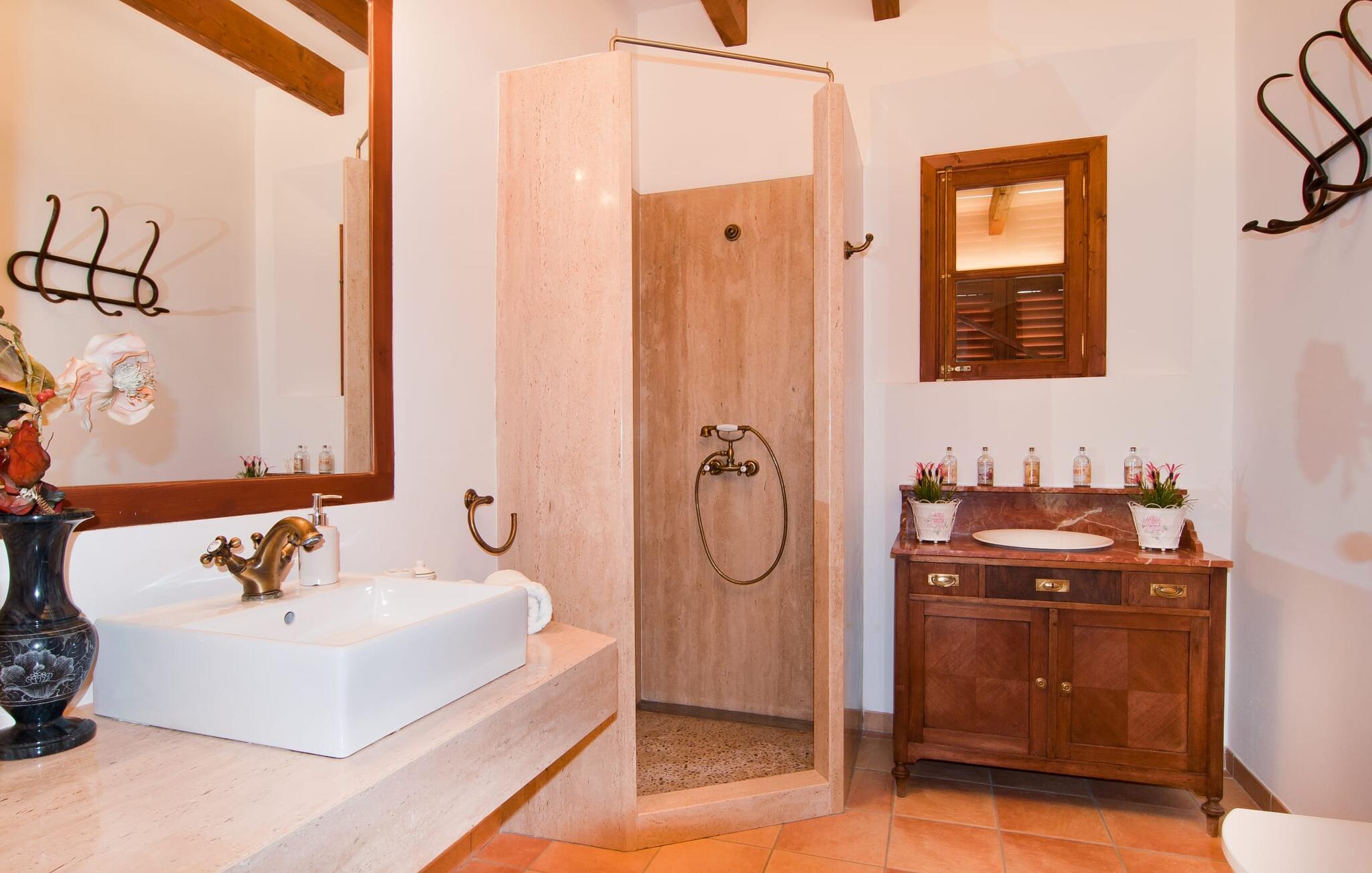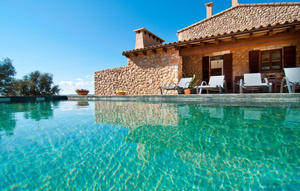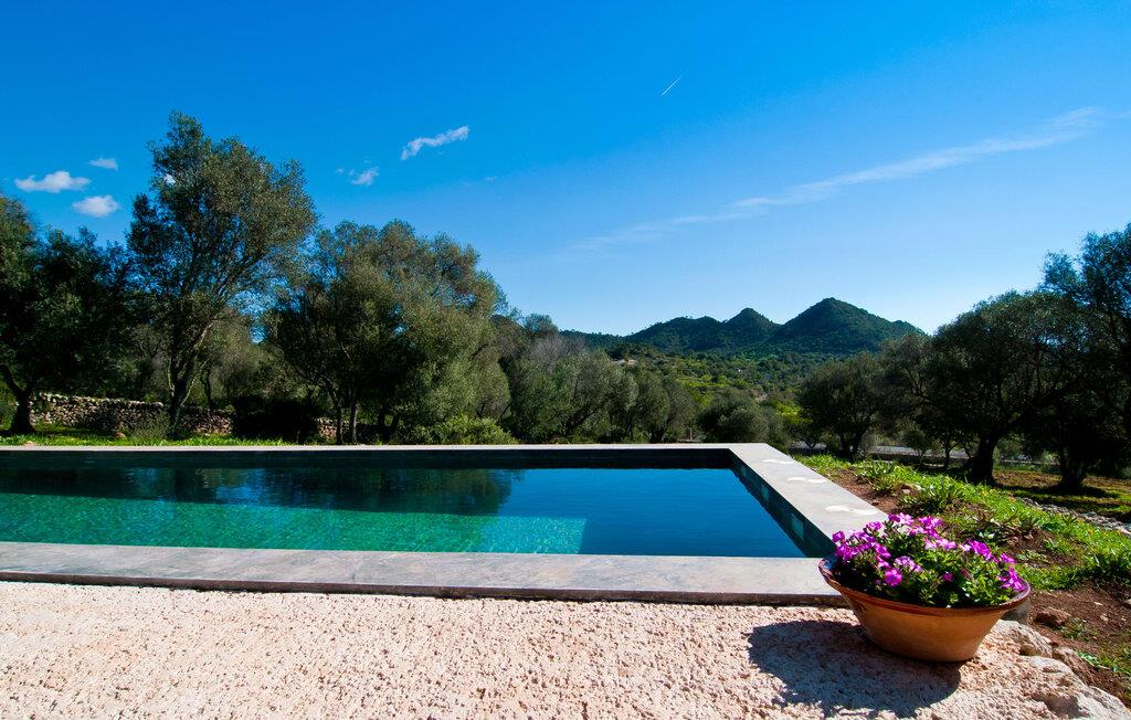 Schon beim Betreten der Villa „Esteparo“ fällt dem Besucher die typisch mallorquinische Architektur des Hauses – Naturstein, breite Wände, Fensterläden aus Holz – angenehm ins Auge. Das Anwesen verfügt über eine außergewöhnliche Größe von 175.000 m², wurde teilweise als dekoratives Atrium sowie einen wunderschönen Garten gestaltet und ist wunderschön in die hügelige Umgebung eingebettet. Die Eingangsfassade und der Vorhofbereich empfangen die Gäste in einer sehr gepflegten und geschmackvollen Atmosphäre. Es macht sofort Lust, einzutreten und den Innenraum zu betrachten. Doch bleiben wir zunächst im Außenbereich, denn hier gibt es einiges zu entdecken. Wenn Sie im Uhrzeigersinn um das Haus herumgehen, gelangen Sie auf den sehr einladenden überdachten Terrassenbereich, auf dem Sie im luftigen Schatten sitzen und einen wunderschönen Blick auf den Pool, den herrlich grünen Garten und weit darüber hinaus genießen können. Dies ist der ideale Ort, um den Tag morgens mit einem erfrischenden Frühstück zu begrüßen und Pläne für den aufregenden Tag zu schmieden, der vor Ihnen liegt. Ein nostalgischer, großer Holztisch mit Bank und Stühlen verleihen diesem Bereich in Kombination mit den beeindruckenden Holzbalken an der Decke ein ganz besonderes Flair. Das lässt sich auch am Abend genüsslich zelebrieren. Der direkt nebenan installierte fest installierte Grill wird hier sicherlich gute Dienste leisten und frische, regionale Köstlichkeiten zubereiten. Im übergroßen Pool können Sie sich nach Herzenslust erfrischen. Das Becken verfügt über einen besonders bequemen Einstieg und grenzt an die Lounge-Terrasse, auf der Sie unter mediterranem Himmel ausgiebig entspannen können. Wenn die Sonneneinstrahlung zu stark wird, kann und sollte ein Sonnenschirm zum Einsatz kommen. Insgesamt stehen Ihnen 10 bequeme Poolliegen zur Verfügung, weitere nette Sitzgelegenheiten warten in der Nähe des Pooleingangs.