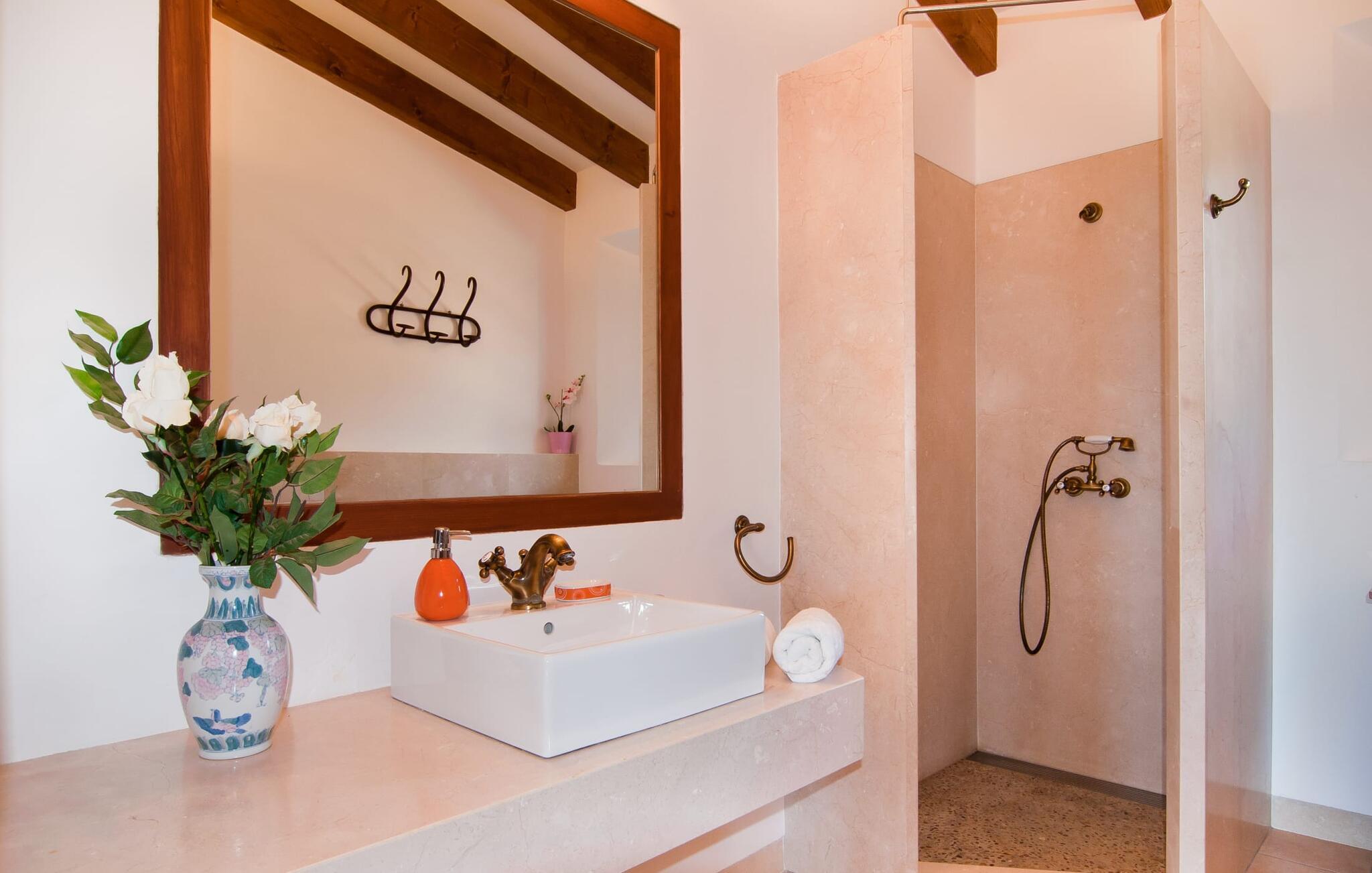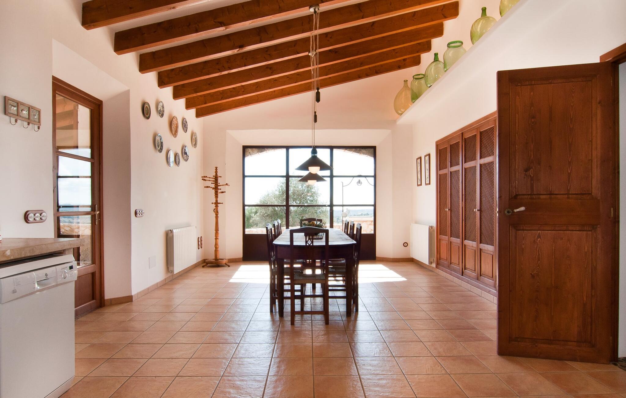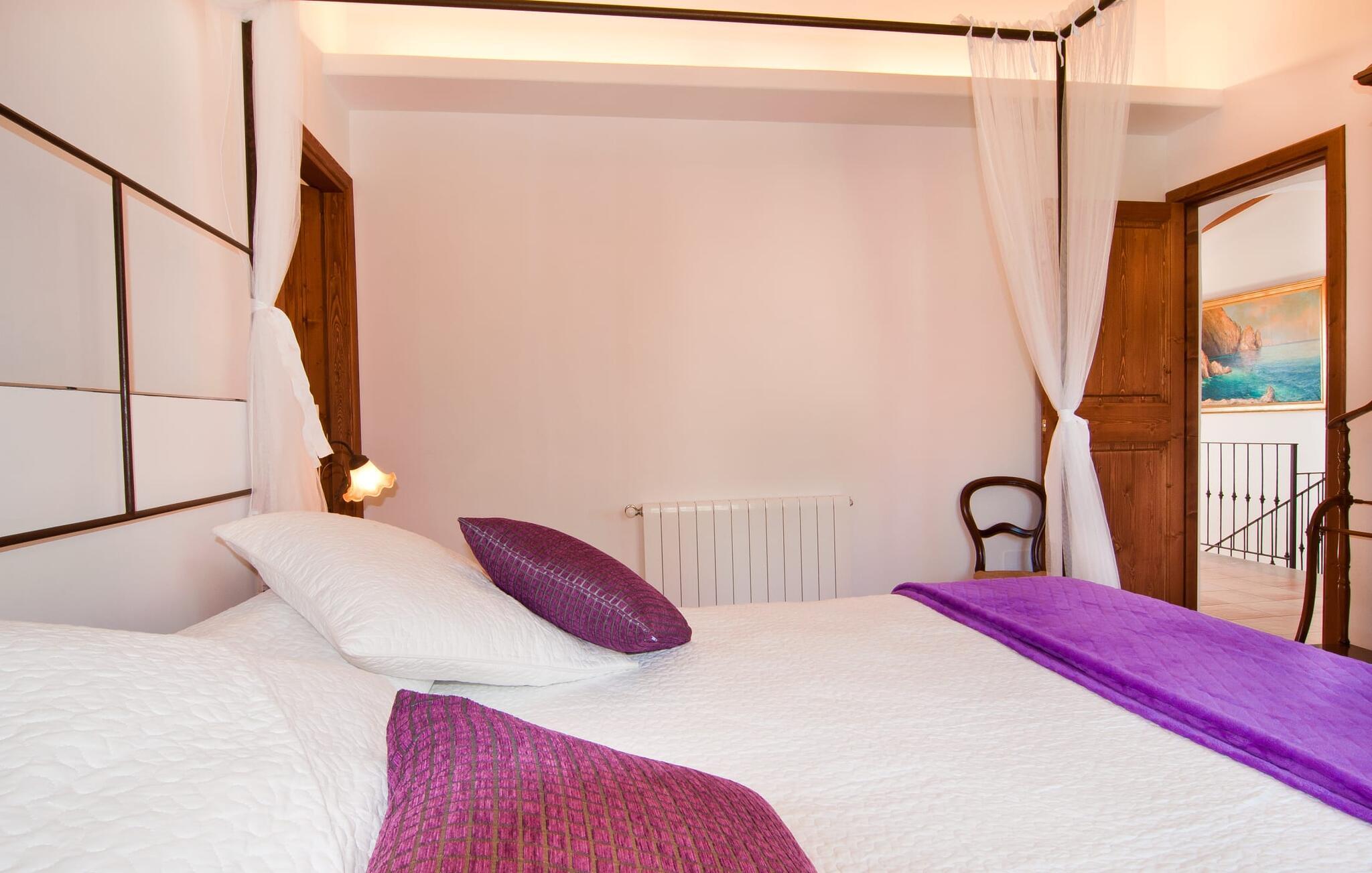 Was beim Betreten des Hauses sofort auffällt: Platz. Raum zum Leben. Zum Aufblühen. Für einen ganz eigenen, vielleicht mal erweiterten Radius. Zwischen modernen Sichtbalkendecken darüber, passenden Terrakottafliesen am Boden und strahlend weißen Wänden rundherum stehen erlesene Möbel, die ein absolut kultiviertes Wohnen ermöglichen. Großzügige Wohnräume prägen das Haus und verleihen ihm ein ganz individuelles Flair, das besonders freiheitsliebende Menschen zu schätzen wissen. Hier können Sie auch mit einer größeren Gruppe problemlos anreisen, ohne auf genügend Privatsphäre achten zu müssen. Da sich die Wohnfläche auf zwei Etagen verteilt, wird der Eindruck von Großzügigkeit noch verstärkt. Wer Lust hat, kann seine Mahlzeiten alleine drinnen an drei verschiedenen Orten einnehmen: entweder in einem der fein eingerichteten Essbereiche. Oder in der riesigen Küche, einer fantastischen, großen Wohnküche, in der Essen zubereitet und anschließend gemeinsam genossen werden kann. An kühleren Abenden können Sie es sich hier am Kamin gemütlich machen. Die ästhetische Küchenzeile, teilweise mit Marmor dekoriert und in L-Form gebaut, bietet alles, was Sie für den täglichen Gebrauch benötigen, in hochwertiger Form und Form. Auch eine Filterkaffeemaschine gehört zur Ausstattung. Ebenso großzügig wie die Esstische sind Sofazonen im ganzen Haus verteilt. Sie bieten Raum zum Entspannen, sei es beim Lesen, in vertiefte Gespräche oder beim Fernsehen vor Ort mit dem Flachbildfernseher. Edle und romantisch dekorierte Schlafzimmer laden zu erholsamer Nachtruhe ein. In diesem Ambiente können Sie ohne störenden Schnickschnack tief entspannen und Ihre Mitte finden. Holz, viel Weiß und ein paar geschickt platzierte Farbtupfer zaubern eine verträumte Atmosphäre. Insgesamt stehen Ihnen 3 Zimmer mit Doppelbett, 2 Zimmer mit 2 Einzelbetten zur Verfügung. Hochwertige Ausstattung sowie modernes Design finden sich in den Badezimmern wieder, eines davon ist ein luxuriöses En-Suite-Badezimmer. Ein Bügeleisen und ein Fön sind im Haus vorhanden, sodass Sie diese nicht mitbringen müssen.
