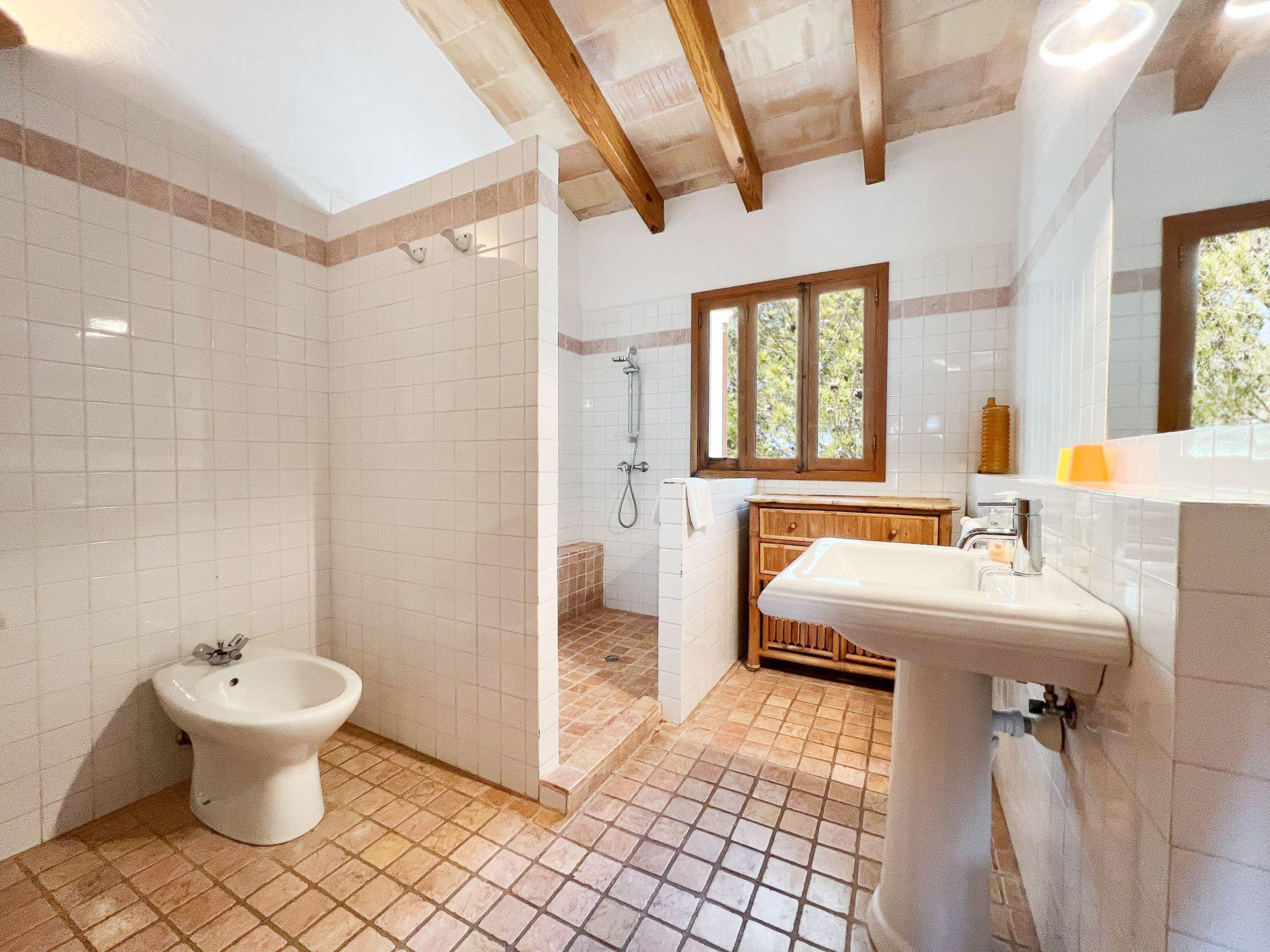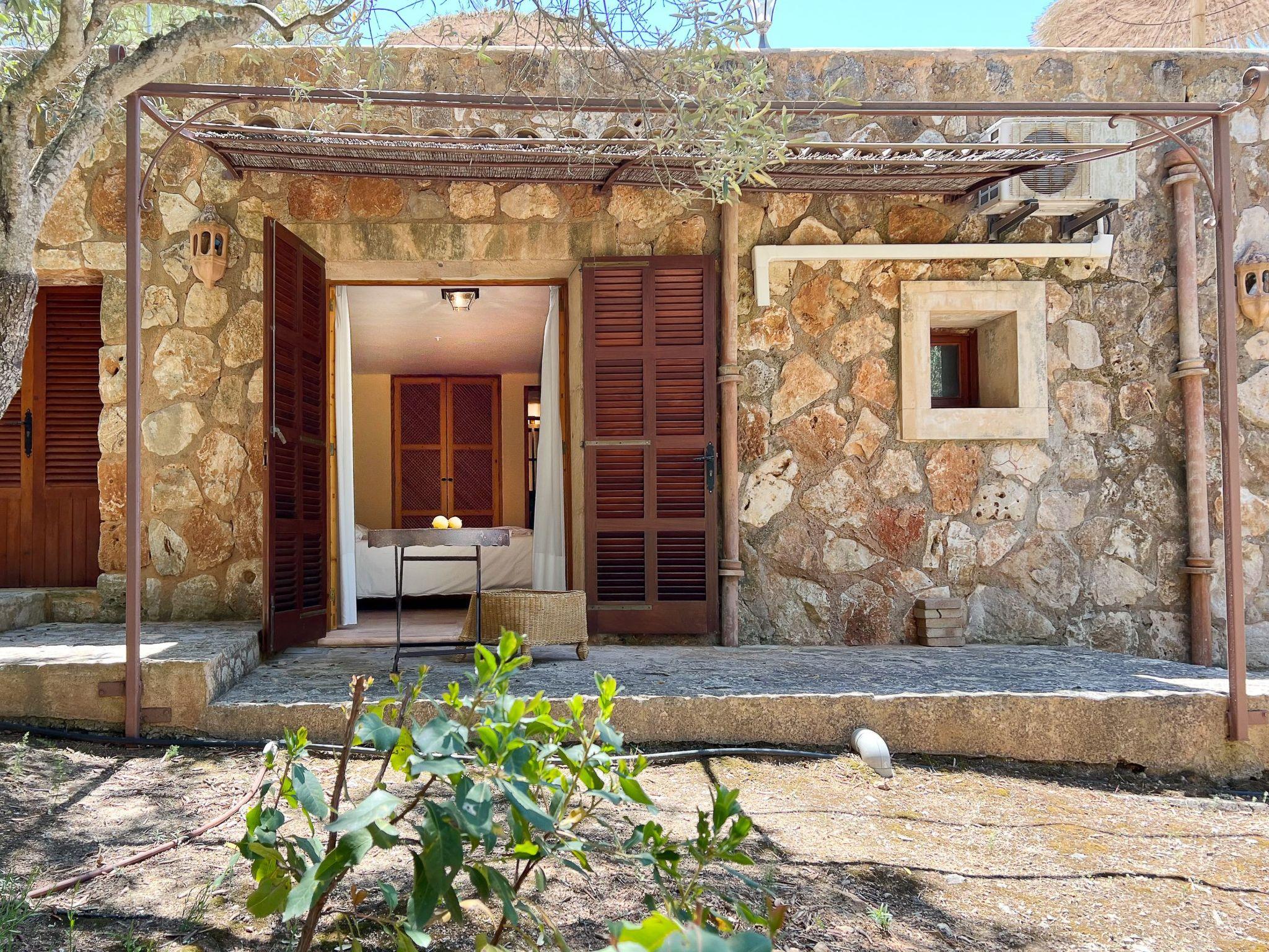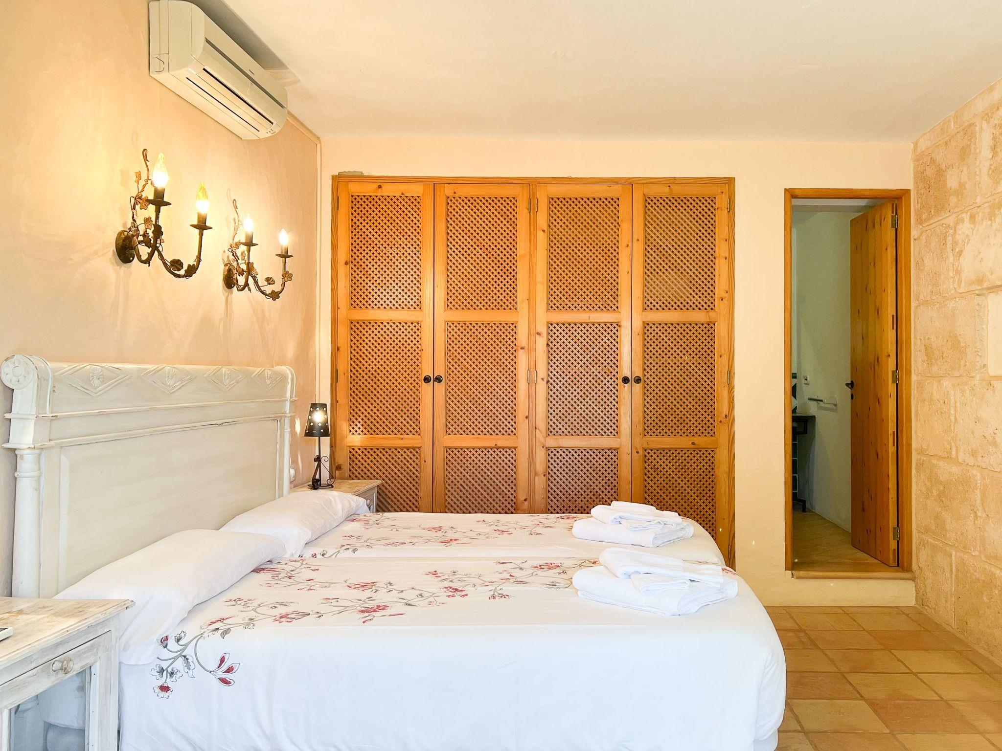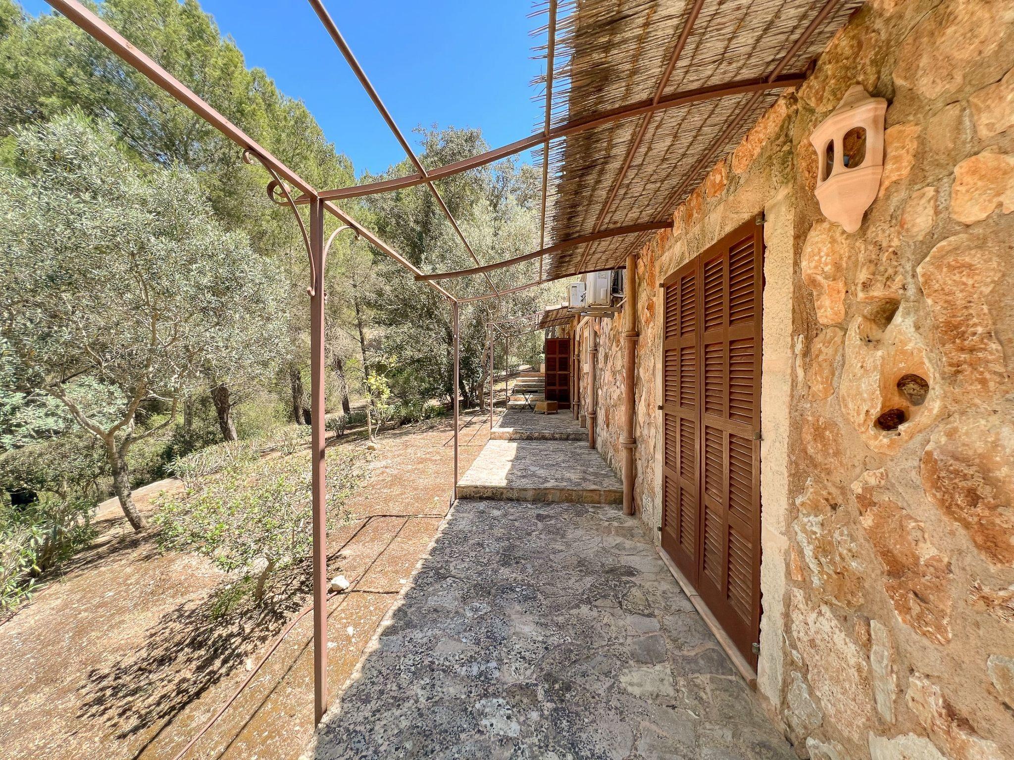 Die Finca Binifarda Dor ist ein herrliches Landhaus im typischen Landhausdesign gehalten wie z.b. hohe Decken mit Holzbalken. Das geräumige Haus hat viel natürliches Licht. Das Haupthaus beherbergt die Küche, den Wohn- und Essbereich sowie 2 Schlafzimmer. Die anderen drei Schlafzimmer befinden sich separat in der Nähe des Pools.Von aussen führen uns einige Stufen in das Haupthaus. Im Erdgeschoss gibt es eine grosse offene Zone, wo sich die Küche sowie dass Wohn-/Esszimmer befinden. Die Möblierung ist im rustikalen Stil gehalten. Die Küche verfügt über eine Kochinsel und ist gut ausgestattet Ein grosser Esstisch und eine komfortable Sitzecke laden zum Verweilen ein. Es gibt einen tollen Kamin zwischen Ess- und Wohnbereich. Neben der Küche befindet sich der Haushaltsraum.Im Erdgeschoss gibt es ein Schlafzimmer für 1 Person mit Zugang nach draussen und einer separaten Dusche. Eine schmale Holztreppe führt ins Obergeschoss mit einem Doppelbett und einem ensuite Badezimmer mit einer grossen Eckbadewanne. Das Schlafzimmer kann auch von aussen erreicht werden. Die anderen drei Schlafzimmer befinden sich separat vom Haus auf einer tieferen Ebene mit Zugang von Aussen. Es gibt ein Schlafzimmer mit Doppelbett mit ensuite Duschbard und zwei Schlafzimmer mit je 2 Einzebetten jeweils mit ensuite Badezimmer. Das im ersten Stock befindliche Schlafzimmer und die drei separaten Schlafzimmer haben Klimaanlage warm/kalt mit festgelegter und limitierter Nutzungszeit.