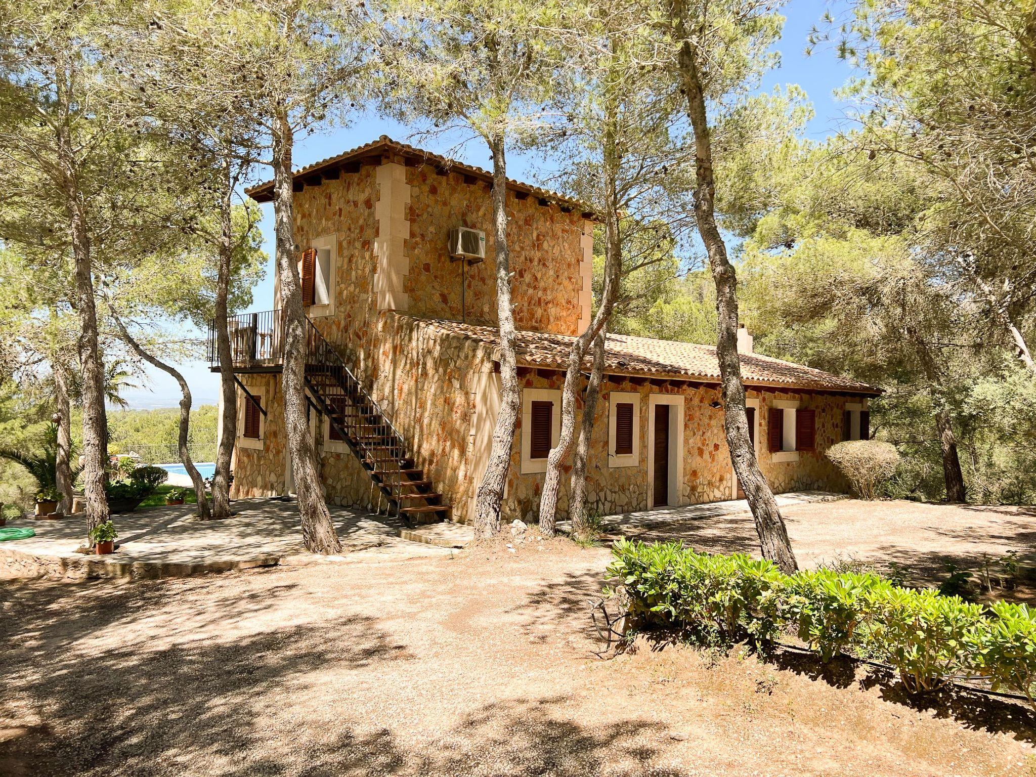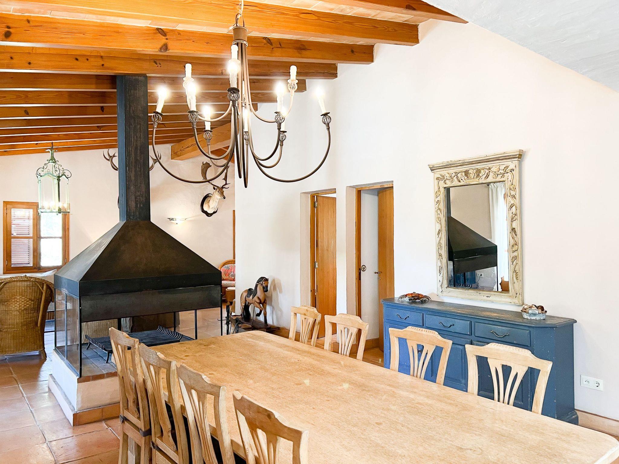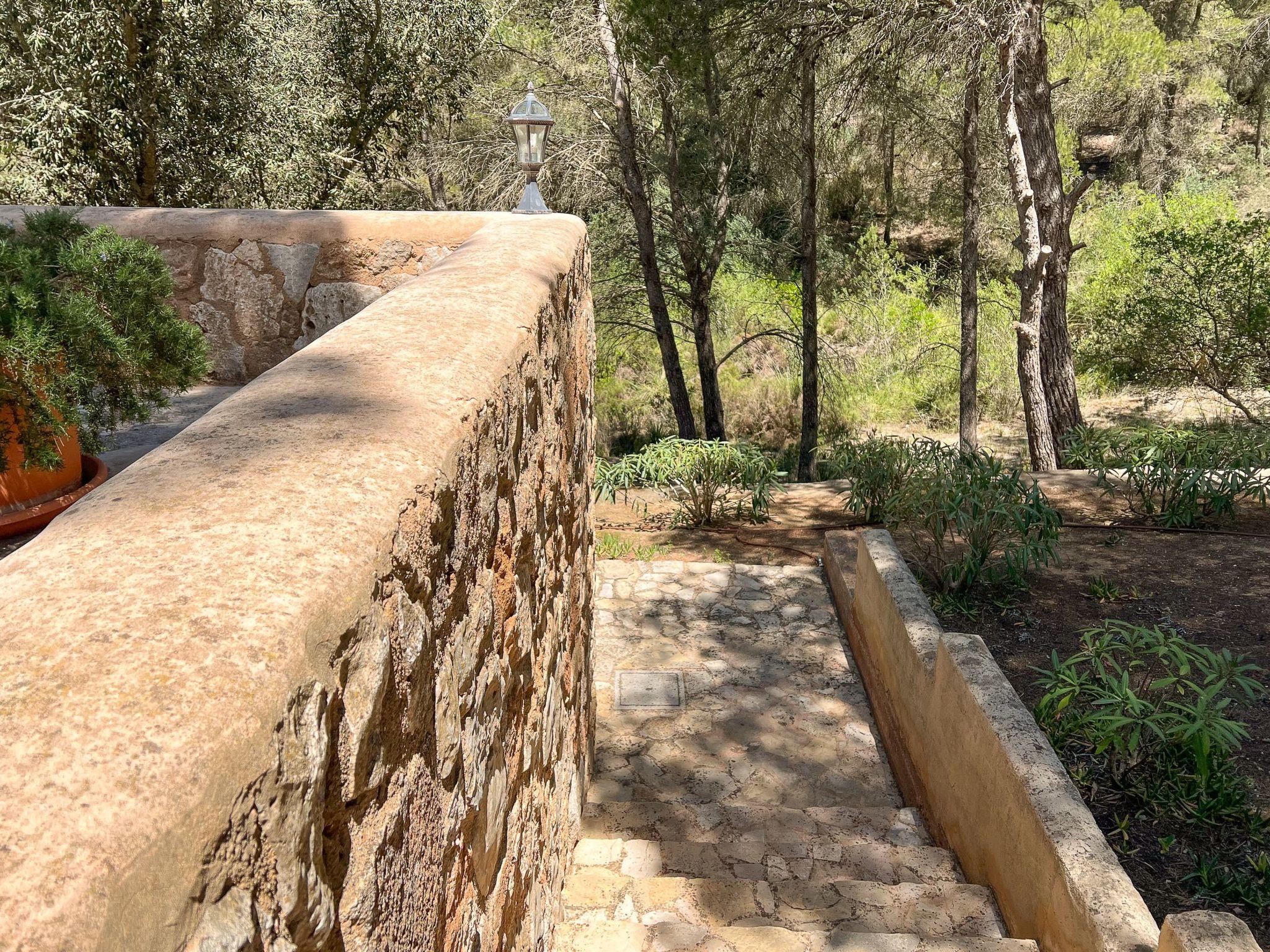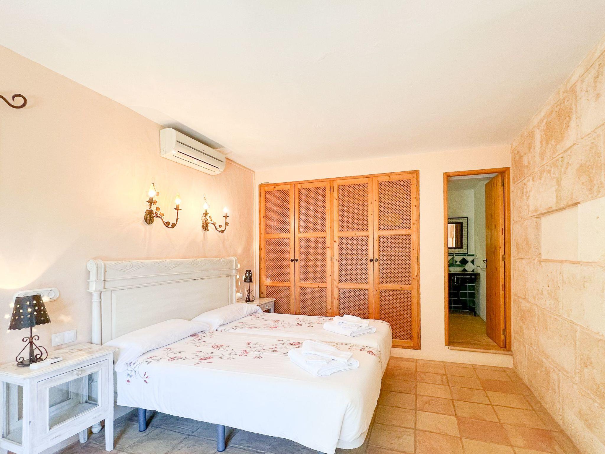 Die Finca Binifarda Dor ist ein herrliches Landhaus im typischen Landhausdesign gehalten wie z.b. hohe Decken mit Holzbalken. Das geräumige Haus hat viel natürliches Licht. Das Haupthaus beherbergt die Küche, den Wohn- und Essbereich sowie 2 Schlafzimmer. Die anderen drei Schlafzimmer befinden sich separat in der Nähe des Pools.Von aussen führen uns einige Stufen in das Haupthaus. Im Erdgeschoss gibt es eine grosse offene Zone, wo sich die Küche sowie dass Wohn-/Esszimmer befinden. Die Möblierung ist im rustikalen Stil gehalten. Die Küche verfügt über eine Kochinsel und ist gut ausgestattet Ein grosser Esstisch und eine komfortable Sitzecke laden zum Verweilen ein. Es gibt einen tollen Kamin zwischen Ess- und Wohnbereich. Neben der Küche befindet sich der Haushaltsraum.Im Erdgeschoss gibt es ein Schlafzimmer für 1 Person mit Zugang nach draussen und einer separaten Dusche. Eine schmale Holztreppe führt ins Obergeschoss mit einem Doppelbett und einem ensuite Badezimmer mit einer grossen Eckbadewanne. Das Schlafzimmer kann auch von aussen erreicht werden. Die anderen drei Schlafzimmer befinden sich separat vom Haus auf einer tieferen Ebene mit Zugang von Aussen. Es gibt ein Schlafzimmer mit Doppelbett mit ensuite Duschbard und zwei Schlafzimmer mit je 2 Einzebetten jeweils mit ensuite Badezimmer. Das im ersten Stock befindliche Schlafzimmer und die drei separaten Schlafzimmer haben Klimaanlage warm/kalt mit festgelegter und limitierter Nutzungszeit.