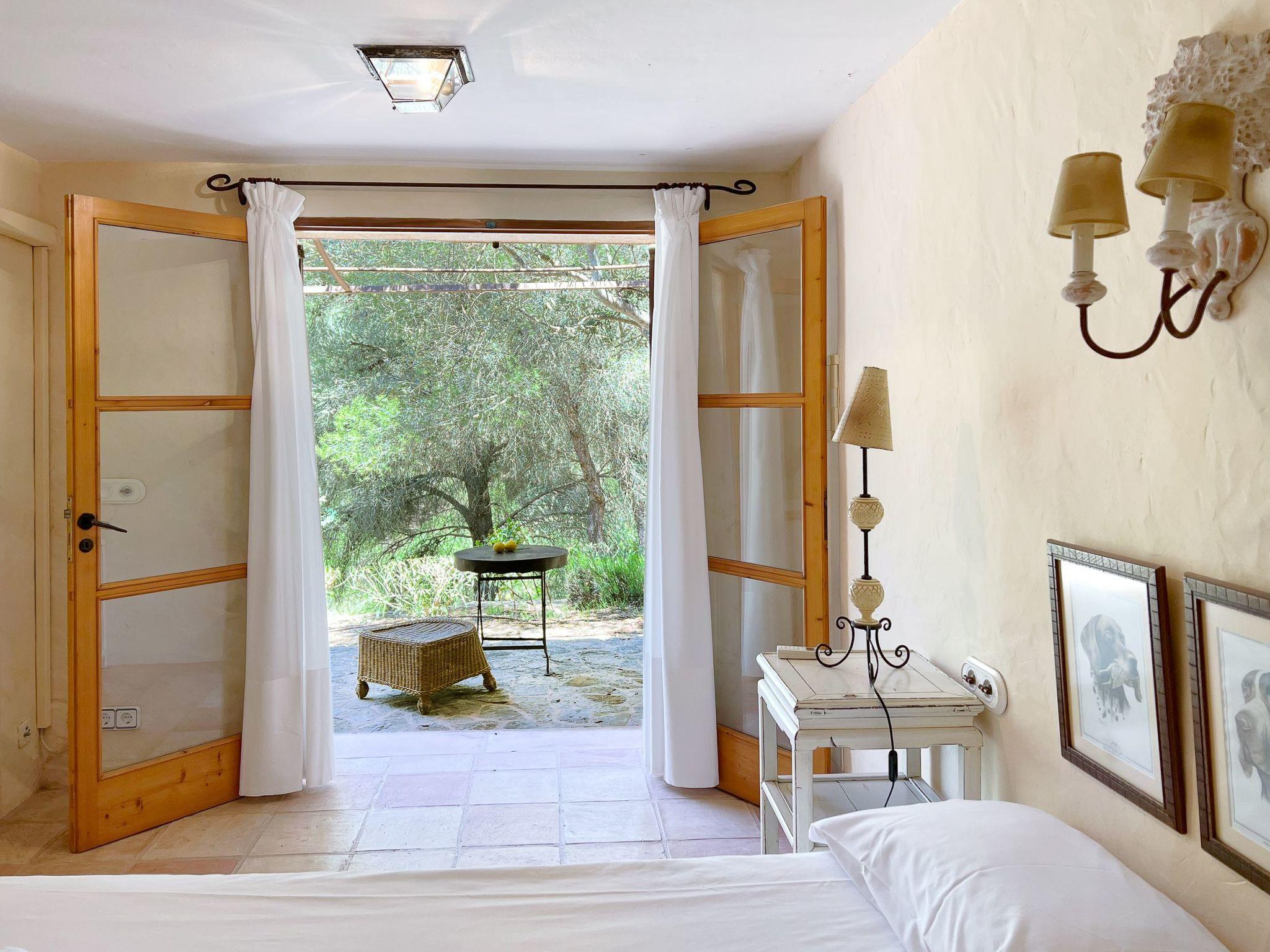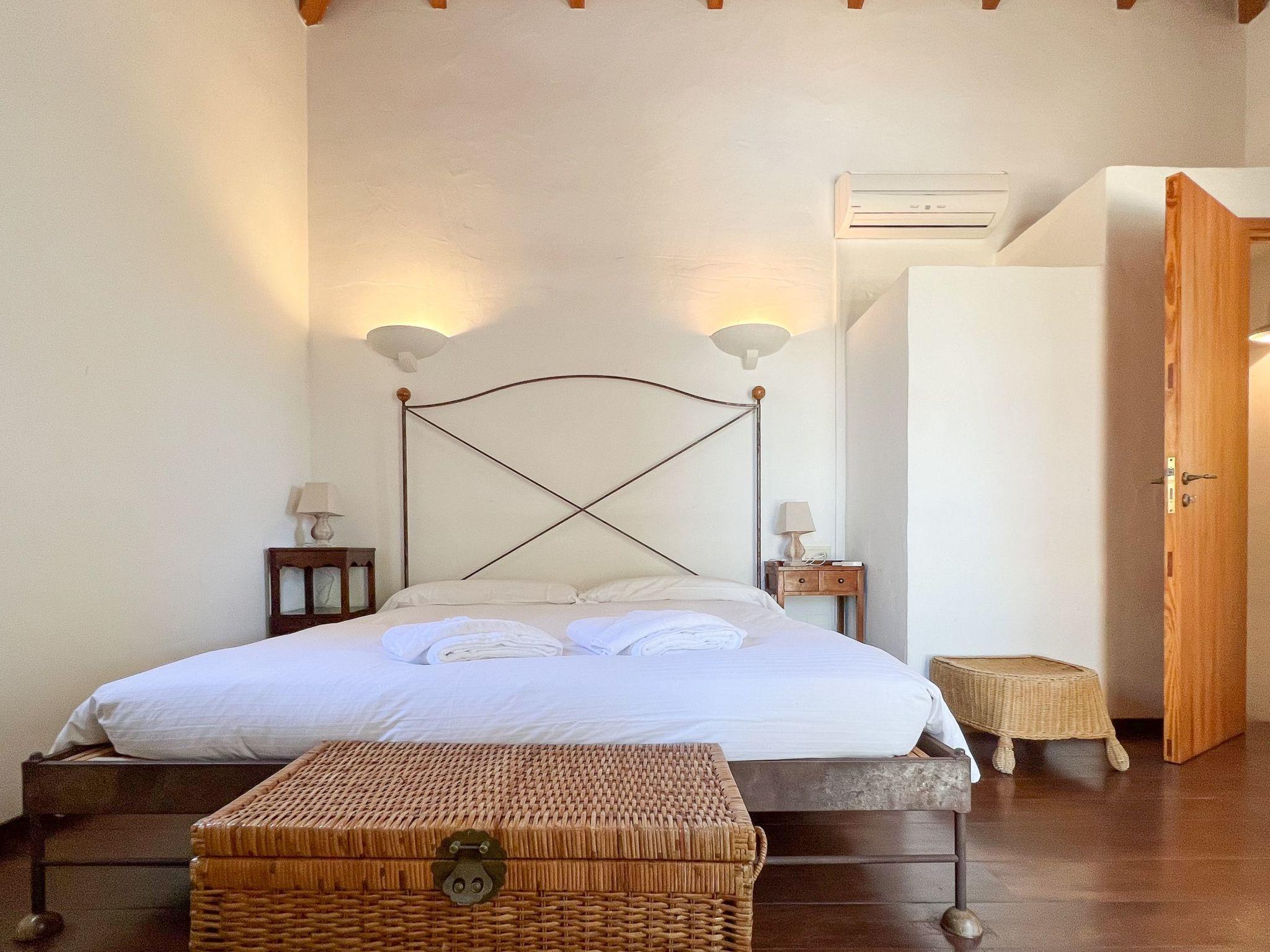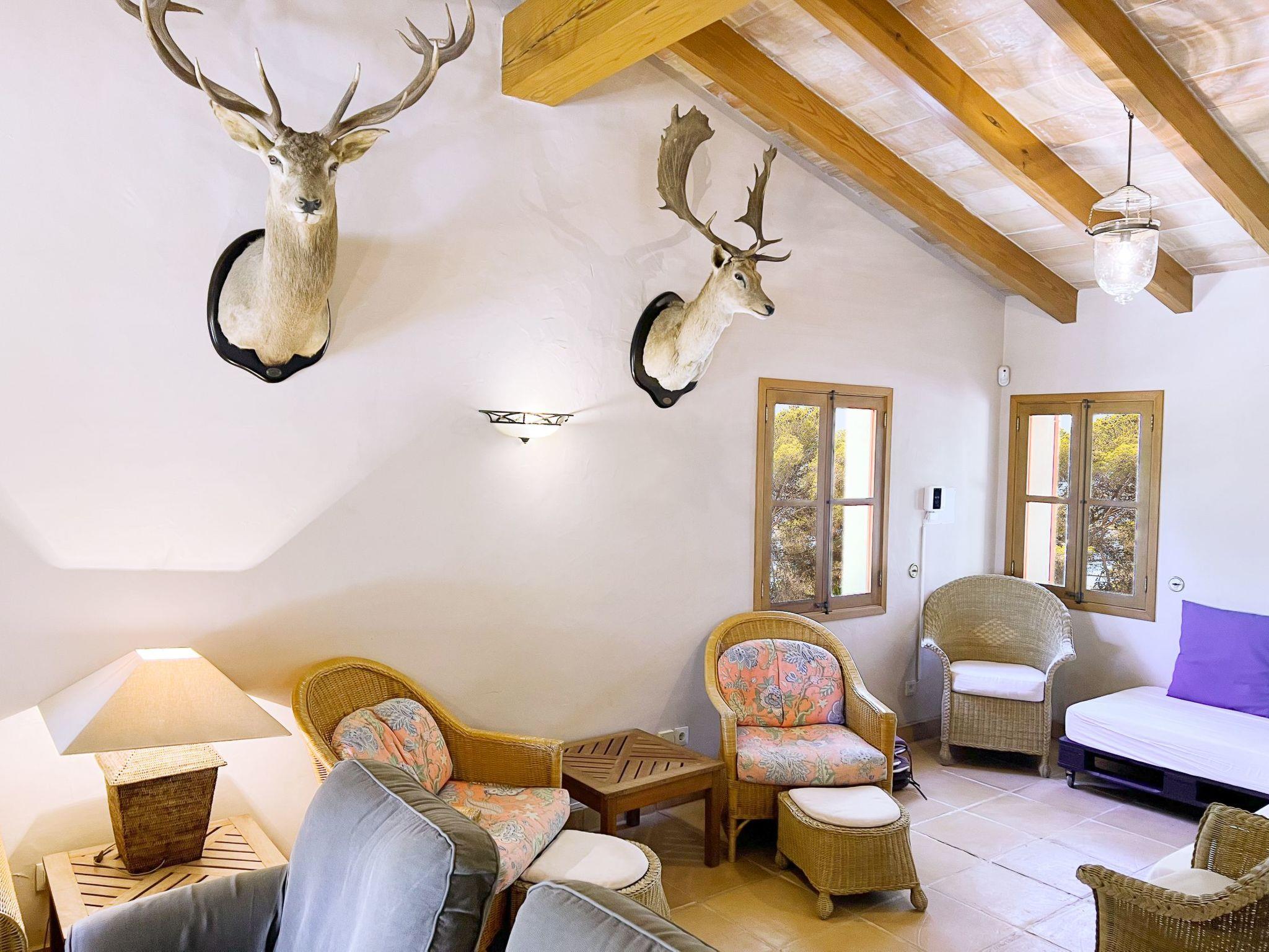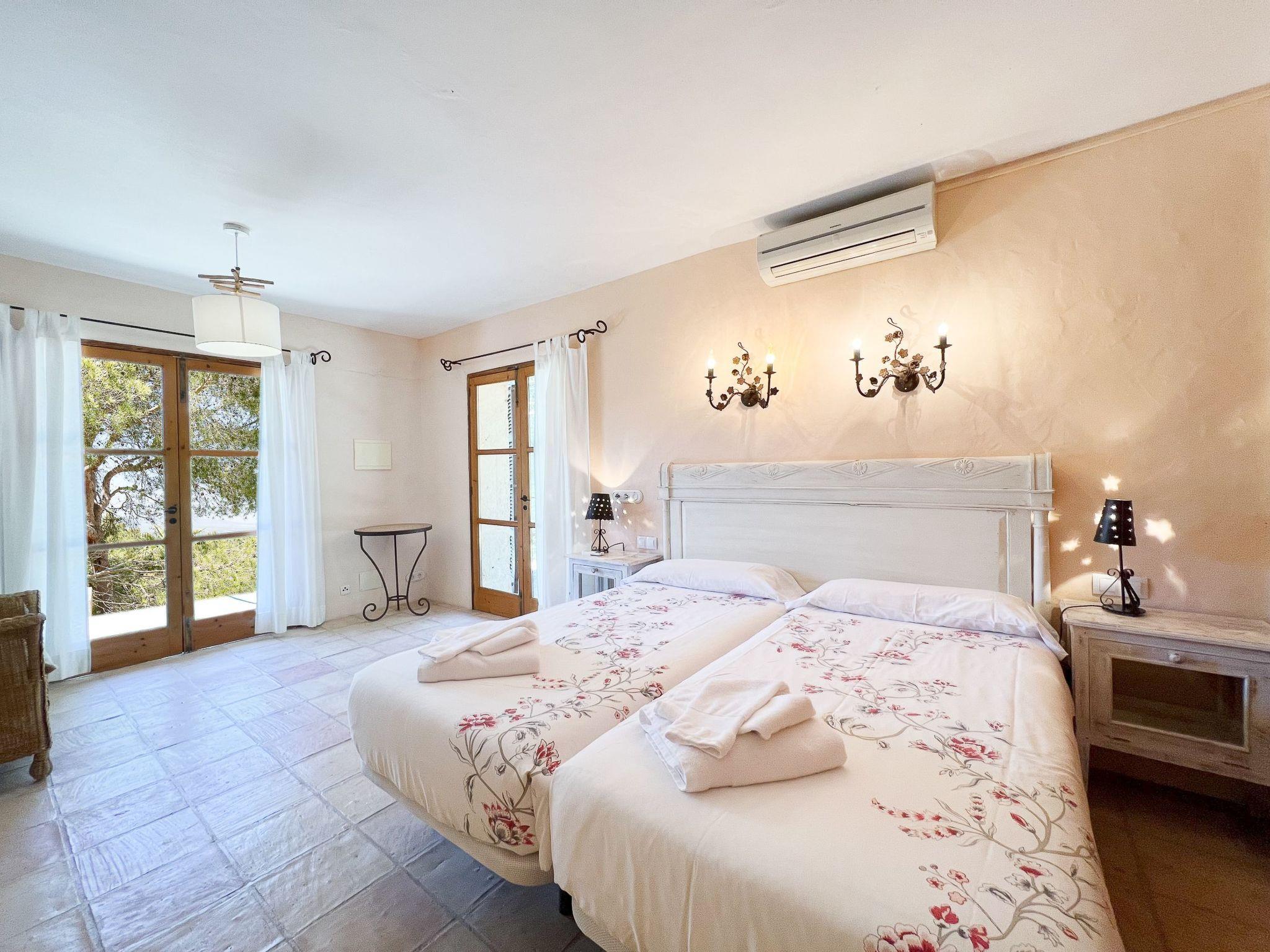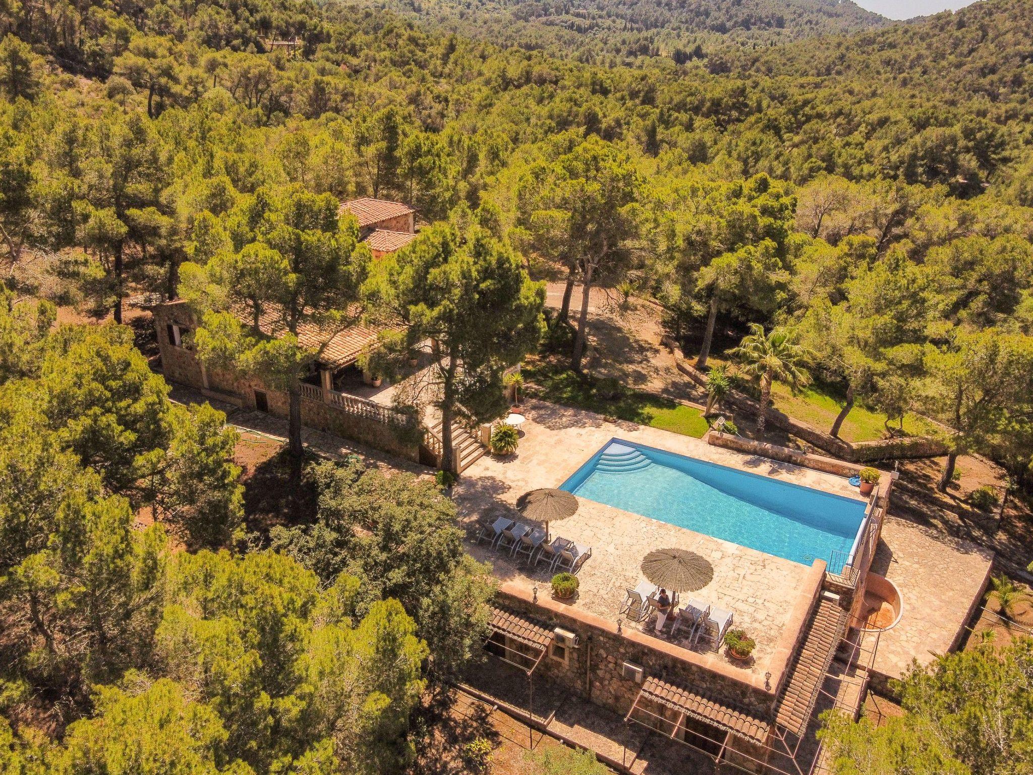 Die Finca Binifarda Dor ist ein herrliches Landhaus im typischen Landhausdesign gehalten wie z.b. hohe Decken mit Holzbalken. Das geräumige Haus hat viel natürliches Licht. Das Haupthaus beherbergt die Küche, den Wohn- und Essbereich sowie 2 Schlafzimmer. Die anderen drei Schlafzimmer befinden sich separat in der Nähe des Pools.Von aussen führen uns einige Stufen in das Haupthaus. Im Erdgeschoss gibt es eine grosse offene Zone, wo sich die Küche sowie dass Wohn-/Esszimmer befinden. Die Möblierung ist im rustikalen Stil gehalten. Die Küche verfügt über eine Kochinsel und ist gut ausgestattet Ein grosser Esstisch und eine komfortable Sitzecke laden zum Verweilen ein. Es gibt einen tollen Kamin zwischen Ess- und Wohnbereich. Neben der Küche befindet sich der Haushaltsraum.Im Erdgeschoss gibt es ein Schlafzimmer für 1 Person mit Zugang nach draussen und einer separaten Dusche. Eine schmale Holztreppe führt ins Obergeschoss mit einem Doppelbett und einem ensuite Badezimmer mit einer grossen Eckbadewanne. Das Schlafzimmer kann auch von aussen erreicht werden. Die anderen drei Schlafzimmer befinden sich separat vom Haus auf einer tieferen Ebene mit Zugang von Aussen. Es gibt ein Schlafzimmer mit Doppelbett mit ensuite Duschbard und zwei Schlafzimmer mit je 2 Einzebetten jeweils mit ensuite Badezimmer. Das im ersten Stock befindliche Schlafzimmer und die drei separaten Schlafzimmer haben Klimaanlage warm/kalt mit festgelegter und limitierter Nutzungszeit.