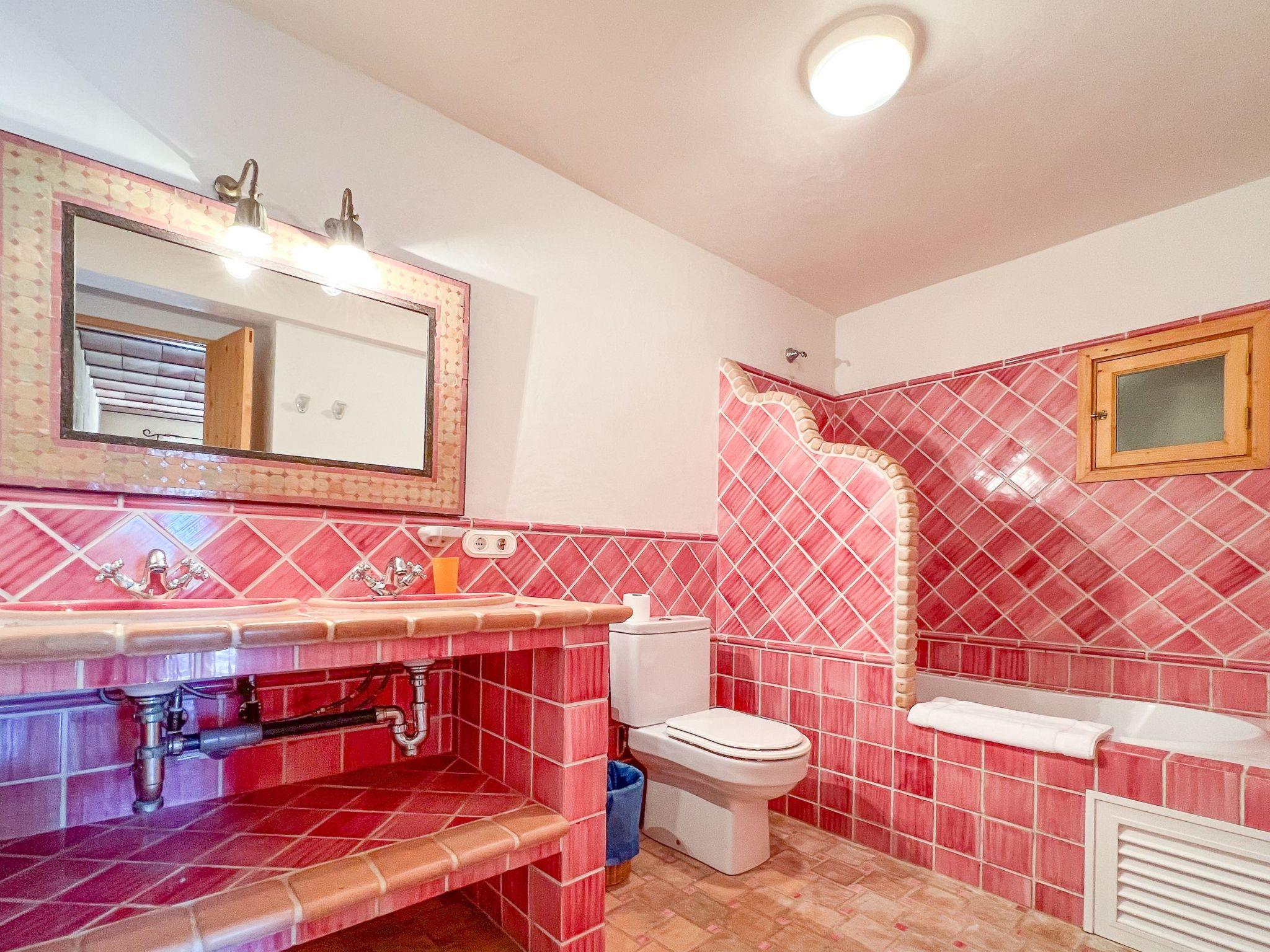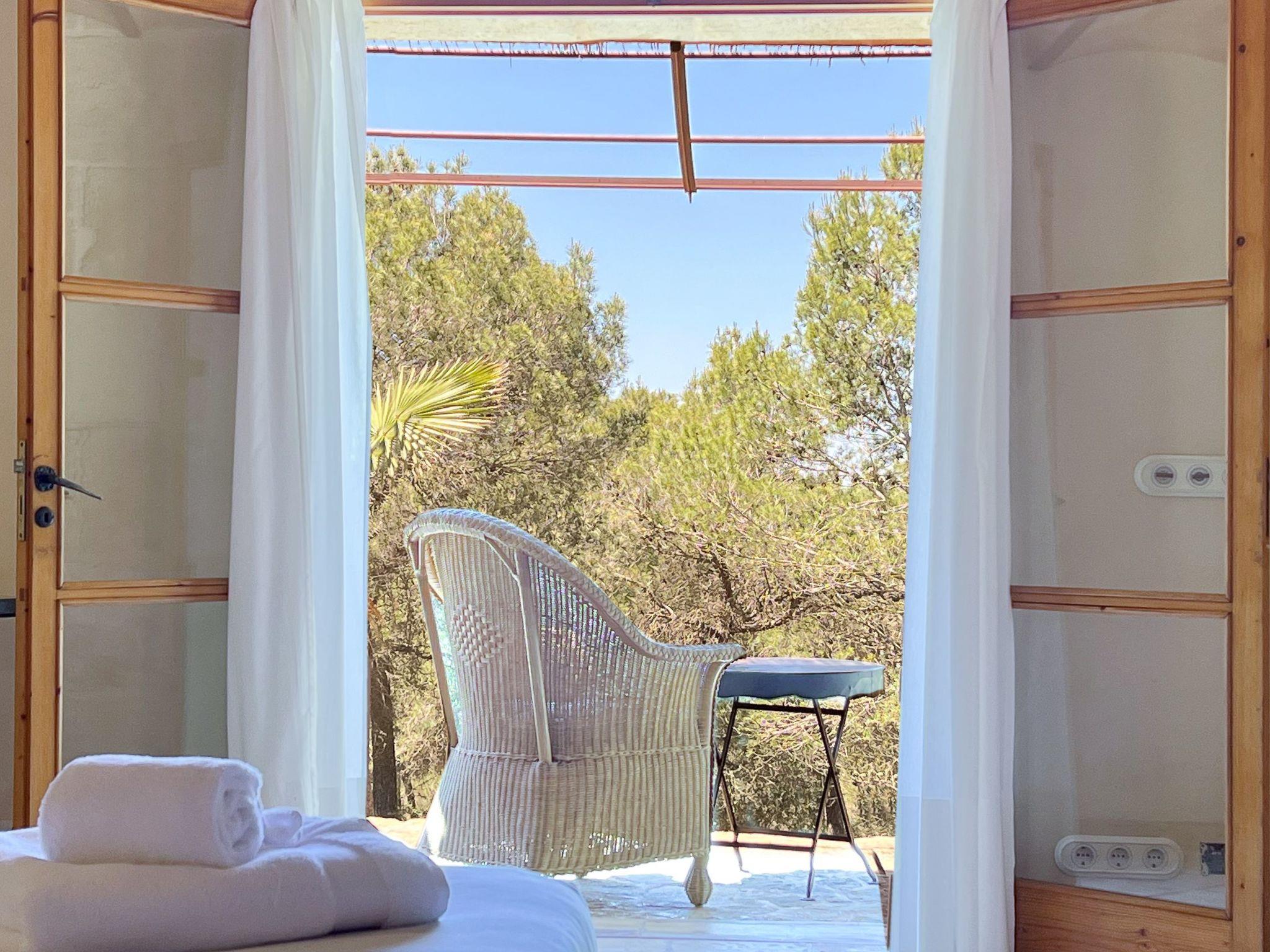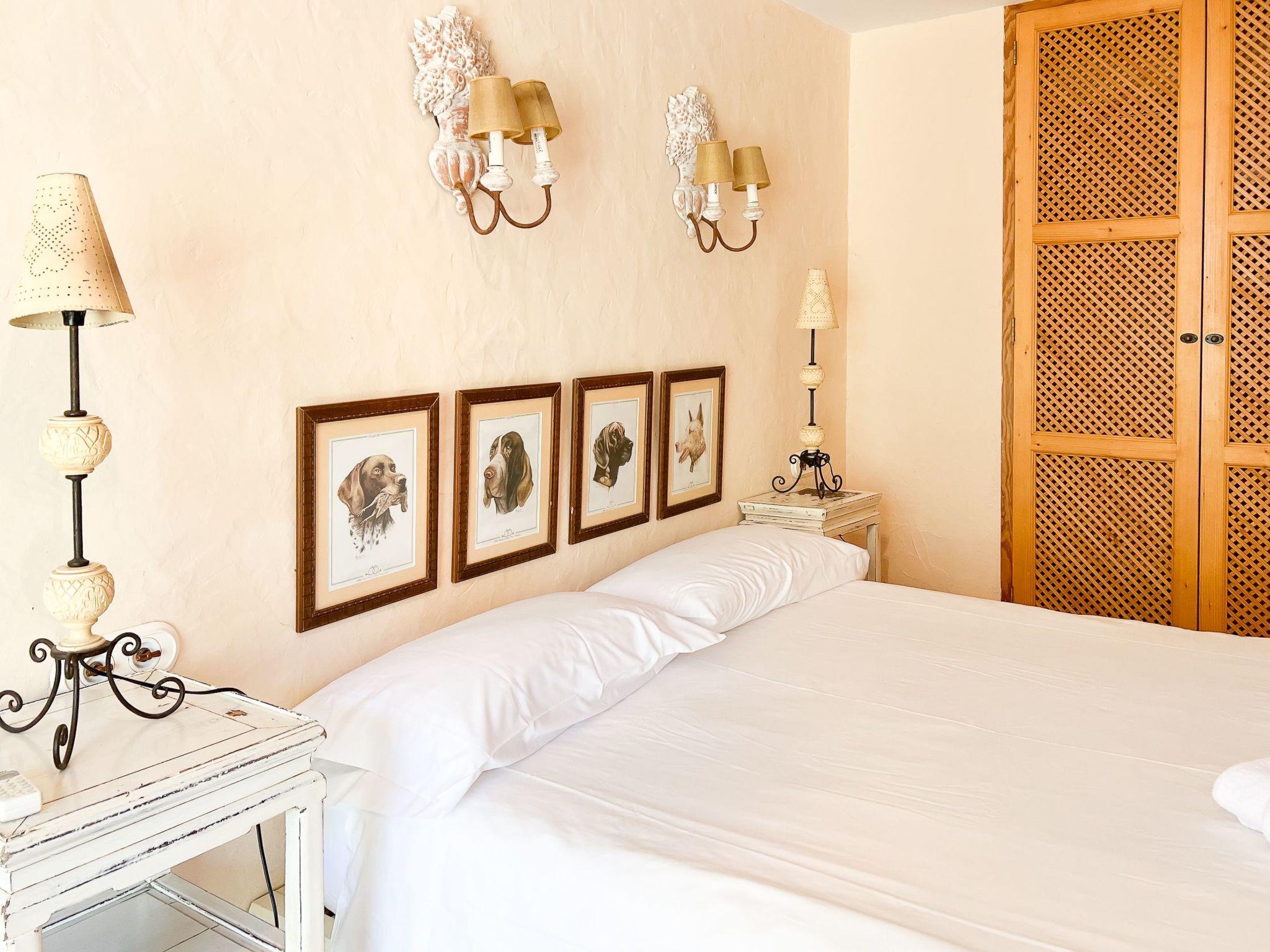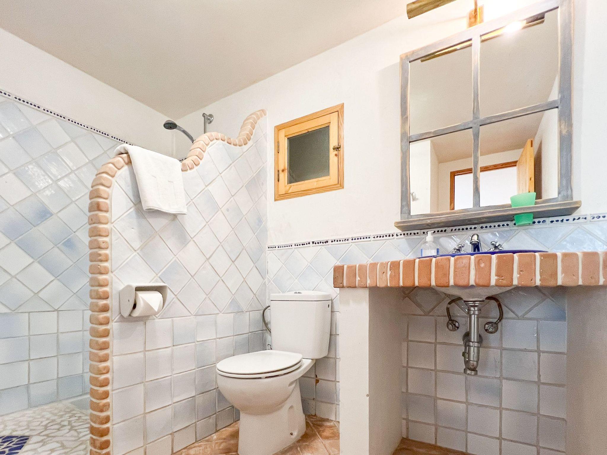 Die Finca Binifarda Dor ist ein herrliches Landhaus im typischen Landhausdesign gehalten wie z.b. hohe Decken mit Holzbalken. Das geräumige Haus hat viel natürliches Licht. Das Haupthaus beherbergt die Küche, den Wohn- und Essbereich sowie 2 Schlafzimmer. Die anderen drei Schlafzimmer befinden sich separat in der Nähe des Pools.Von aussen führen uns einige Stufen in das Haupthaus. Im Erdgeschoss gibt es eine grosse offene Zone, wo sich die Küche sowie dass Wohn-/Esszimmer befinden. Die Möblierung ist im rustikalen Stil gehalten. Die Küche verfügt über eine Kochinsel und ist gut ausgestattet Ein grosser Esstisch und eine komfortable Sitzecke laden zum Verweilen ein. Es gibt einen tollen Kamin zwischen Ess- und Wohnbereich. Neben der Küche befindet sich der Haushaltsraum.Im Erdgeschoss gibt es ein Schlafzimmer für 1 Person mit Zugang nach draussen und einer separaten Dusche. Eine schmale Holztreppe führt ins Obergeschoss mit einem Doppelbett und einem ensuite Badezimmer mit einer grossen Eckbadewanne. Das Schlafzimmer kann auch von aussen erreicht werden. Die anderen drei Schlafzimmer befinden sich separat vom Haus auf einer tieferen Ebene mit Zugang von Aussen. Es gibt ein Schlafzimmer mit Doppelbett mit ensuite Duschbard und zwei Schlafzimmer mit je 2 Einzebetten jeweils mit ensuite Badezimmer. Das im ersten Stock befindliche Schlafzimmer und die drei separaten Schlafzimmer haben Klimaanlage warm/kalt mit festgelegter und limitierter Nutzungszeit.