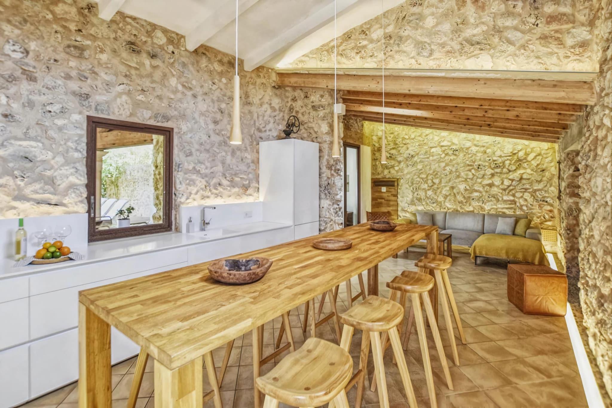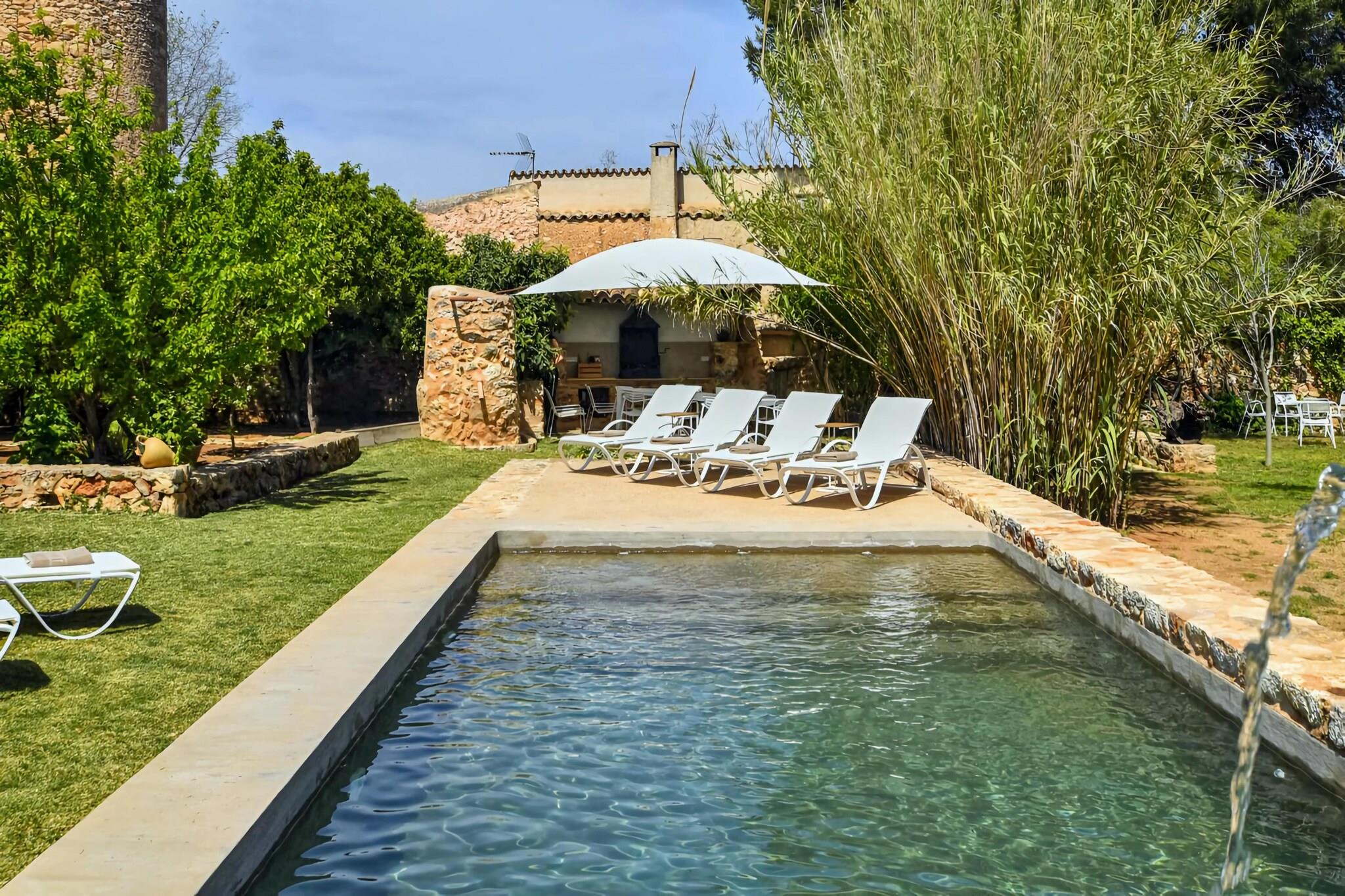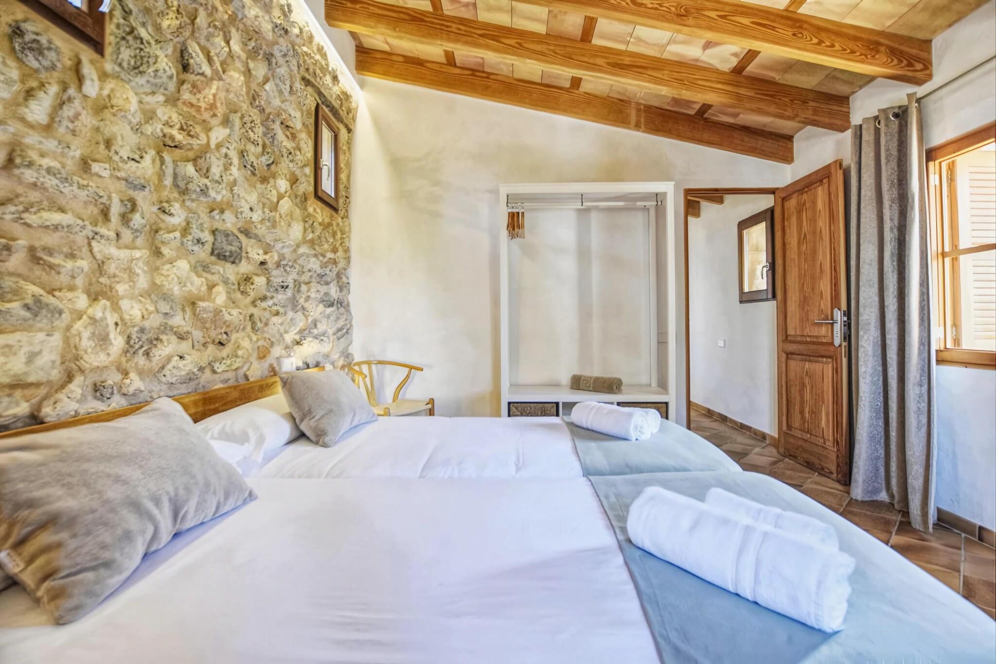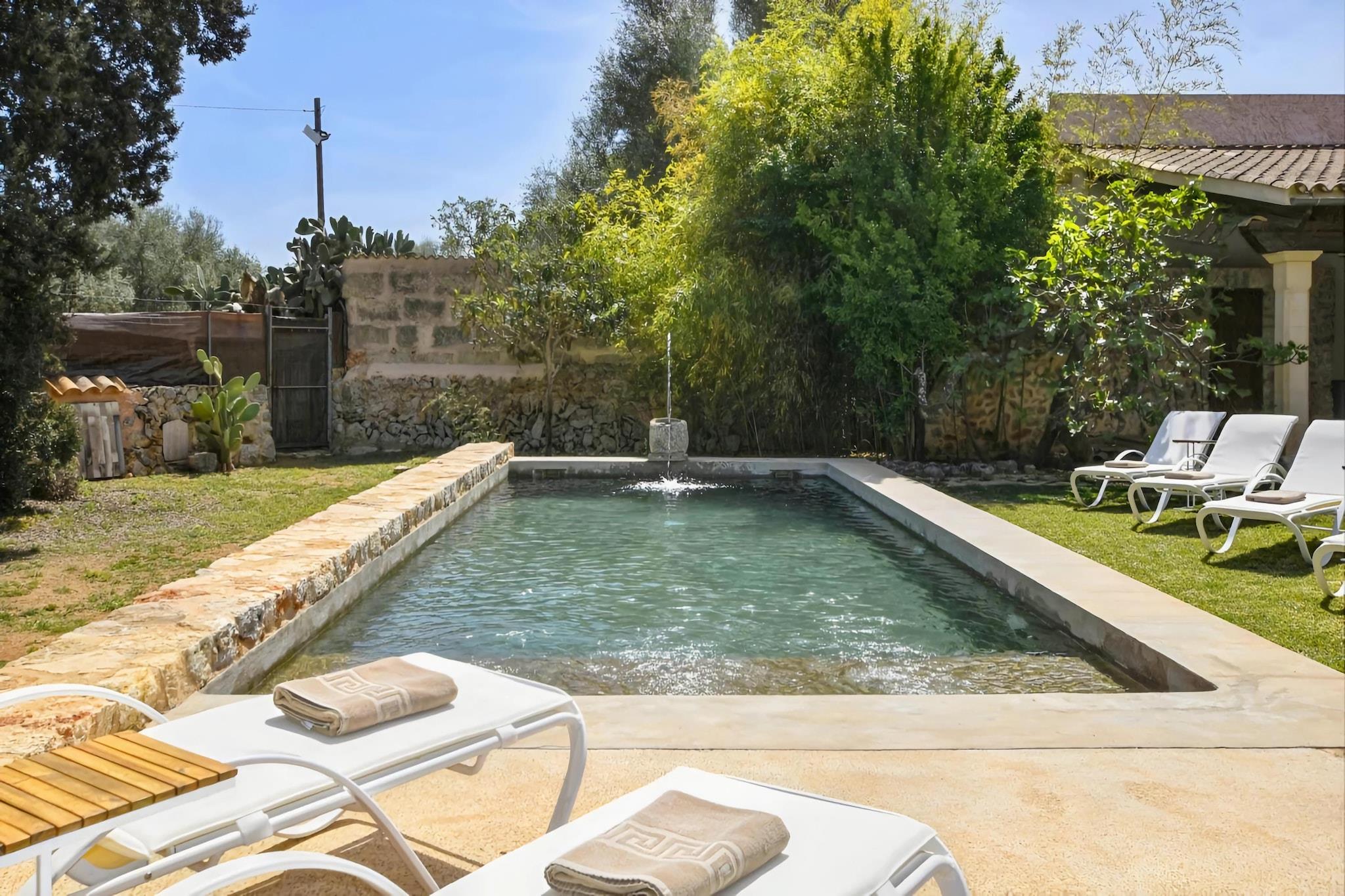 Dieses einzigartige Mühlenanwesen im Dorf Sencelles empfängt Sie mit einer besonders eleganten Atmosphäre und zugleich sehr traditionell. Es wurde großer Wert darauf gelegt, den ursprünglichen Stil zu bewahren und ihn mit modernem und luxuriösem Komfort zu ergänzen. Das Ergebnis ist ein Ferienhaus mit ansprechender Atmosphäre und Platz für bis zu 8 Personen. Das im Grunde als ländliches Anwesen konzipierte Anwesen befindet sich im Dorf Sencelles und bietet viel Privatsphäre und dennoch eine sehr gute Infrastrukturanbindung. Ein wunderschöner und idyllischer Garten verführt dazu, viel Zeit im Freien in üppig grünen Gärten und wunderschön gestalteten Terrassen zu verbringen. Der fantastische Pool von 10 x 4 m ist elegant in die Mitte des Gartens eingebettet und sorgt für die nötige Erfrischung nach einem wohlverdienten Sonnenbad. Ein kleiner eingezäunter Teil des Gartens ist das Zuhause der zum Anwesen gehörenden mallorquinischen Landschildkröten; hier wird es insbesondere bei Familien mit Kindern den Kleinen nie langweilig. Vor dem Haus erstreckt sich die riesige und gemütliche L-förmige überdachte Terrasse, auf der Sie auf den bequemen Sofas und am Esszimmertisch viel Ruhe und Schatten finden. Von hier aus blicken Sie auf den Pool, sodass Sie die Kinder beim Planschen immer im Blick haben. Auf dem gemauerten Grill können Sie frische Produkte zubereiten, die Sie auf dem Wochenmarkt der Stadt gekauft haben. Mit 270 m2, die sich auf zwei Etagen verteilen, bietet das Haus insgesamt vier große Schlafzimmer mit eigener Klimaanlage (alle mit Doppelbett, zwei davon im Erdgeschoss) und vier Badezimmer (zwei en suite, eines außen). Farben Wandspannen in Kombination mit Holzbalken und beeindruckenden Sandsteinelementen prägen Die rustikale und gleichzeitig sehr gepflegte und neue Atmosphäre und Innenausstattung schafft eine zusätzliche gemütliche Atmosphäre. Im Erdgeschoss befindet sich auch die große Küche mit einem originalen Holztisch, der als Kühlraum fungiert. Zone der