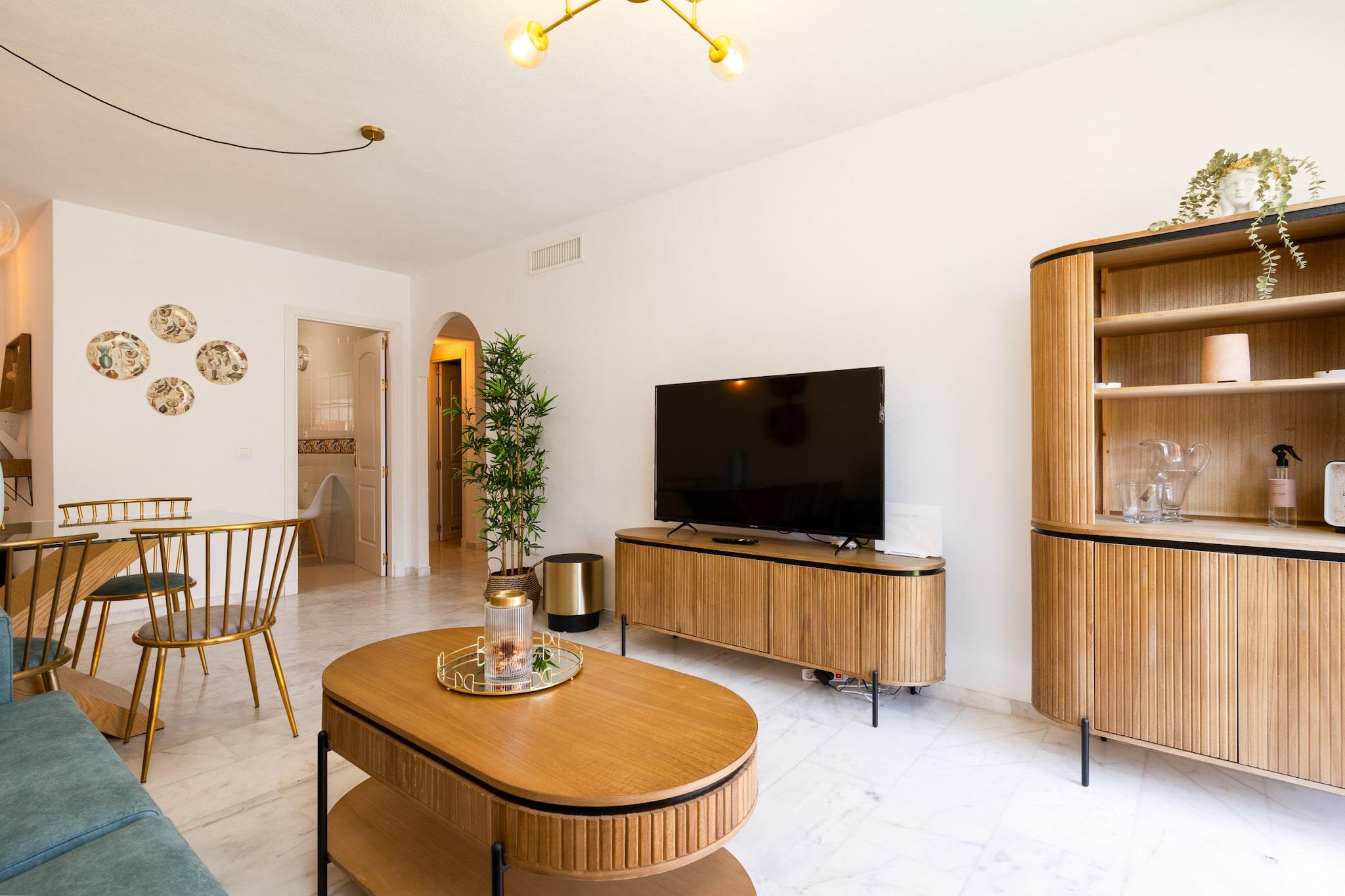 Komfortables Apartment an der Küste Dieses geräumige Apartment mit 2 Schlafzimmern in Marbella bietet auf 108 m² Wohnfläche bequem Platz für bis zu 6 Gäste. Es ist für Familien oder kleine Gruppen konzipiert und verfügt über einen Gemeinschaftspool, eine Terrasse und einen überdachten Parkplatz. Moderne Annehmlichkeiten wie Zentralheizung, Klimaanlage, WLAN, zwei Fernseher und eine voll ausgestattete Küche mit Backofen, Mikrowelle, Kühlschrank, Gefrierschrank, Geschirrspüler, Kaffeemaschine und Saftpresse sorgen für einen komfortablen und erholsamen Aufenthalt. Marbella und Umgebung erkunden Das Apartment liegt in bester Lage und bietet einfachen Zugang zu Marbellas Stränden, dem pulsierenden Stadtzentrum und malerischen Küstenwanderwegen. Zu den nahegelegenen Sehenswürdigkeiten zählen die Altstadt mit ihren charmanten Plätzen, Puerto Banús mit seinen exklusiven Einkaufsmöglichkeiten und Yachten sowie Golfplätze, die nur eine kurze Autofahrt entfernt liegen. Gäste können entlang der Promenade schlendern, lokale Kunstgalerien besuchen oder kulturelle Ausflüge in nahegelegene Städte wie Málaga und Estepona unternehmen. Lokale Gastronomie und Annehmlichkeiten Viele Restaurants und Cafés mit mediterraner Küche und frischen Meeresfrüchten sind fußläufig erreichbar. Lebensmittelgeschäfte und Bäckereien befinden sich in der Nähe, sodass Sie sich selbst versorgen können. Das Gebäude verfügt über einen Aufzug und die gute Anbindung an öffentliche Verkehrsmittel erleichtert die Erkundung der Costa del Sol. Ob Sie in der Küche kochen oder auf der Terrasse entspannen – Gäste haben alles, was sie für einen unvergesslichen Aufenthalt in Marbella benötigen.