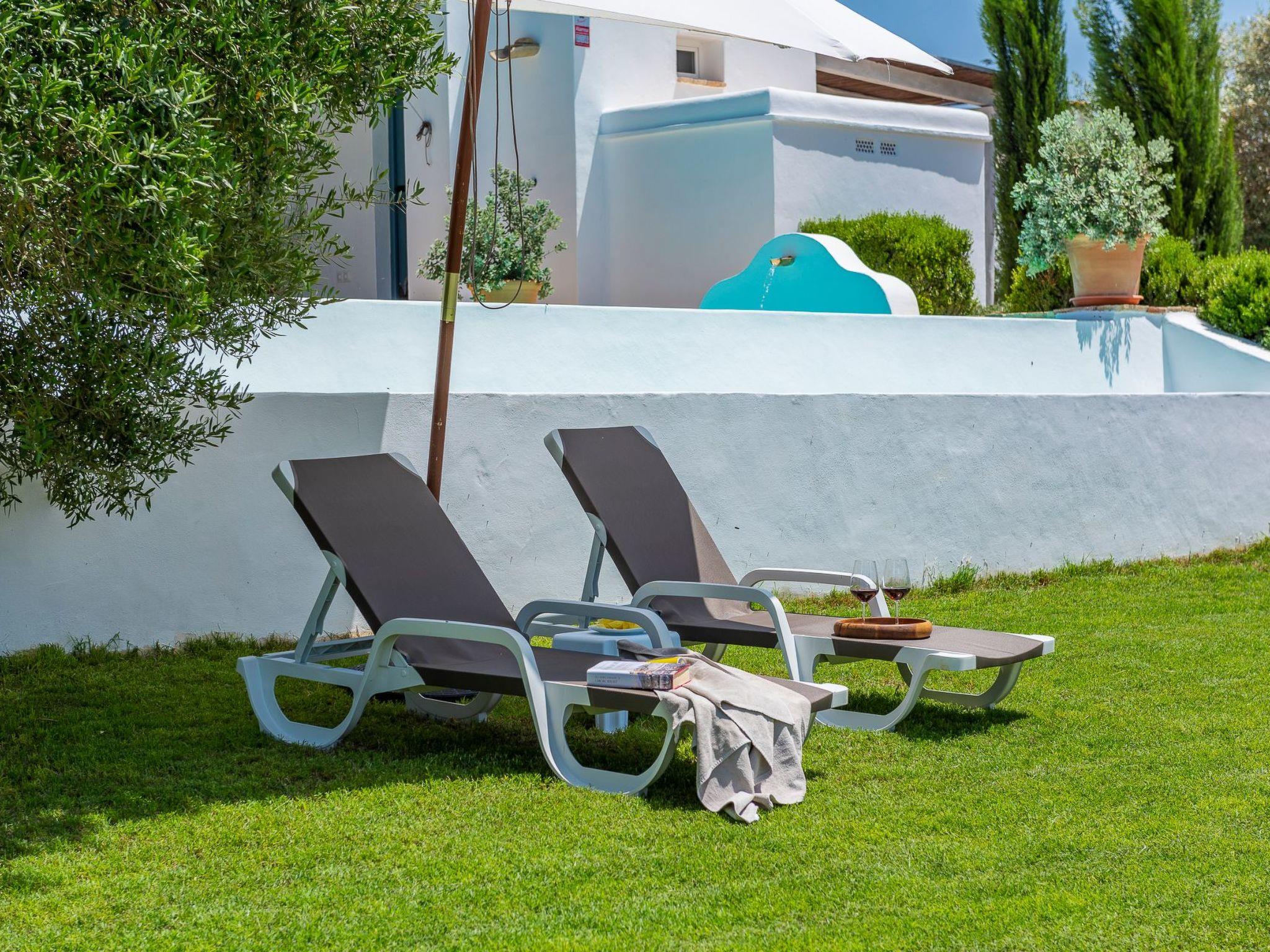 Eingangsveranda mit Frühstückstisch.8 x 3,5 m großes Schwimmbad mit einer Tiefe von 1,10 bis 1,80 m. Schwimmbadbad mit Waschmaschine.Liegewiese mit Liegestühlen.