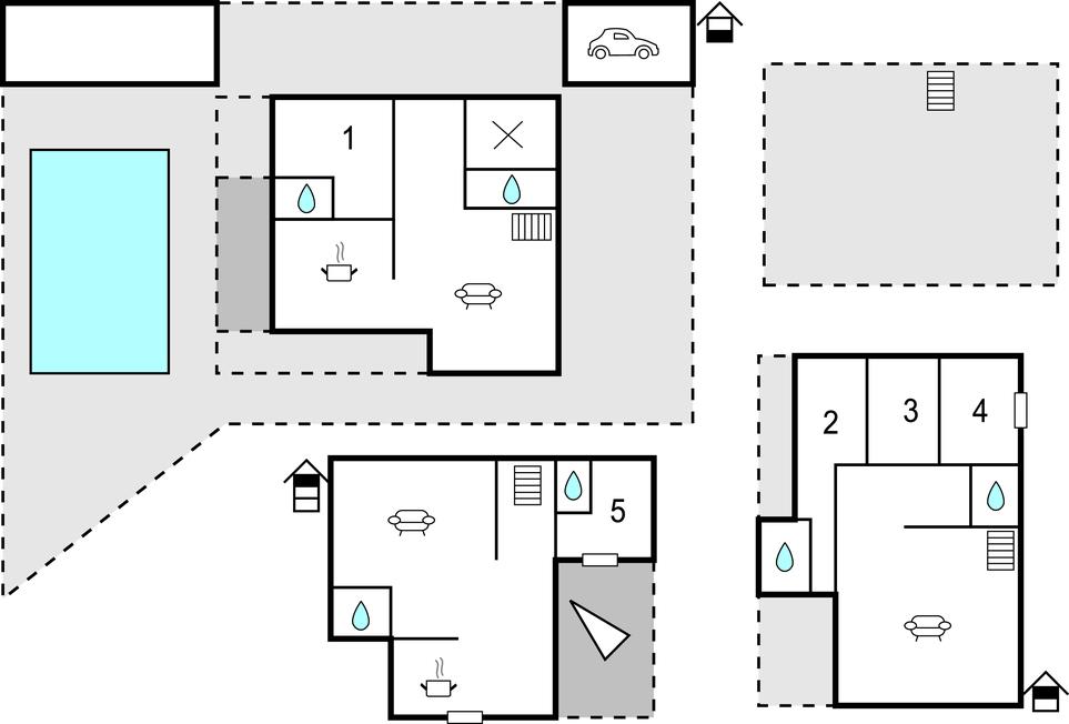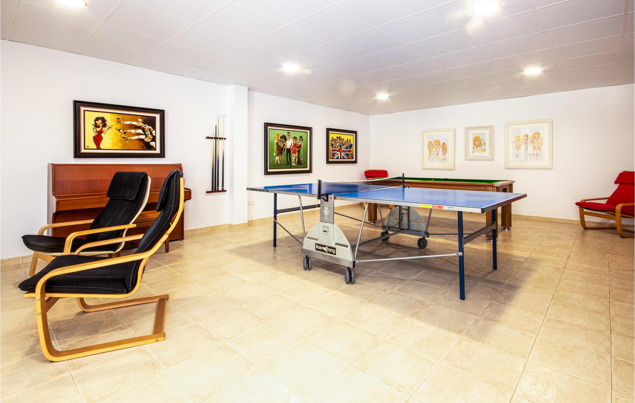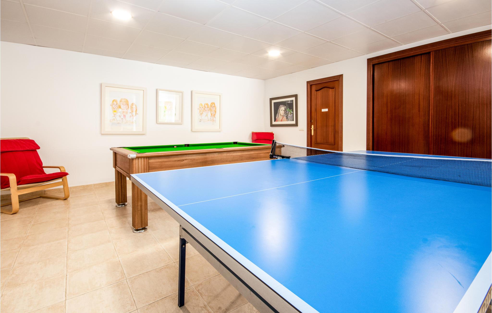 Das Anwesen ist über den Flur zugänglich, bis Sie das Wohnzimmer mit Fernseher und Kamin, eine offene Küche / Esszimmer, eine Gästetoilette und eines der 5 Doppelzimmer erreichen. Dieses Schlafzimmer ist mit einem Doppelbett, Zugang zur Terrasse und einem eigenen Bad ausgestattet. Im Erdgeschoss befindet sich ein Schlafzimmer mit zwei Einzelbetten und eigenes Bad mit Dusche, sowie direkter Zugang zur Hauptterrasse und zum Poolbereich. Ein geräumiges Wohnzimmer / Spielbereich mit Tischtennisplatte, Billardtisch, TV und Spielekonsole. Das Erdgeschoss hat auch einen Küchenbereich und ein Badezimmer mit 3 Duschen. Von hier aus haben Sie direkten Zugang zur überdachten Terrasse, den offenen Terrassen und dem Poolbereich.