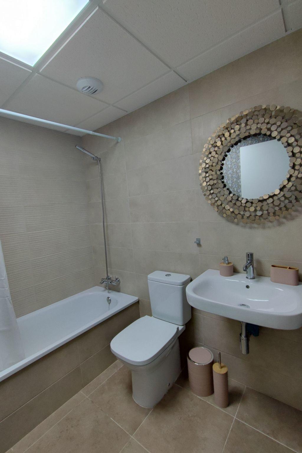 Die Wohnung hat einen Außenbereich von 60m2 von einer Veranda mit Garten und eine große Eckterrasse mit Blick auf die Berge und teilweise Blick auf den Strand gebildet. Da es sich um eine Ecke handelt, haben wir ein sehr angenehmes Gefühl von Temperatur und Frische, sowie ein Gefühl der Privatsphäre. Auf dieser Terrasse gibt es einen kleinen Garten, eine Chill-out-Zone mit Holz und eine Bank in einer Ecke.